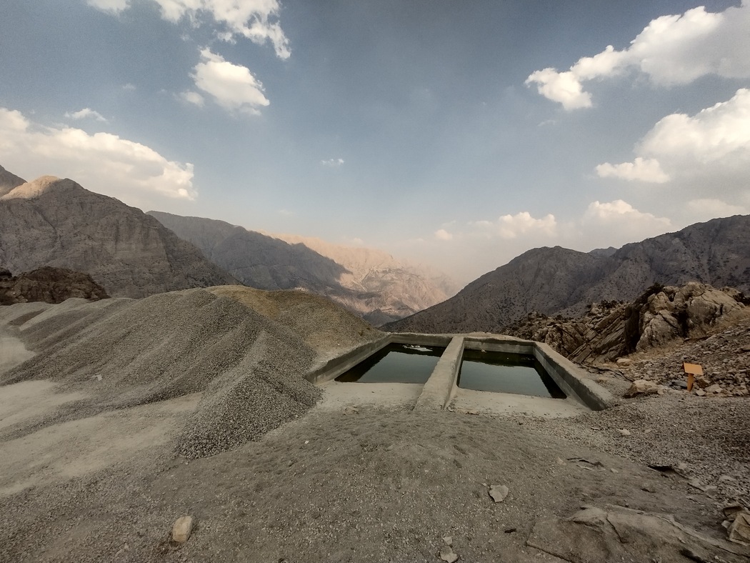 Nachdem wir den imposanten Daryan Damm passiert hatten fanden wir doch noch ein Fleckchen Schatten am Rande einer Felswand, wo es allerdings merklich nach Urin roch und wir nicht die Nacht verbringen wollten. Aber auch wir waren inzwischen hart im Nehmen, legten unsere Greenscreen aber dennoch möglichst weit weg von der Mauer an den Rande des Schattens. Dies hatte natürlich zur Folge, dass wir nicht lange im Schatten blieben und machten uns daher bald an den nächsten Aufstieg mit der Absicht sobald wir im nächsten Ort Wasser getankt hatten den nächst besten Platz für unser Zelt in einer Serpentine zu nutzen.