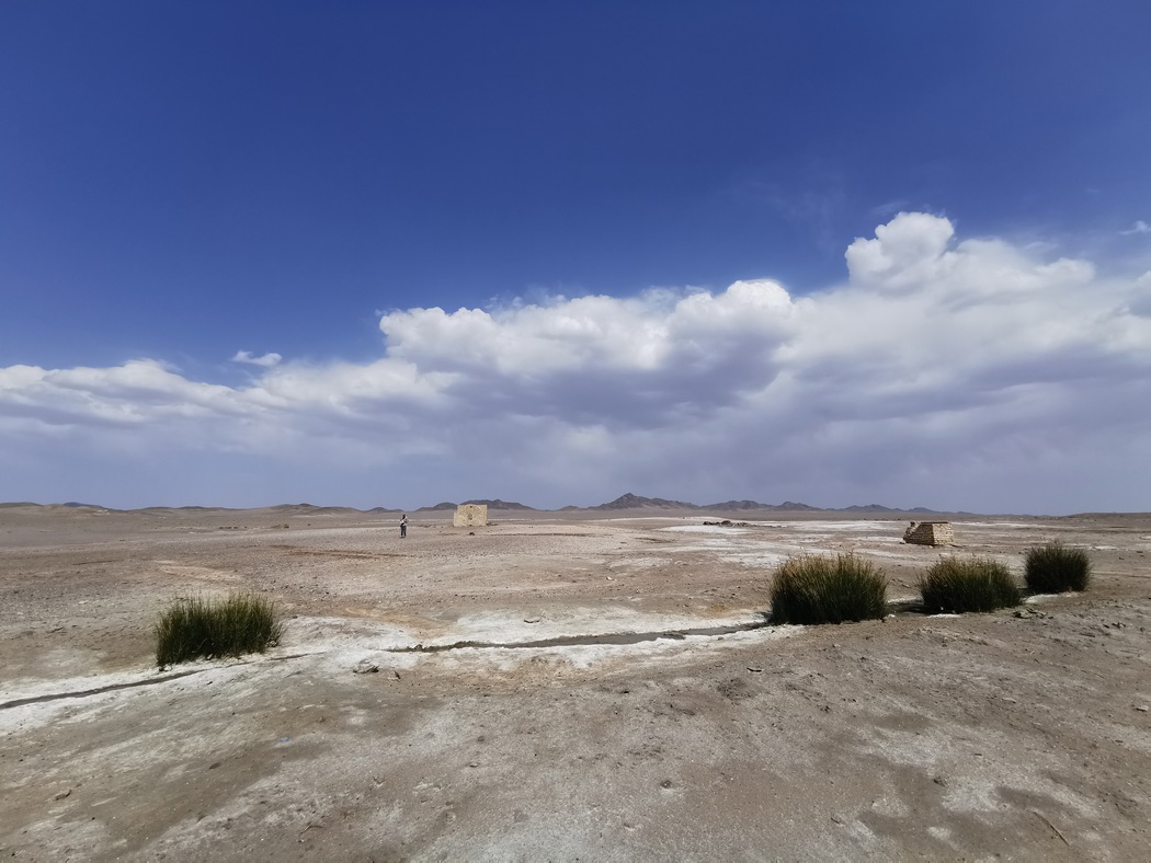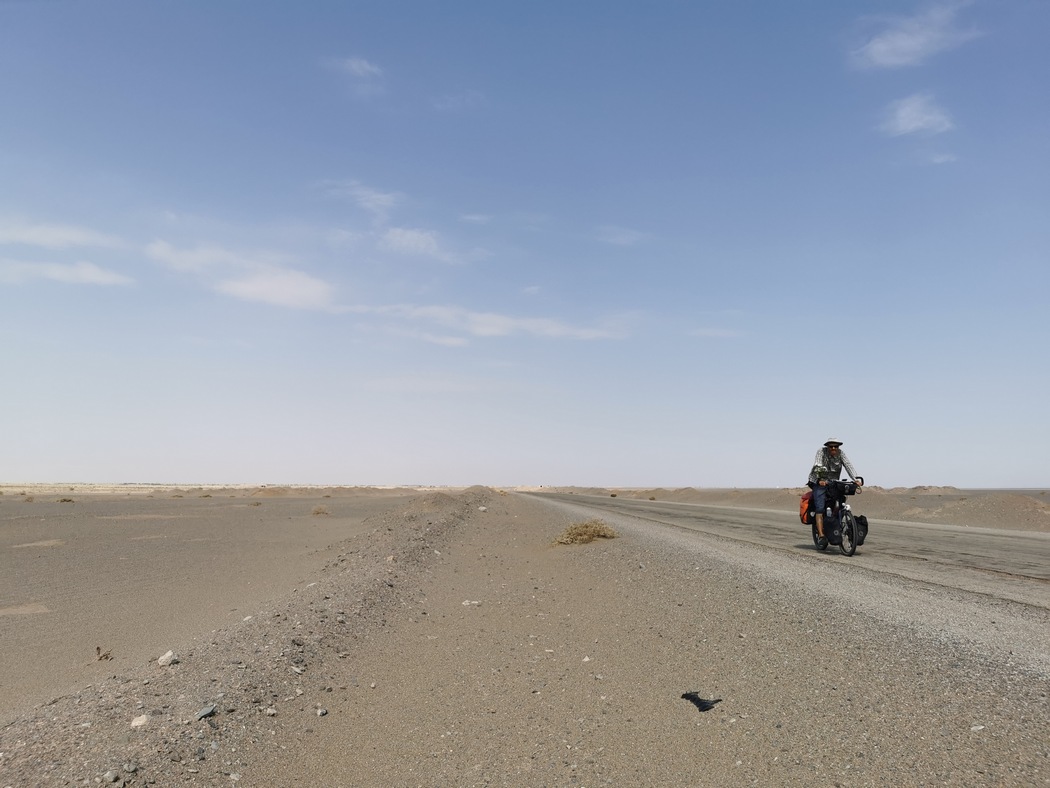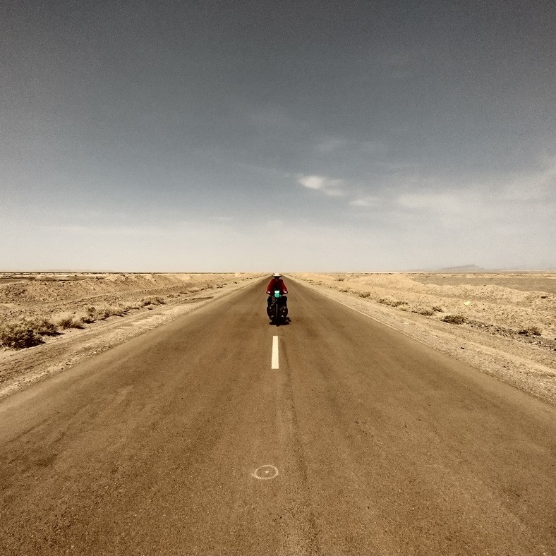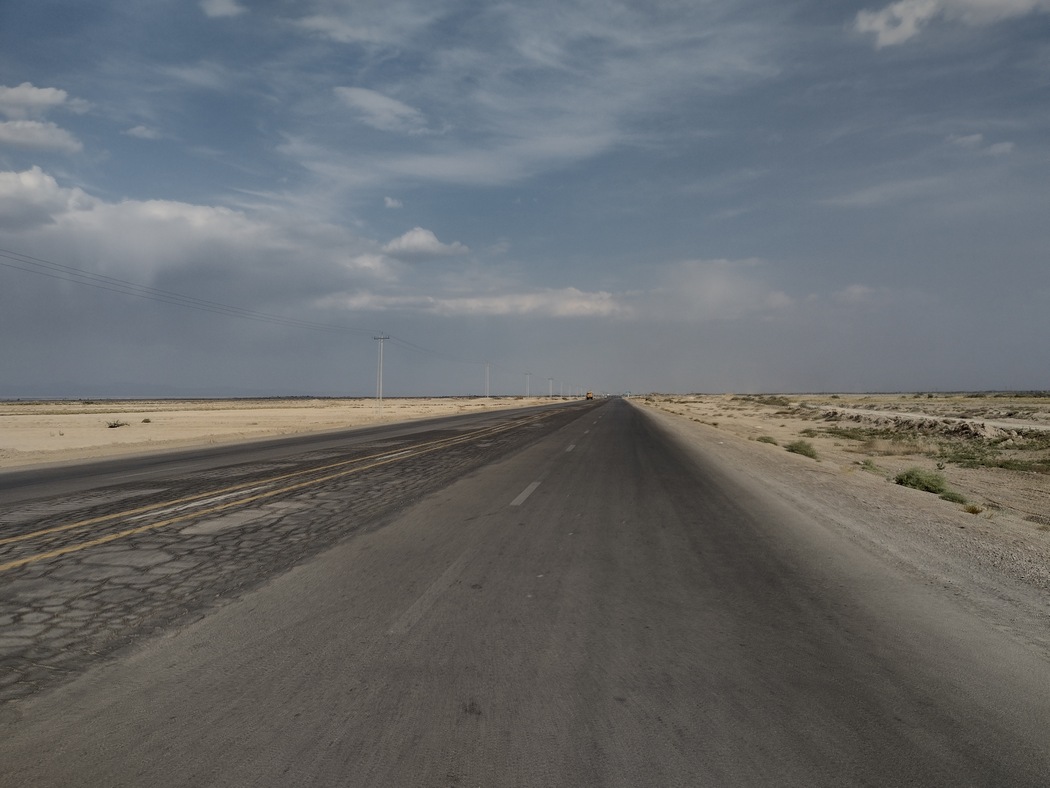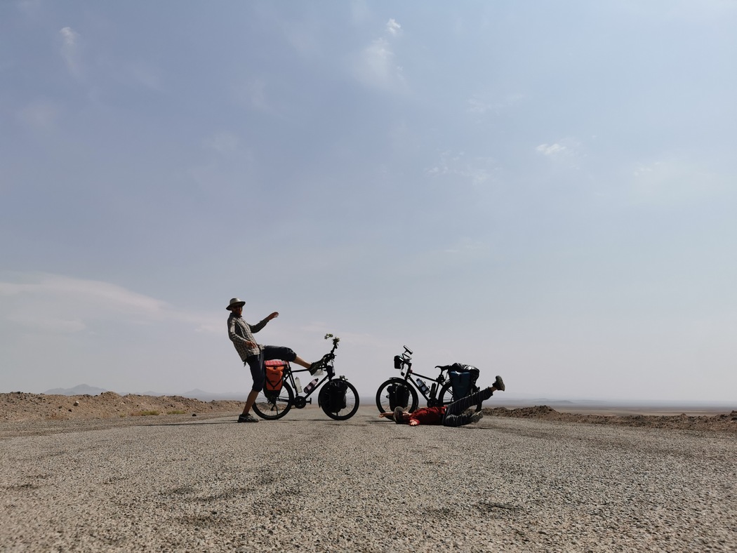 Für uns sollte es jetzt so richtig in die Wüste gehen. Kurz nach Varzaneh fing die von uns ausgewählte Straße an und ab da an waren wir zwei Tage wirklich sehr einsam. Weit und breit keine Siedlung und kein Mensch und stundenlang kein Auto in Sicht. Wir radelten in die unendliche Weite hinein, endlich war es einmal so, wie es sich jeder Radreisende erträumt. Plötzlich sagte Tilmann: „Bleib mal stehen und sei ganz leise.“ Und tatsächlich, da noch nicht einmal ein Windzug ging, hörte man einfach gar nichts. Selten hatten wir unter freiem Himmel einen Moment erlebt, der so nah an absolute Stille heranreichte. Man hätte wohl die sprichwörtliche Stecknadel fallen hören können, wir hatten aber keine zur Hand.