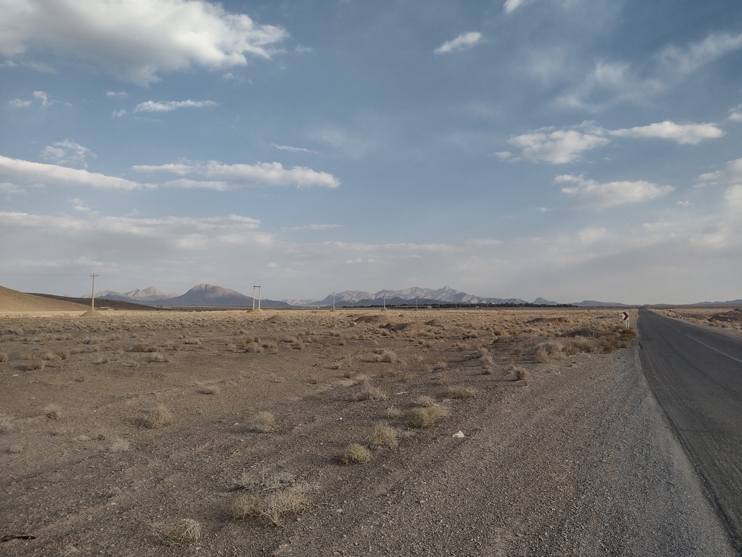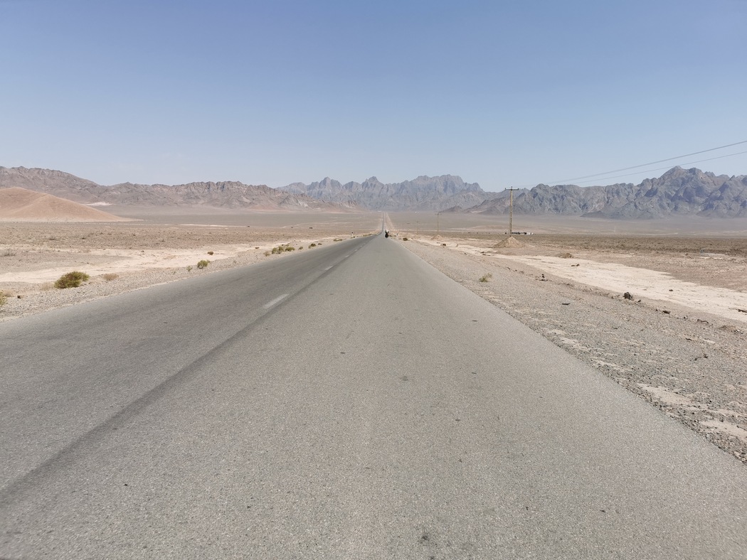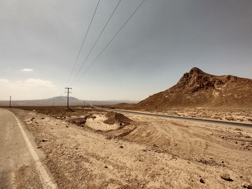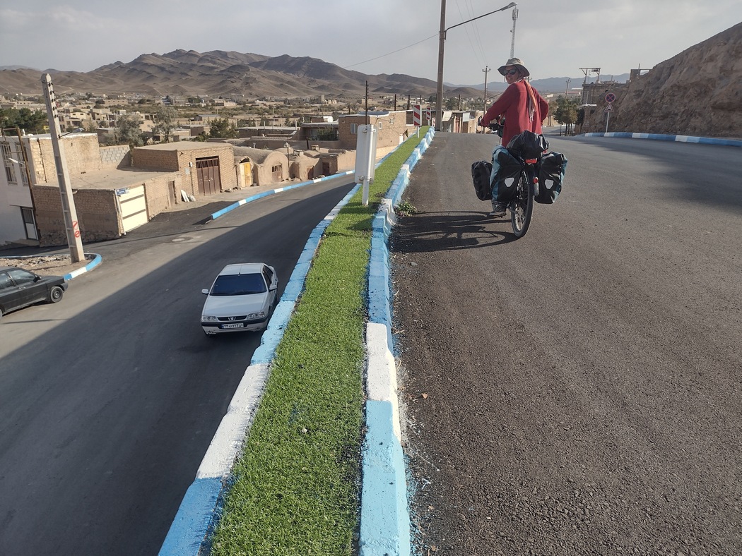Als wir die Stadt verließen, radelten wir auf nur wenig befahrenen Straßen und kamen auf dem größtenteils leicht abfallenden Gelände in Richtung Osten zügig voran. Da wir noch einen Abstecher in die Wüste machen wollten, nahmen wir nicht den direkten Weg nach Shiraz, sondern fuhren in Richtung Yazd. Gegen Nachmittag wandelte sich die Landschaft und die ersten wüstenähnlichen Flächen waren zu erblicken. Auch die Architektur erinnerte mittlerweile an Mos Eisley, hinter der nächsten Kurve hätte auch die Cantinaband aufspielen können. Die Lebewesen hier hatten jedoch weiterhin 2 Beine, 2 Arme und einen Kopf, hielten sich allerdings im Gegensatz zu ihren Landsmännern aus dem Nordwesten zurück und verwechselten fahrradfahrende Touristen nicht mit Selfie-Dummys.