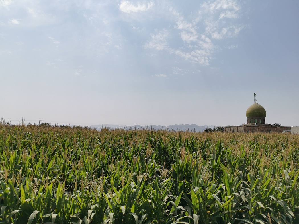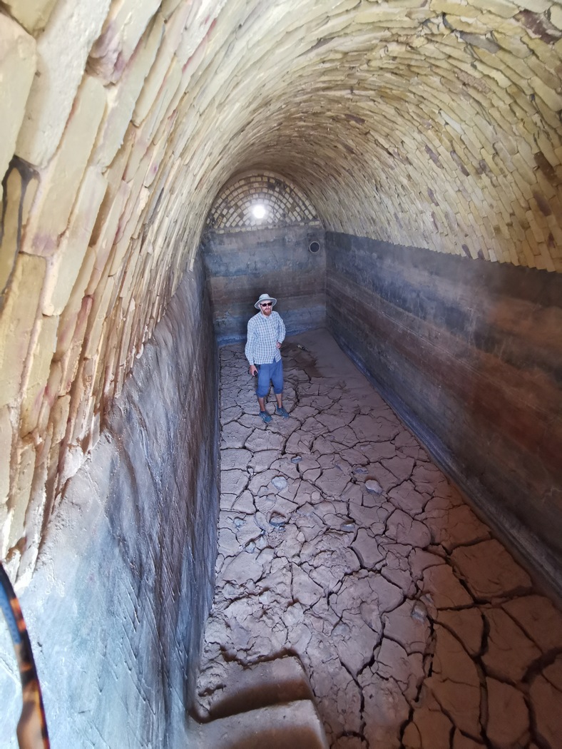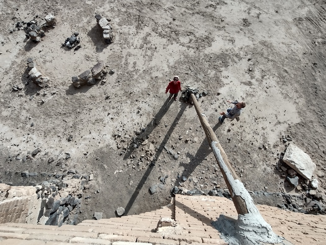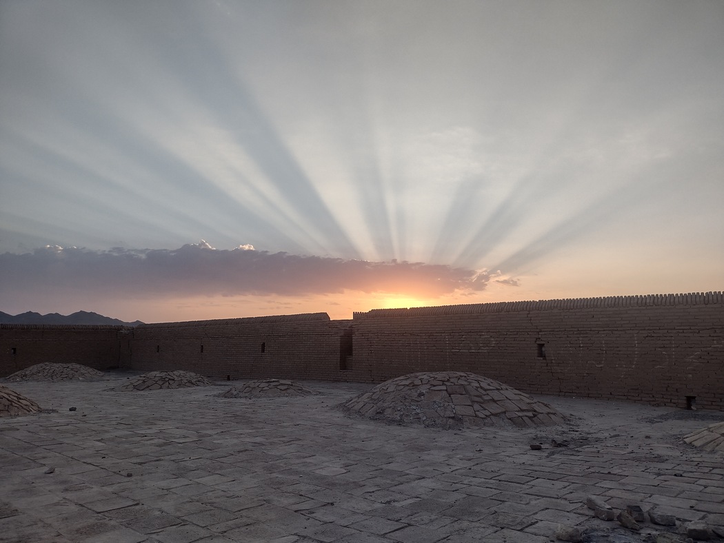 Danach war wieder heiter Sonnenschein und wir machten eine ausgiebige Fotosession an diesem besonderen Ort, über den wir leider nicht viel wissen, nur das dies angeblich ein Haltepunkt auf der Seidenstraße war. Das Gebäude wirkte tatsächlich zum Teil sehr alt, an anderer Stelle war das Gemäuer aber aus jüngerer Zeit. Außerdem wollte jemand den Verfall mit einfachen Mitteln verhindern und hatte von innen einige Stützpfeiler gegen die Außenmauern gestemmt. Zahlreiche Kammern und Gänge umrahmten den riesigen quadratischen Innenhof, in dessen Mitte sich ein Brunnen mit klarem Wasser (unter einer Staubschicht auf der Wasseroberfläche) befand, das wir zum Waschen nutzten.