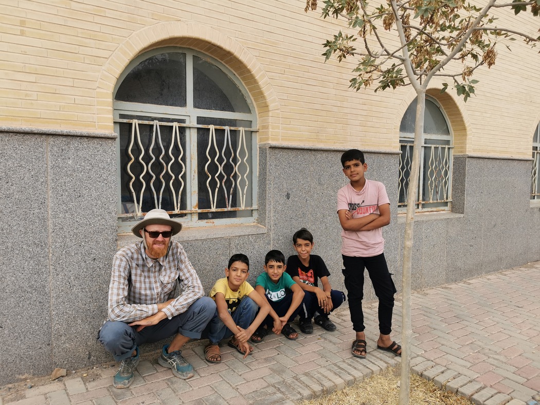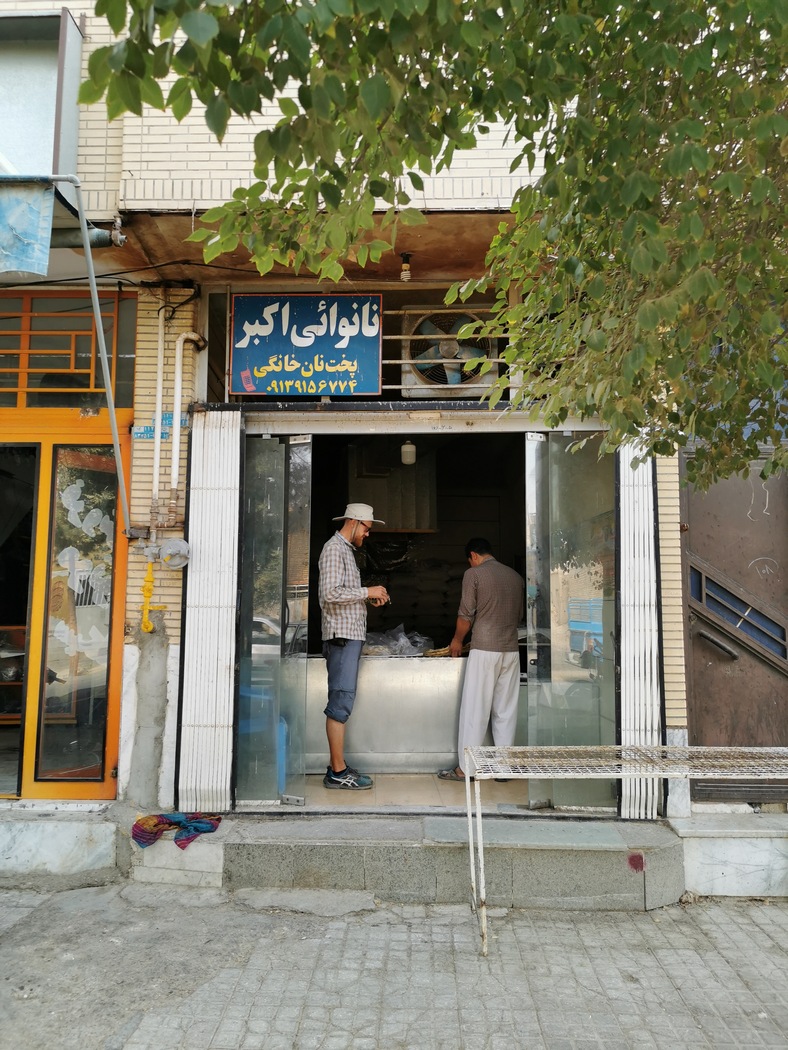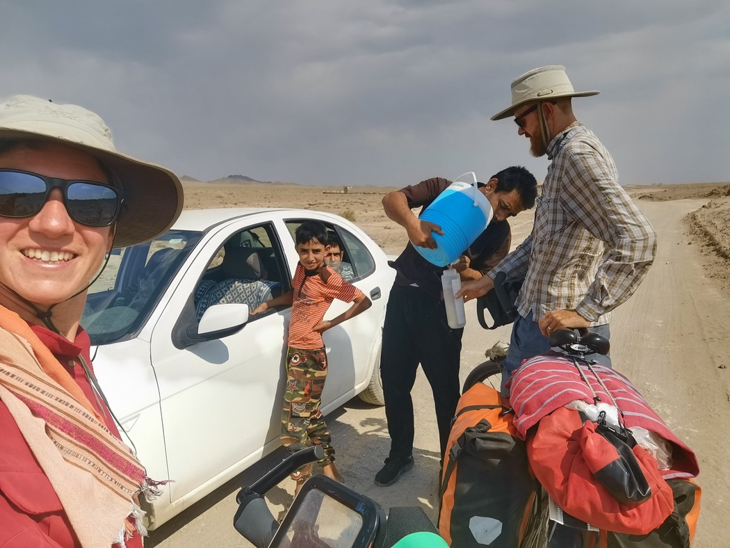 Nachdem wir eine unendlich wirkende Ebene durchquert hatten, kamen wir im Wüstendorf (das sich bei näherer Betrachtung wie so viele iranische Siedlungen als gar nicht mal so klein herausstellte) Nadushan mit überwiegend flachen Lehmbauten an. Wir fragten nach Wasser und wurden direkt wieder zum Cay eingeladen. Diesmal nahmen wir an, da wir uns gerade eh nach einer Pause sehnten. Die einfache Behausung, in die man uns führte bestand aus Küche, Wohnzimmer, Bad und Toilette und alle Räume führten in einen Innenhof mit Granatapfelbaum und Feuerstelle für die Brotzubereitung. Dort wurden wir auf einem Teppich platziert und mit allerlei Obst beglückt. Besonders köstlich waren Mini-Feigen, die wir vorher noch nie gesehen hatten. Dass wir einen Innereien-Eintopf ablehnten schien für die Anwesenden in Ordnung und sie fragten interessiert, ob denn jeder in Deutschland vegetarisch esse, was wir leider verneinen mussten. Auch neu für uns war die Sitte das Brot (diesmal zum Glück nicht die ungeliebte Noppenfolie, sondern selbstgebacken auf der Feuerstelle) zur Aufbewahrung einfach in die auf dem Boden ausgebreitete Plastik-Tischdecke einzuwickeln.