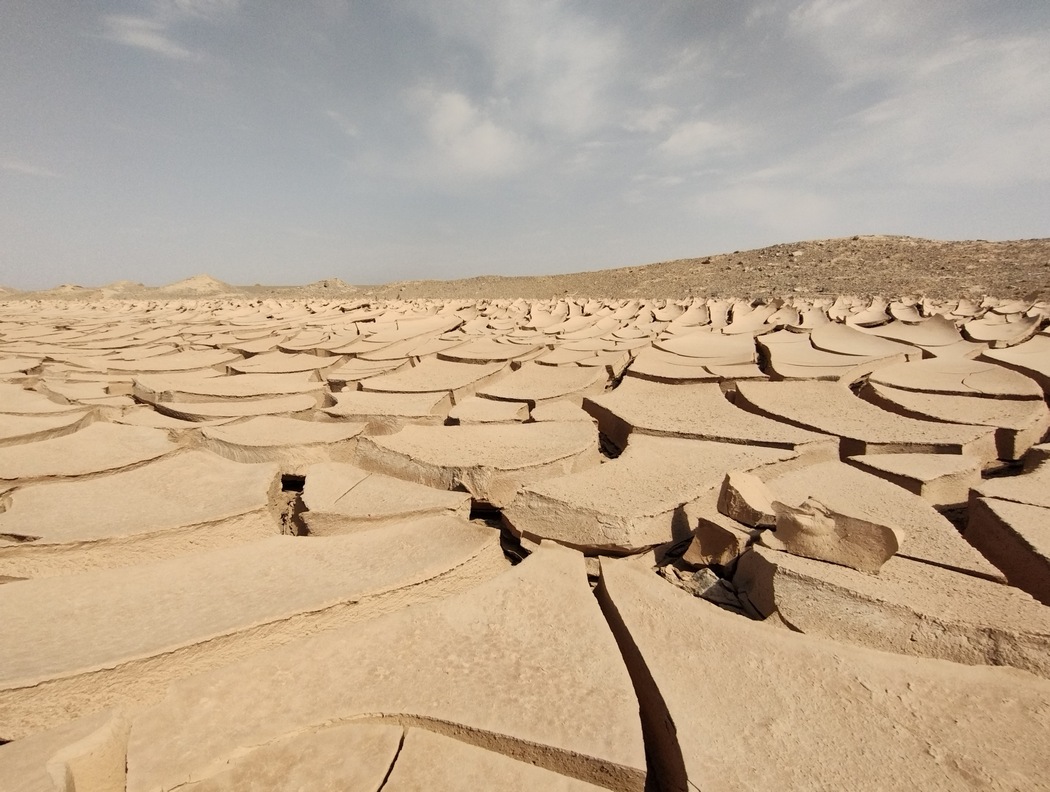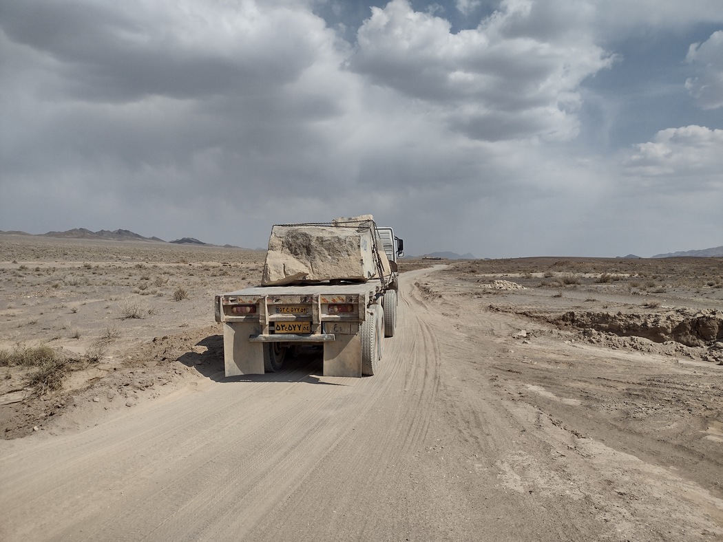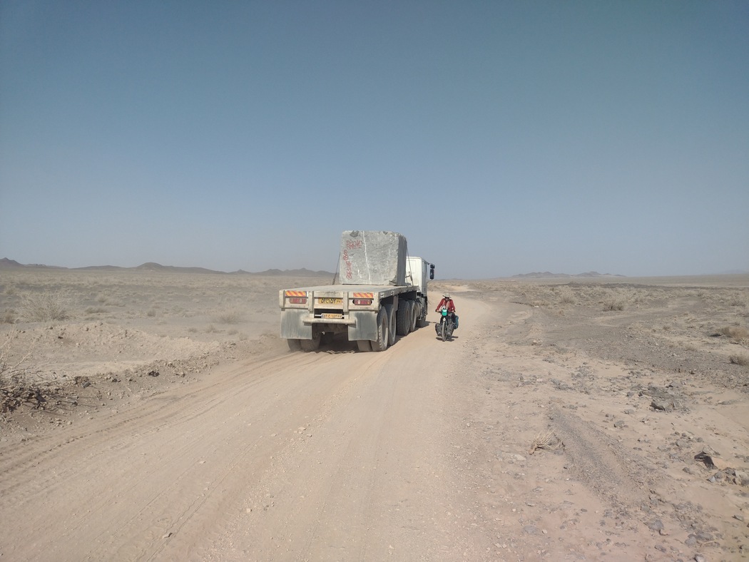 Doch nicht nur Stille und Einsamkeit beeindruckten, auch das wüste Land wusste zu überzeugen. Wir konnten in unendliche Fernen blicken, trotzdem war die Landschaft sehr abwechslungsreich. Sandboden wechselte sich mit Salzpfannen ab und getrocknete aufgerissenen Bodenplatten hatten bizarre Formen angenommen. Wir fanden auch leere Wasserspeicher und ein volles Wasserloch, das allerdings nur mit Salzwasser gefüllt war. Irgendwann ragte ein Berg aus schwarzem Gestein in den endlosen Himmel, der innerhalb der hellen Wüste wie ein Fremdkörper wirkte. Bald türmten sich in der Ferne auch wieder hohe schroffe Berge auf. Tatsächlich kreuzte an diesem Tag nur ein blauer Pickup, zwei Lkws mit jeweils einem Felsbrocken geladen und ein weißer Saipa unseren Weg. Letzterer ließ uns erst nach dem obligatorischen Foto weiter fahren, was wir nutzen, um ihn um Wasser anzuschnorren und diese Szenerie ebenfalls zu fotografieren.