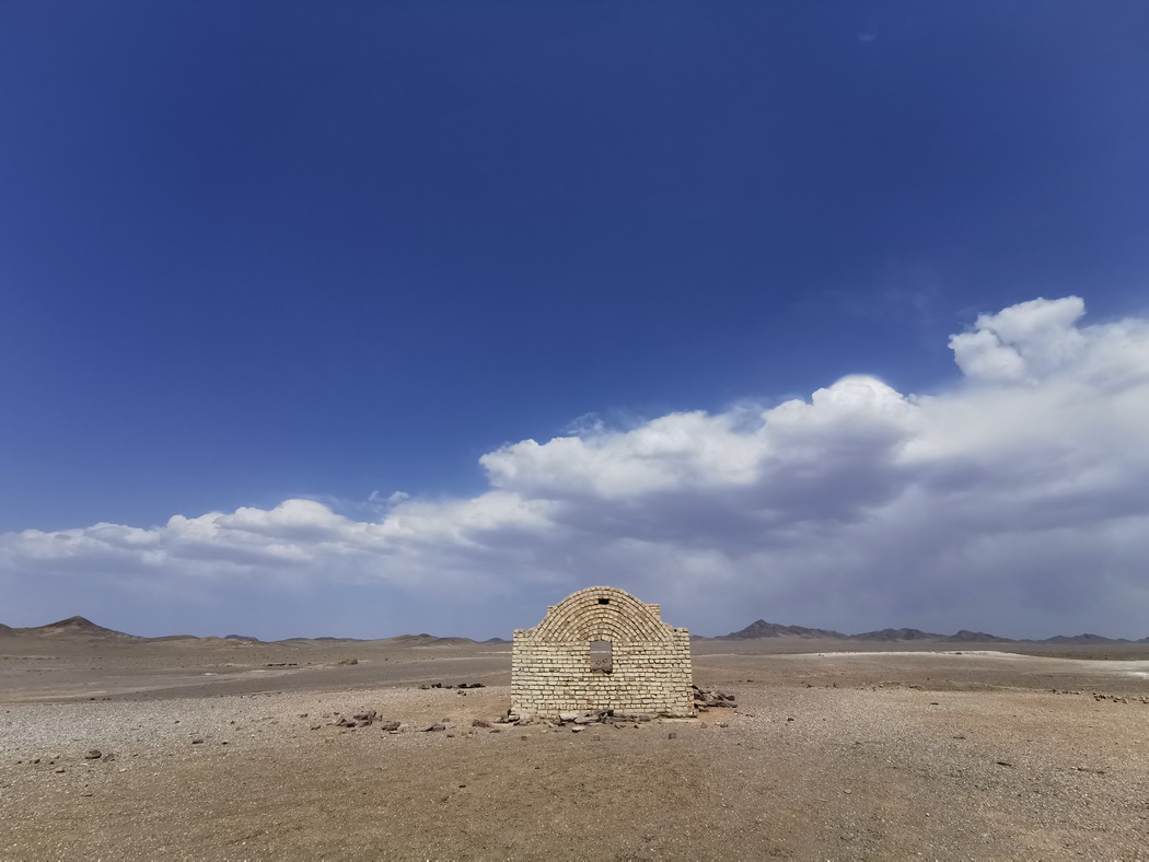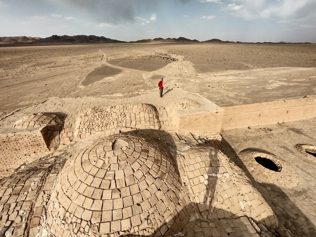 Unser Ziel für heute war eine alte ungenutzte Karawanserei mitten in der Wüste, die wir bereits um ca. 14:00 Uhr nach etwa 60 km erreicht hatten, kurz nachdem wir von der Provinz Isfahan in die Provinz Yazd vorgedrungen waren. Wir entdecken sie, als wir uns gerade auf einem sandigen Abschnitt um eine Düne herum kämpfte. Der Anblick war wie aus dem Bilderbuch, hinter den alten Mauern türmen sich Gewitterwolken und ein kleiner Wirbelsturm – von denen wir nun täglich 3 sahen – wirbelte den Sand in den letzten Sonnenstrahlen auf. Nachdem wir das Gebäude erkundet hatten und uns darin niederließen, fegte auch noch ein kleiner Sandsturm über uns hinweg, verdunkelt kurz den Himmel und wir waren froh durch 3 Mauern und ein Dach geschützt zu sein.