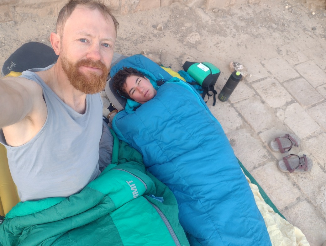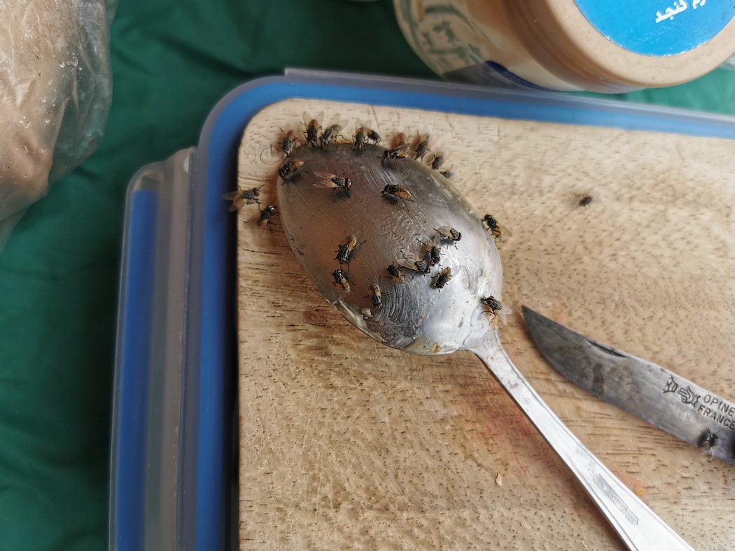 Wir verbrachten hier einen komplett von Menschen ungestörten Nachmittag, wurden allerdings massiv von einer Fliegenplage belästigt, die uns fortlaufend kitzelten und mit denen wir den Honig vom Bee-Boss teilen mussten. Zum Glück gehen Fliegen pünktlich ins Bett, sobald die Dunkelheit hereinbricht, was mittlerweile um 18 Uhr der Fall war. Dazu trug nicht nur der erreichte Längen- und Breitengrad sondern auch eine Zeitumstellung bei, von der wir erst Tage später, nach einigen Abendenden der Verwunderung, erfuhren. Sie hatte wohl stattgefunden als wir in Isfahan waren. Datum, Wochentage und Uhrzeit sind für uns einfach nicht mehr von großer Bedeutung, nur noch, ob es gerade hell oder dunkel ist und ob die Sonne senkrecht steht oder einen Schattenwurf zulässt.