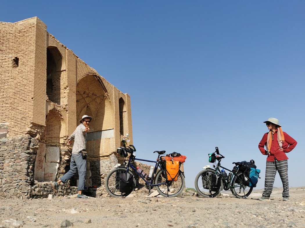 Die zwei Schweitzer hatten jedenfalls eine Nacht hinter sich, die ihnen in Erinnerung bleiben wird. Leider sollten sie nun noch mehr Zeit in der Karawanserei verbringen als ihnen lieb war. Beim Fahrrad des jungen Mannes hatte die Gangschaltung (Shimano Sora ST) versagt. An seinem nagelneuen Gravel-Bike waren jedoch alle Kabel so stilvoll verpackt, dass man selbst kaum handanlegen konnte. Da die beiden nur 2 Wochen durch den Iran radeln wollten, lief ihnen die Zeit nun weg. Wir konnten den beiden leider nicht helfen, ließen sie in der Karawanserei zurück und überliesen sie damit den gefährlichen Kojoten. Ihr Schicksal tat uns natürlich leid, doch als wir wieder auf unseren smp Sätteln saßen freuten wir uns auch ein bisschen, dass wir die perfekten Reiseräder haben, die uns (ein paar Platten ausgenommen) pannenfrei bis hierher getragen hatten. Komplexe moderne Komponenten wie die Sora ST sind für einen schnellen Service in Not offenkundig ungeeignet.