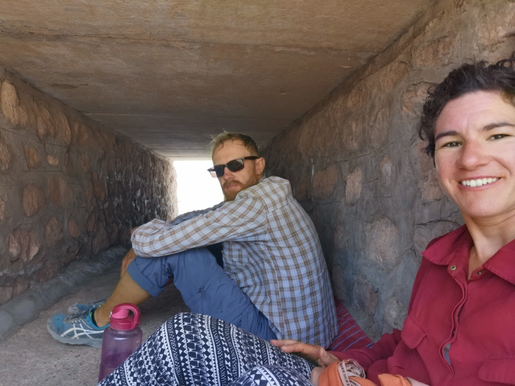 Auf der Suche nach einem Rastplatz mit Schatten war es dann endlich auch mal soweit, dass wir in ein Wasserrohr unter der Straße krochen. Selbst dort, irgendwo auf einer wenig befahrenen Straßen weit weg von Dörfern, entdeckte uns ein älterer Herr, der mit seinem Moped angeknattert kam und sich zu uns gesellte.
