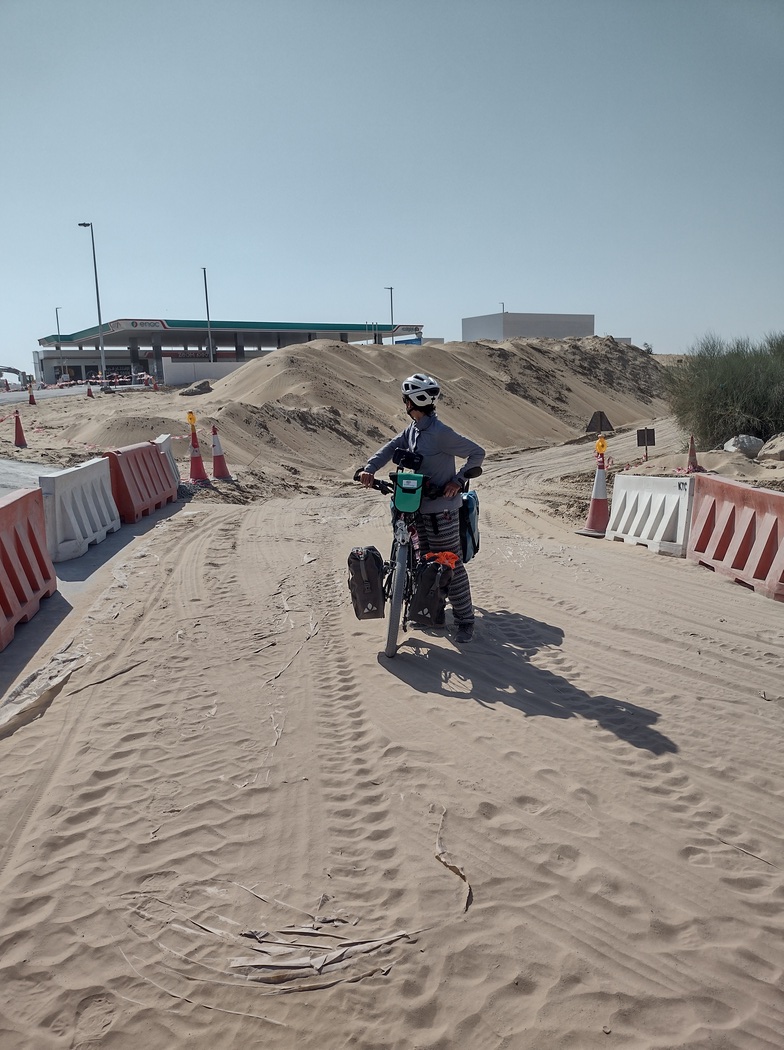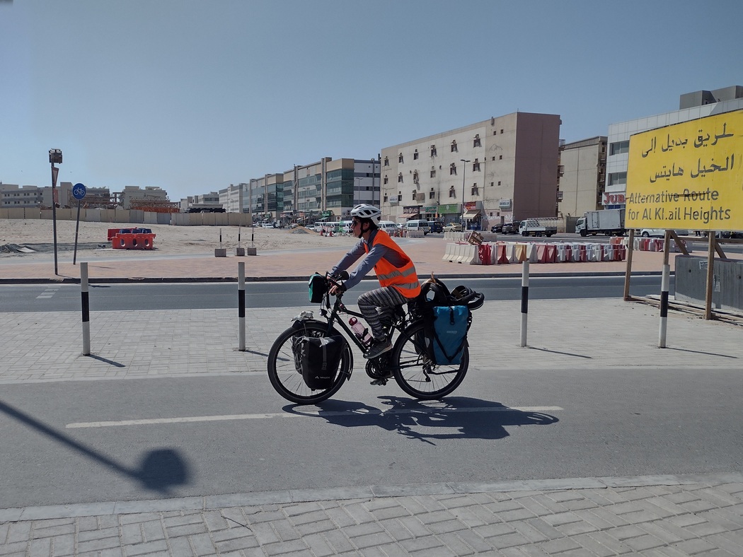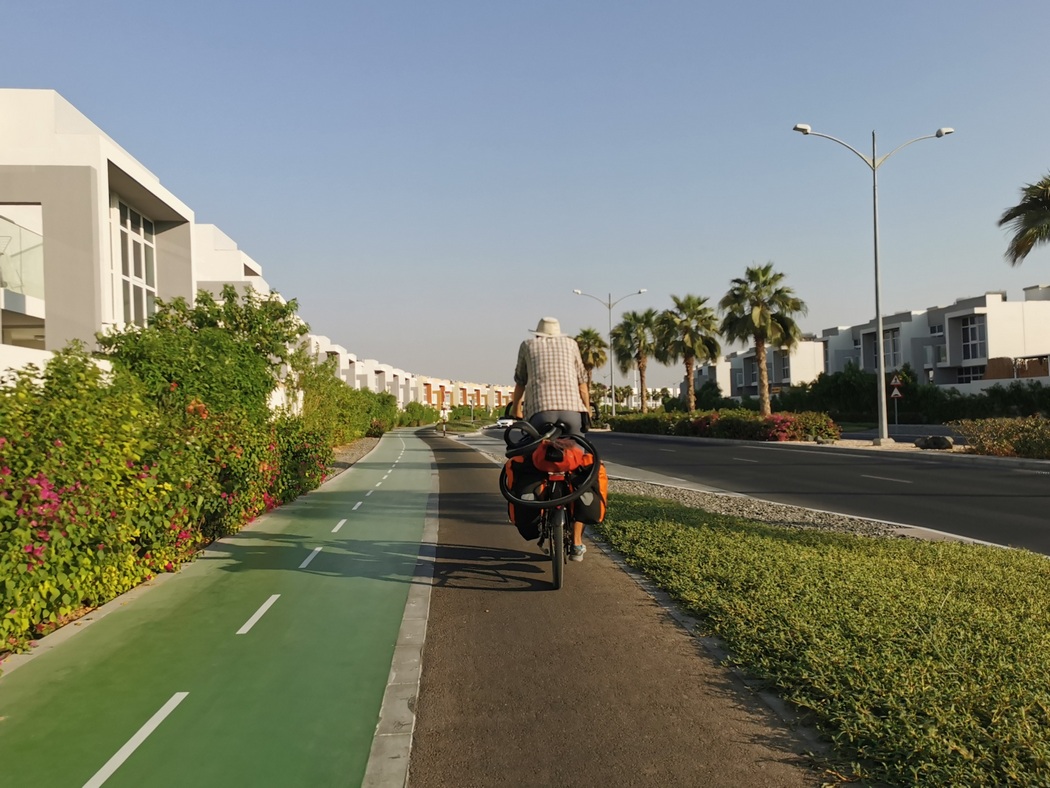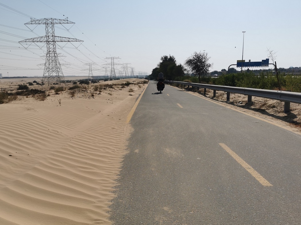Iris hatte uns berichtet, dass der Weg aus Dubai heraus die Hölle sei, was wir zunächst überhaupt nicht nachvollziehen konnten, denn wir fuhren zwar auf Highways, diese waren aber mit Standstreifen ausgerüstet und relativ leer. Dann begaben wir uns jedoch irgendwann auf das Nebenstraßennetz, wo die Katastrophe nicht lange auf sich warten ließ. Vor uns erstreckte sich eine Sandpiste und da uns der Weg zurück bzw. ein alternativer Weg zu umständlich erschien, machten wir uns daran diese zu durchqueren. Es war mühselig und schweißtreibend und für die geschätzten 700 m brauchten wir eine gute halbe Stunde. Kurze Zeit später fuhren wir für mehrere zehn Kilometer jedoch doch auf einem brandneuen Fahrradweg, den wir für uns alleine hatten und auf dem das zu Fuß gehen sogar verboten war.