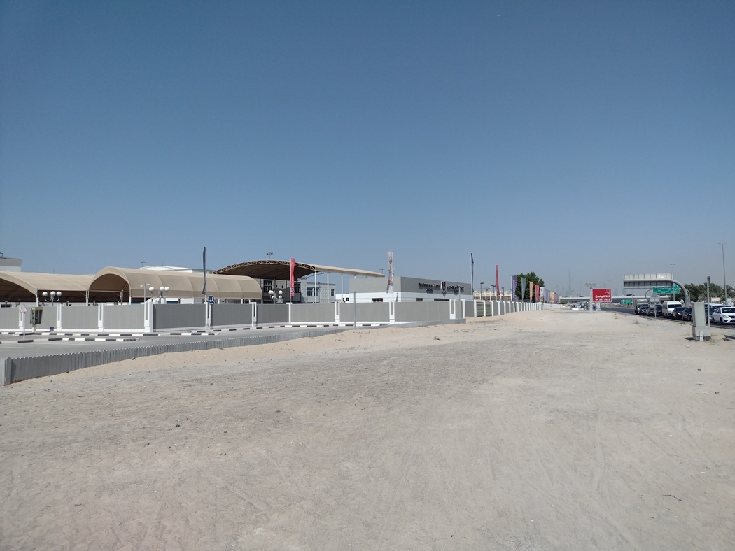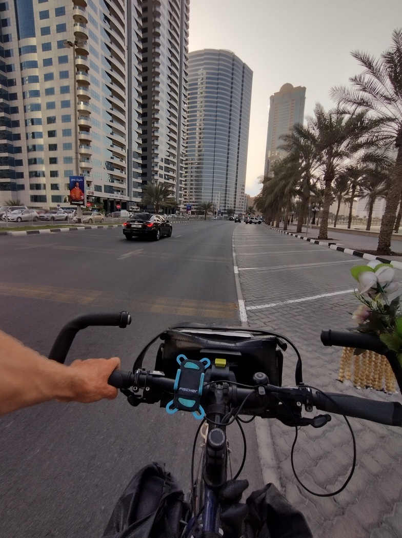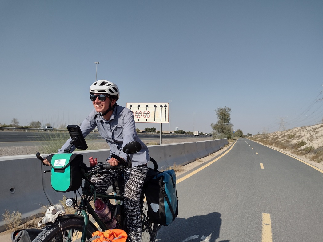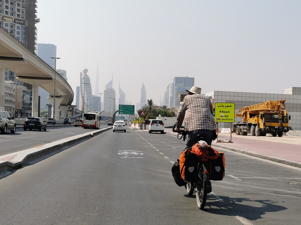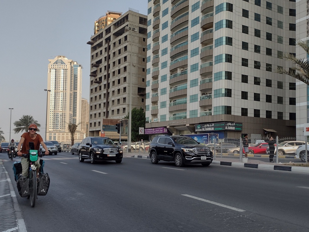 Iris hatte uns berichtet, dass der Weg aus Dubai heraus die Hölle sei, was wir zunächst überhaupt nicht nachvollziehen konnten, denn wir fuhren zwar auf Highways, diese waren aber mit Standstreifen ausgerüstet und relativ leer. Dann begaben wir uns jedoch irgendwann auf das Nebenstraßennetz, wo die Katastrophe nicht lange auf sich warten ließ. Vor uns erstreckte sich eine Sandpiste und da uns der Weg zurück bzw. ein alternativer Weg zu umständlich erschien, machten wir uns daran diese zu durchqueren. Es war mühselig und schweißtreibend und für die geschätzten 700 m brauchten wir eine gute halbe Stunde. Kurze Zeit später fuhren wir für mehrere zehn Kilometer jedoch doch auf einem brandneuen Fahrradweg, den wir für uns alleine hatten und auf dem das zu Fuß gehen sogar verboten war.