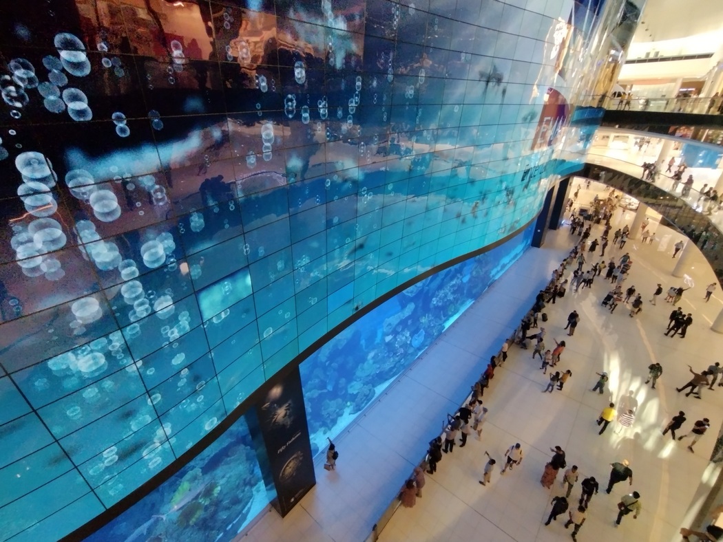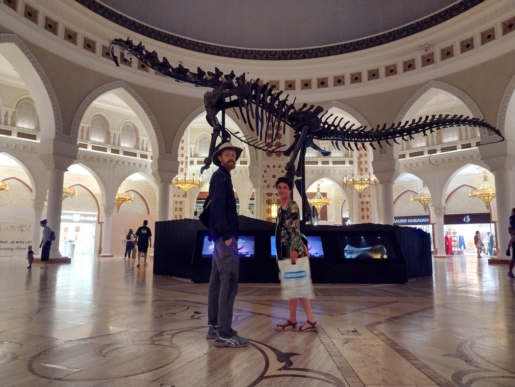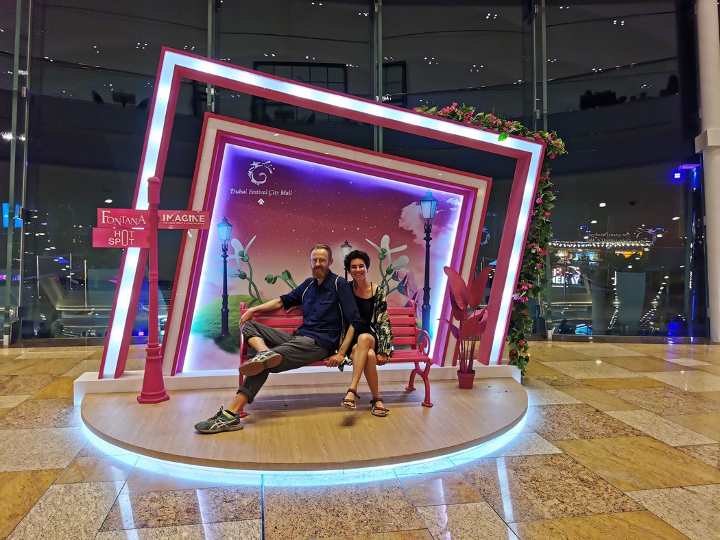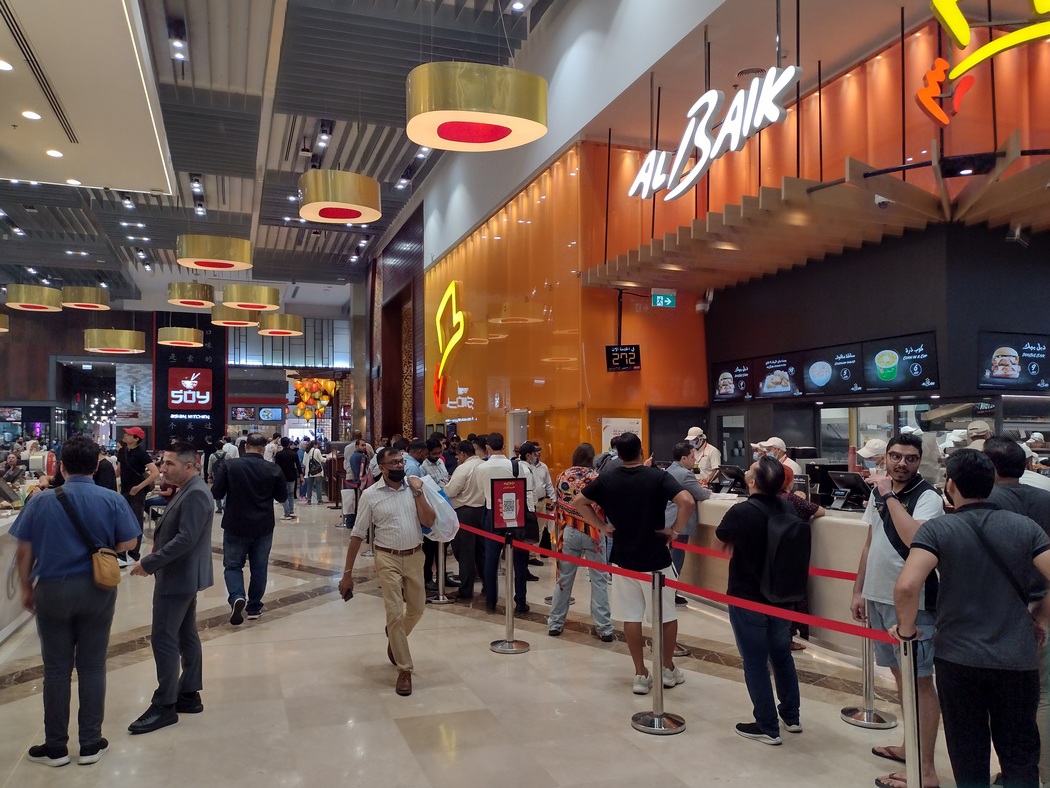Vieles mussten wir uns aufgrund der wirklich unvergleichbar hohen Preise vverkneifen. Das Essen in den Foodcourts in den Malls ist bspw. in etwa doppelt so teuer wie in Deutschland, ein Espresso hat in der ganzen Stadt den Einheitspreis von 15 Dirham, etwas mehr als 4 Euro. Nur in der Dubai Mall entdeckten wir das Fastfood-Restaurant „Al Baik“, das seine Snacks zu Preisen auf deutschem Niveau anbot, sodass sich davor endlose Schlangen bildeten, die mit entsprechend aufgestellten Geländern in der richtigen Ordnung gehalten wurden. Das wir drauf verzichten würden für knapp 50 € auf die Aussichtsplattform des höchsten Gebäudes der Welt zu fahren war uns relativ schnell klar. Fast schwach geworden wären wir allerdings bezüglich eines Besuchs im Atlantis Wasserpark für stolze 85 €! Das zogen wir nur in Betracht, da wir noch Kirmesgeld von Julias Eltern auf der hohen Kante hatten, das eigentlich für Tilmanns nicht angetretene Ballonfahrt in Kappadokien vorgesehen war. Schon waren wir im Begriff die Tickets zu buchen, als wir feststellten, dass das Schließfach für 20 € nicht im Preis inbegriffen war und auch keine eigenen Speisen und Getränke mitgeführt werden durften.