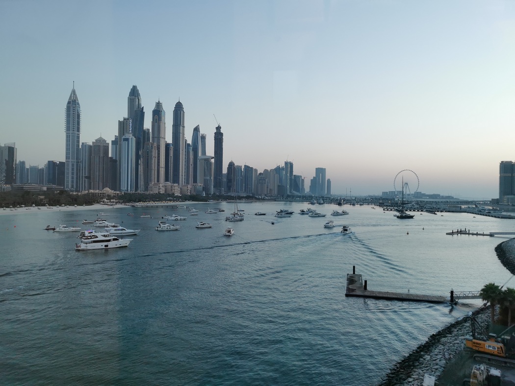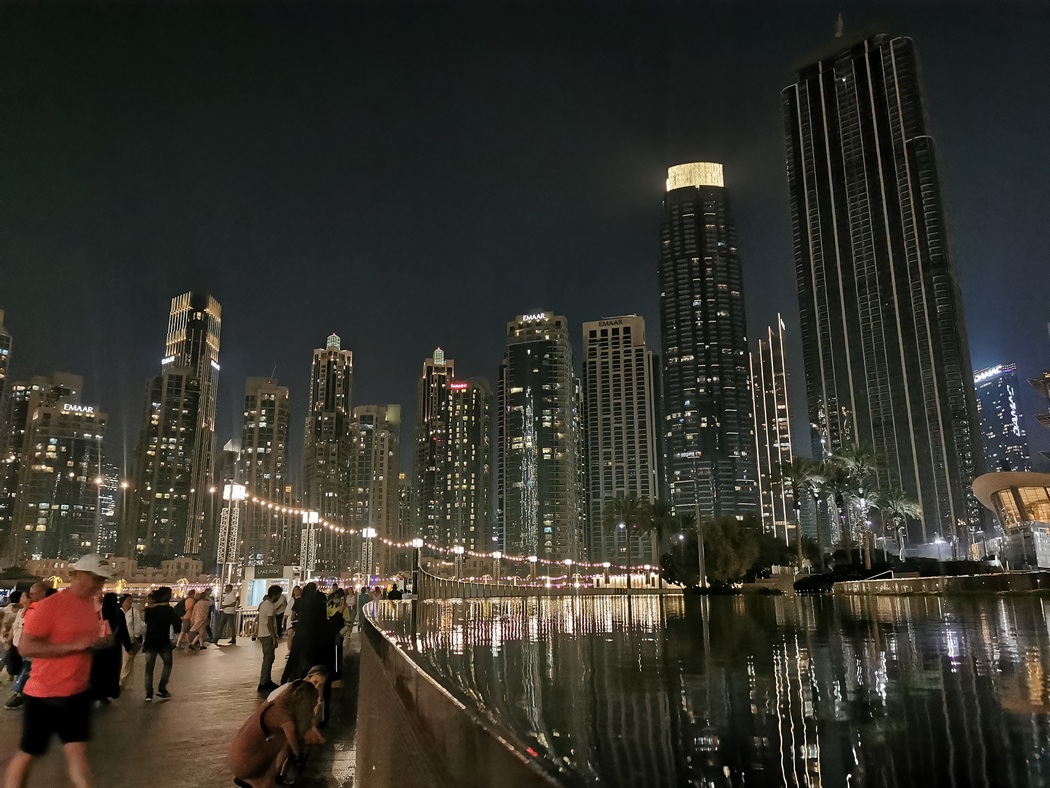 Hinter Schardscha rollten wir nun langsam auf Dubai zu und endlich zeichnete sich im Dunst der staubgeschwängerten Wüstenluft über der Stadt eine dünne Linie ab, die nahezu endlos dem Himmel zustrebte: Wir erblickten schon aus großer Ferne den Burj Kalifa, das höchste Bauwerk der Menschheitsgeschichte. Während wir uns weiter auch auf die ansonsten beeindruckende Skyline zubewegten, mussten wir uns schon relativ bald von Lars und Moritz verabschieden, die sich, ein wenig über den von uns gewählten kostspieligen Luxus lustig machend, nördlich von Dubai-Downtown ein Airbnb gesichert hatten, das sich allerdings auch als relativ schäbig herausstellen sollte.