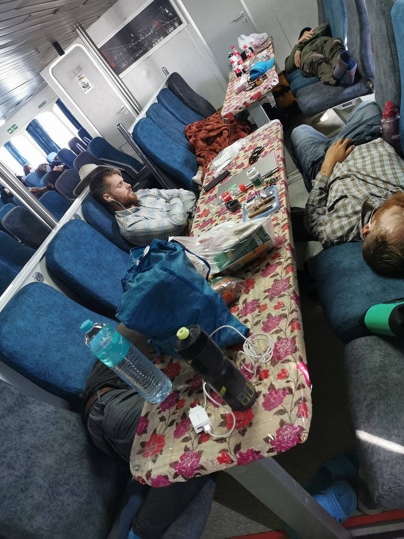 Das Einreise-Prozedere wirkte vollkommen planlos, wobei zunächst erst einmal gar nichts passierte. Dann wurden wir Radreisenden aufgefordert nach einer ersten Passkontrolle den Raum zu wechseln. Da Lars und Tilmann als letzte durch diese hindurch kamen, wurden sie nicht informiert, dass sie ihre Räder nun von draußen selbst hereinholen sollten. Offenbar war man der Meinung, das würde sich unter den Radfahrer:innen schon herumsprechen, obwohl die anderen sieben schon eifrig damit beschäftigt waren ihre Taschen durch den Röntgen-Scanner hindurch zu schicken.