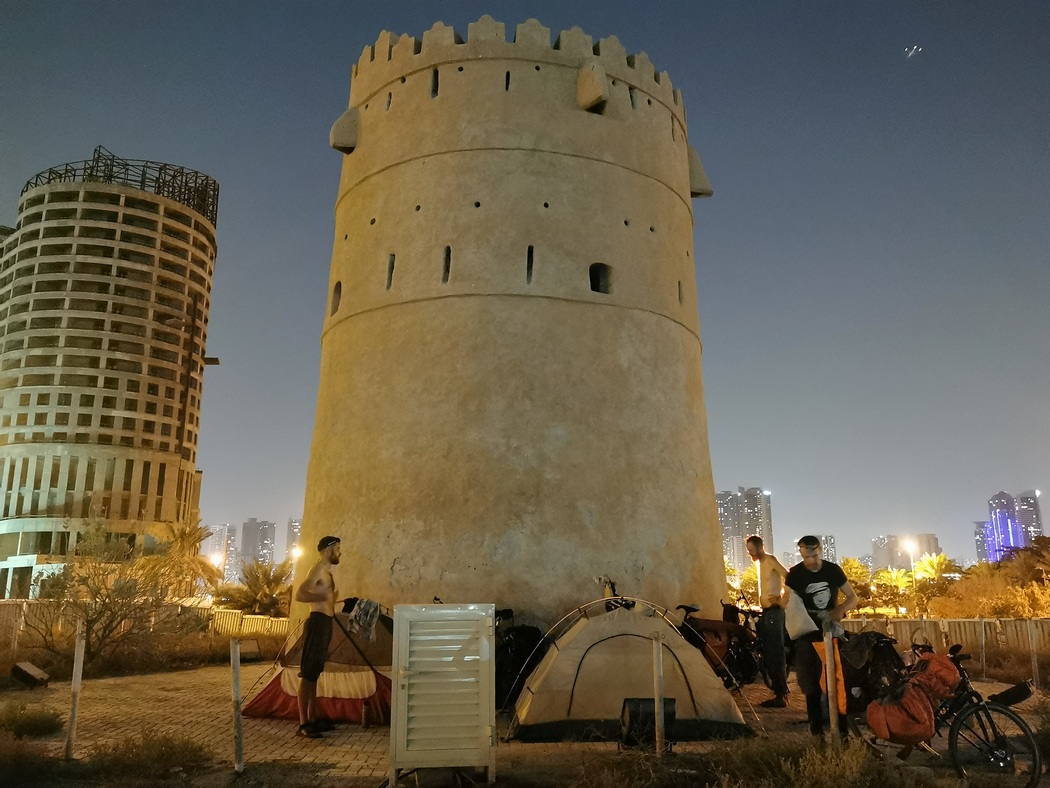 Jedenfalls konnten wir alle ungehindert einreisen und durften uns etwa eine Stunde nach der Landung wieder frei bewegen. Wir hatten bis zu unserem Hotel in Dubai noch einen Weg von etwa 30 km vor uns und da wir das Hotel voll ausnutzen wollten, hatten wir es erst ab dem nächsten Tag gebucht. Daher suchten wir nun zusammen mit Lars und Moritz einen Zeltplatz für die erste Nacht. Schnell wurde der mit der Grenzüberquerung einhergehende Systemwechsel weiter deutlich. Wir erreichten bald ein erstes Wohnviertel, in dem leicht bekleidete Russinnen und Russen unterwegs waren. Wir stoppten in einem indischen Supermarkt und waren froh endlich wieder Geschäftsmodelle vorzufinden, wo der Besuch eines Ladens ausreichte, um sich mit jeder Art von Nahrungsmitteln eindecken zu können.
