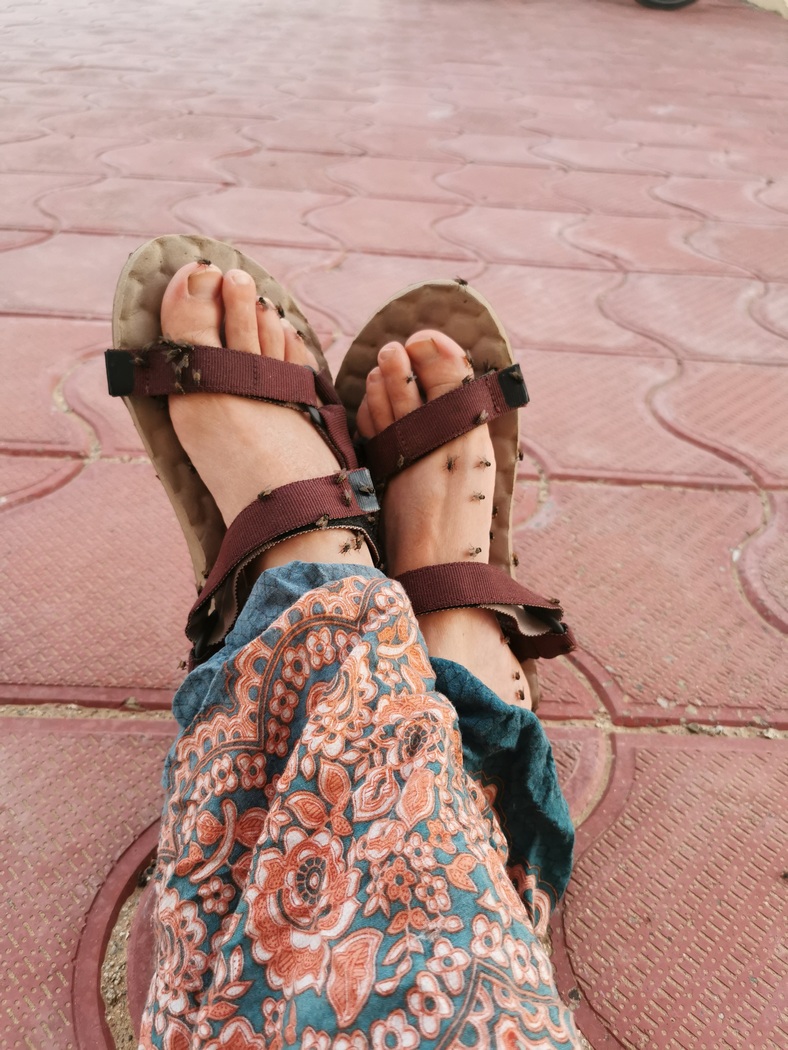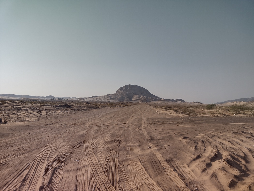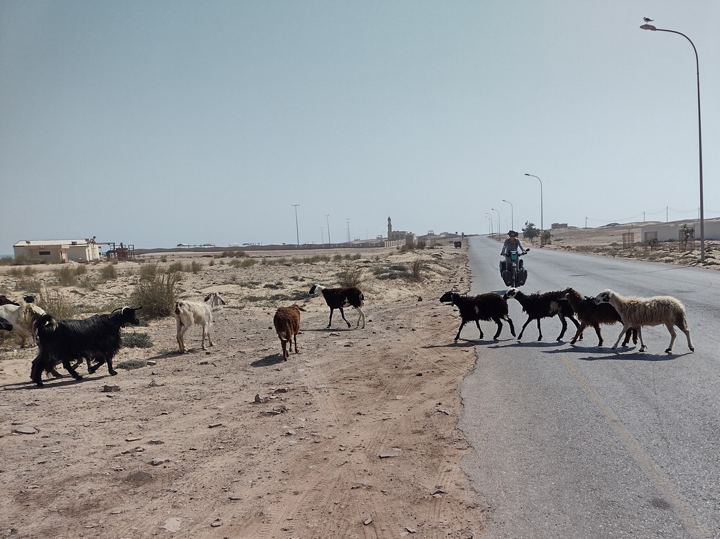 Am Morgen waren die Scharen an Fliegen zurück, Tilmann wollte sich davon nicht das Frühstück verderben lassen und lieber losfahren, um einen anderen Platz zu wählen. Der Trick hatte ja schon mit den Kakerlaken funktioniert. Aber auch als wir ein Kilometer weiter unsere Oman-Lappen auspackten, waren wir erneut eingehüllt in eine Wolke aus in üblicher Manier nervös herum hampelnden Fliegen.