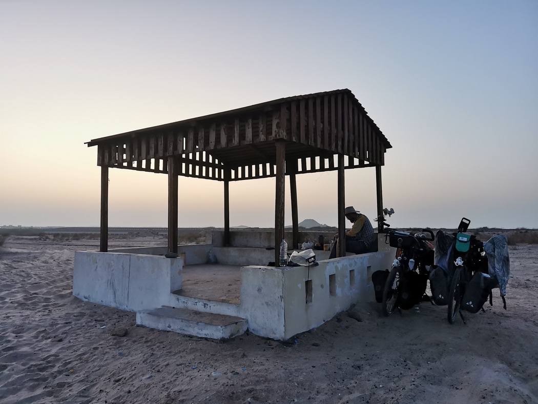 Allerdings waren es bis zum indischen Ozean noch gut 60 km und am Nachmittag setzte ein starker Gegenwind ein. Wir kamen kaum vom Fleck, befanden uns aber ausgerechnet an einer sehr unschönen Passage. Bei diesem Wind hätten wir auf der flachen, uns umgebenden Fläche das Zelt nicht aufbauen können. Wir suchten nach Schutz und hielten an einer neben einer Tankstelle gelegenen Moschee, gerade als viele Gläubige zum Gebet erschienen. Wir schilderte mehreren unsere Lage, in der Türkei und dem Iran wäre nun eine Einladung in die Moschee oder zu jemand nachhause sicher gewesen, doch die Männer erklärten uns einer nach dem anderen, wir könnten nicht im Hof der Moschee nächtigen und eine private Einladung erhielten wir auch nicht.