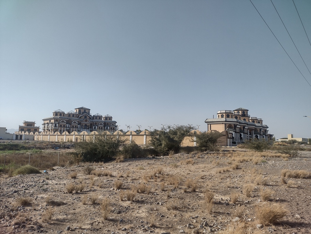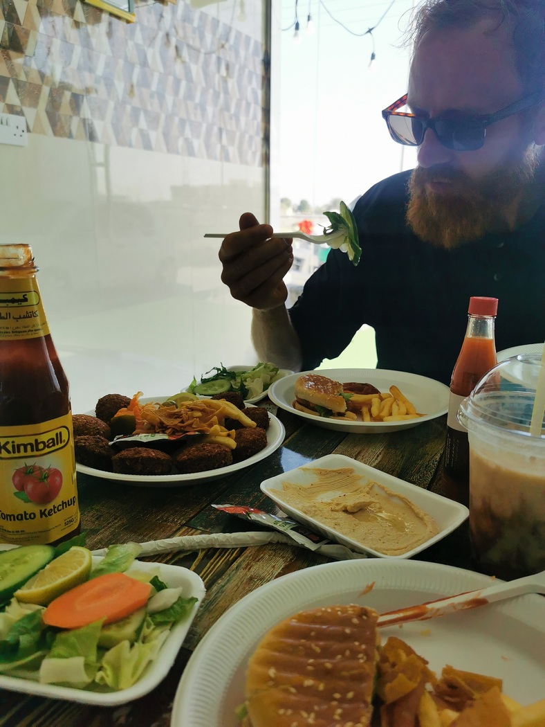 Tagsdrauf schlug uns die Fahrt auf dem Highway dann doch derart aufs Gemüt, dass wir gerne weitere 15 Kilometer Umweg in Kauf nahmen, um noch einmal Richtung Küste in besiedeltes Gebiet zu wechseln, was natürlich mit mehr Verkehr verbunden war, landschaftlich auch keine Highlights versprach, aber immerhin konnten wir Häuser gucken. Da dies nun unser letzte Tag im Oman werden sollte, war zum Abschied auch noch ein Festessen in einem Coffee Shop angesagt. Hier im dichter besiedelten Gebiet fanden wir auch wieder Etablissements, die Plastikgeld annahmen, um dann viele Speisen auf Plastikgeschirr zu servieren.