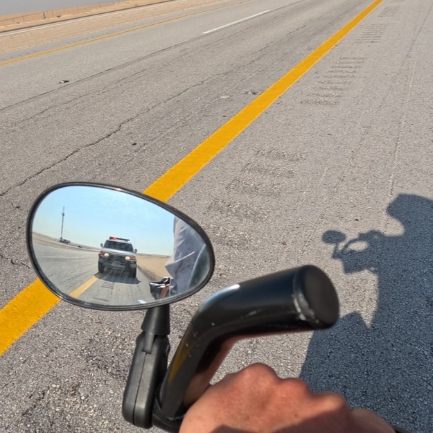 Es ging also ohne Sim-Karte weiter, dafür hatten wir nun seit einigen Kilometern Begleitung durch die Polizei, die mit etwas Abstand auf dem Seitenstreifen hinter uns her zuckelte. An besagtem Tankstellen-Ladenlokale-Moschee-Complex sprachen wir unsere neuen Begleiter an, wünschten einen guten Tag, bedankten uns höflich, versuchten aber mitzuteilen, dass wir keinen Schutz auf dieser gut ausgebauten, mit breitem Seitenstreifen versehenen und wenig befahrenen Straße bräuchten. Die beiden Polizisten, die vorsorglich schon im Auto Warnwesten trugen und an deren Gürteln 6-Kammer-Revolver hängen hatten, verstanden nichts, nur arabisch. Die Polizeipräsenz war auf dem Highway ohnehin enorm hoch. Nicht nur stand alle 5 km ein Wagen mit eingeschaltetem Blaulicht am Straßenrand, auch wurden wir mehrfach von Einsatzfahrzeugen überholt, während uns solche gleichzeitig auf der Gegenfahrbahn regelmäßig entgegen kamen. Wir wären also auch ohne direkte Begleitung gut geschützt gewesen.