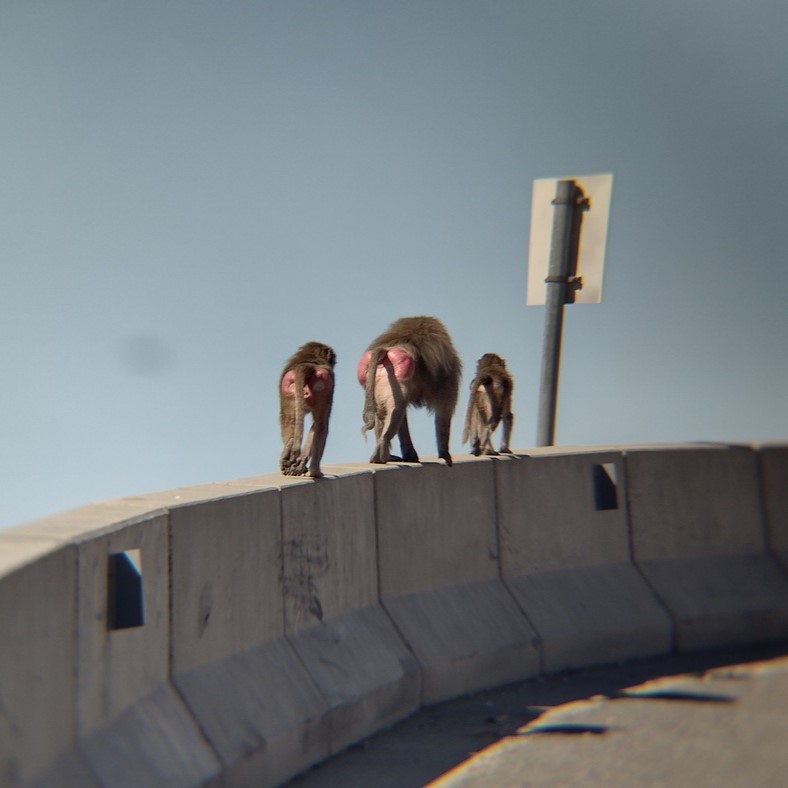 Interessant zu beobachten war außerdem: Das Essen, das einige Menschen trotz Fütterungsverbot aus dem Fenster ihres Autos warfen, wurde von den Affen, nicht jedoch von den Hunden eingesammelt. Hunde und Katze versuchten nicht mit ihnen in Konkurrenz zu treten, sie bettelten nicht, zankten sich nicht mit ihnen ums Essen, sondern hielten sich im Hintergrund. Über das Fütterungsverbot wird eindeutig auf Schildern informiert und ist auch deshalb von Bedeutung, da die Pavian-Population stark wächst und laut einem Zeitungsartikel🔗 ab und zu „Amok“ läuft und Dörfer in der Gegend überfällt, um dort zu Plündern. Uns gegenüber haben sich die Affen eher etwas scheu verhalten, sind keinesfalls frech geworden und waren mit entsprechenden Gesten leicht zu vertreiben. Sie reihten sich damit ein in eine Vielzahl von Tieren, denen Autos als vertraute Unruhestifter weitestgehend egal waren, während sie sich von den ungewohnten Fahrrädern ein wenig aus der Ruhe bringen ließen. Nur die Ober-Affen hüpften uns auch mal entgegen, wenn wir uns ihrer Familie etwas zu sehr nährten. So hielten wir gebührend Abstand, bestaunten aber die unansehnlichen Hinterteile, die bei einigen Affen solche Gewülste hervorbrachte, dass sie kaum mehr laufen oder sitzen konnten.