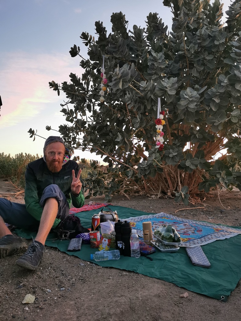 Wir waren trotz dieser Unterbrechungen gut vorangekommen und wollten gegen Abend nun noch einen Endspurt von 20 km einlegen. Just in diesem Moment nahm der Wind jedoch kräftig zu und wir verhedderten uns zusätzlich in einer Diskussion über die richtige Schlafplatzwahl. Schließlich setzte sich (ausnahmsweise) Julia durch und die Wahl fiel auf einen Platz in einem mit Büschen und Bäumen bestandenen Wadi, dass besonders im Sonnenuntergang äußerst hübsch aussah und der erste (und bisher einzige) wirklich schöne Zeltplatz war, den wir in Saudi Arabien hatten. Ein Busch mit großen grünen Blättern (die Kenner hier, können gerne eine Artbestimmung vornehmen) bot uns Windschatten und wurde sogleich von uns mit den neuen Blumenketten geschmückt, sodass wir tatsächlich noch unter einem etwas exotischen Weihnachtsbaum ein sehr leckeres Abendessen (Linsensuppe) verspeisen konnten. (Die Alternativen zu diesem Zeltplatz wären übrigens a) ein halb vergammelter Wohncontainer, dessen Boden mit Vogelkot überdeckt war und b) im Windschatten eines riesigen Hühnerstalls, gewesen.)