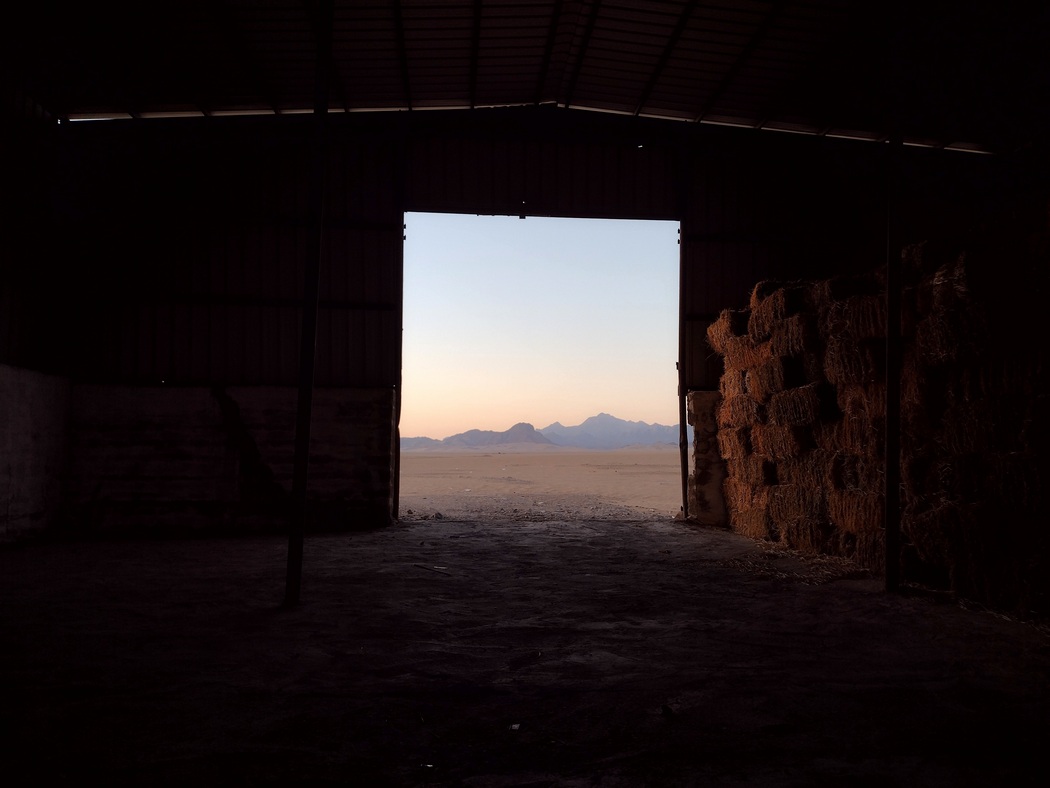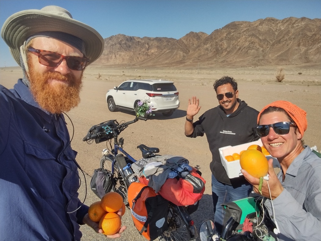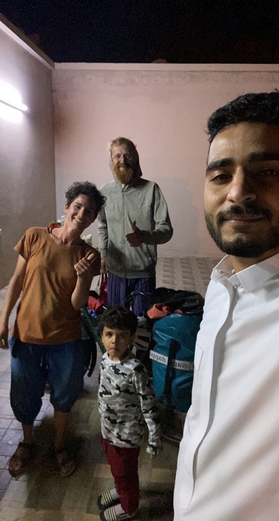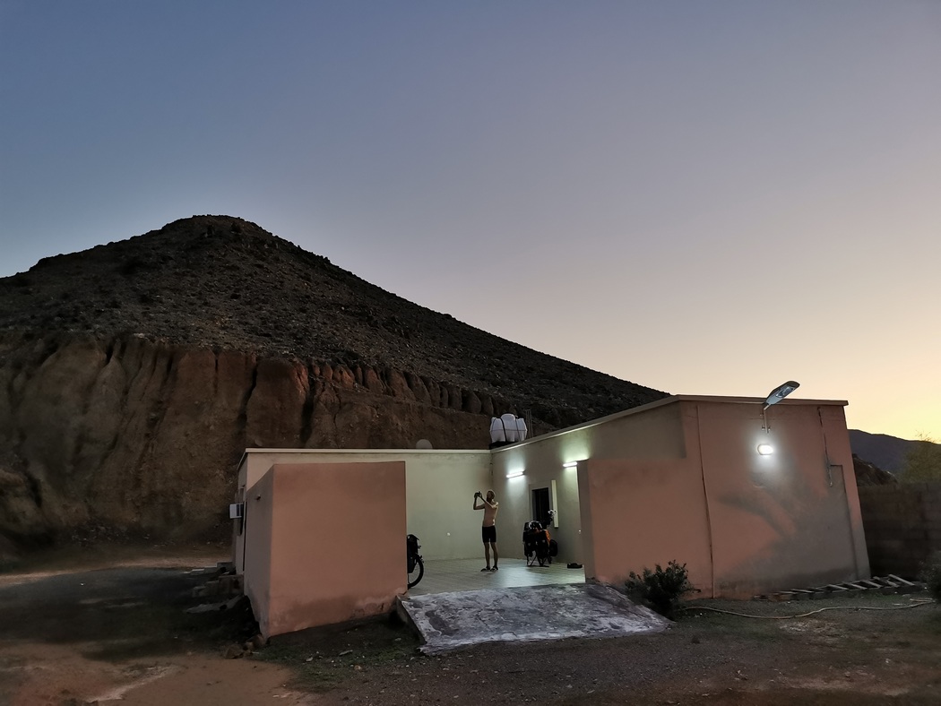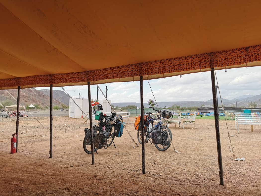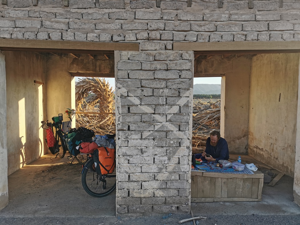 Zwar verabredet, aber so oder so trafen wir auf dieser Strecke andere Radreisende aus Spanien. Wir hatten bereits Kontakt über Instagram und wussten, dass wir uns entgegen kamen, allerdings hätte man sich bei dieser einen Straße durch dieses dünnbesiedelte Gebiet auch nicht verfehlen können. Wir legten eine lange gemeinsame Mittagspause an einer kleinen Moschee mitten im Nirgendwo ein und merkten schnell, dass wir viele ähnliche Eindrücke auf unseren Reisen gesammelt hatten. Die beiden wollten sich noch bis Indien durchschlagen. Es war das erste mal seit Armenien bzw. Ende August, dass wir andere Radreisende auf der Straße (und nicht in einer Unterkunft) getroffen hatten. Da wir auf den Geschmack gekommen waren unser Zelt innerhalb von bestehenden Gebäudestrukturen zu errichten, übernachteten wir in dieser Nacht in einer offenen Scheune in der Heu gelagert wurde. Davon hatte Tilmann seit Tag 1 unseres Trips geträumt und wir hätten niemals gedacht, dass der Traum in Saudi Arabien war werden würde.