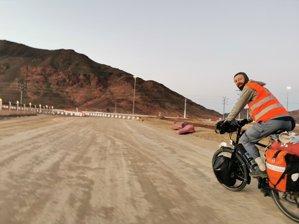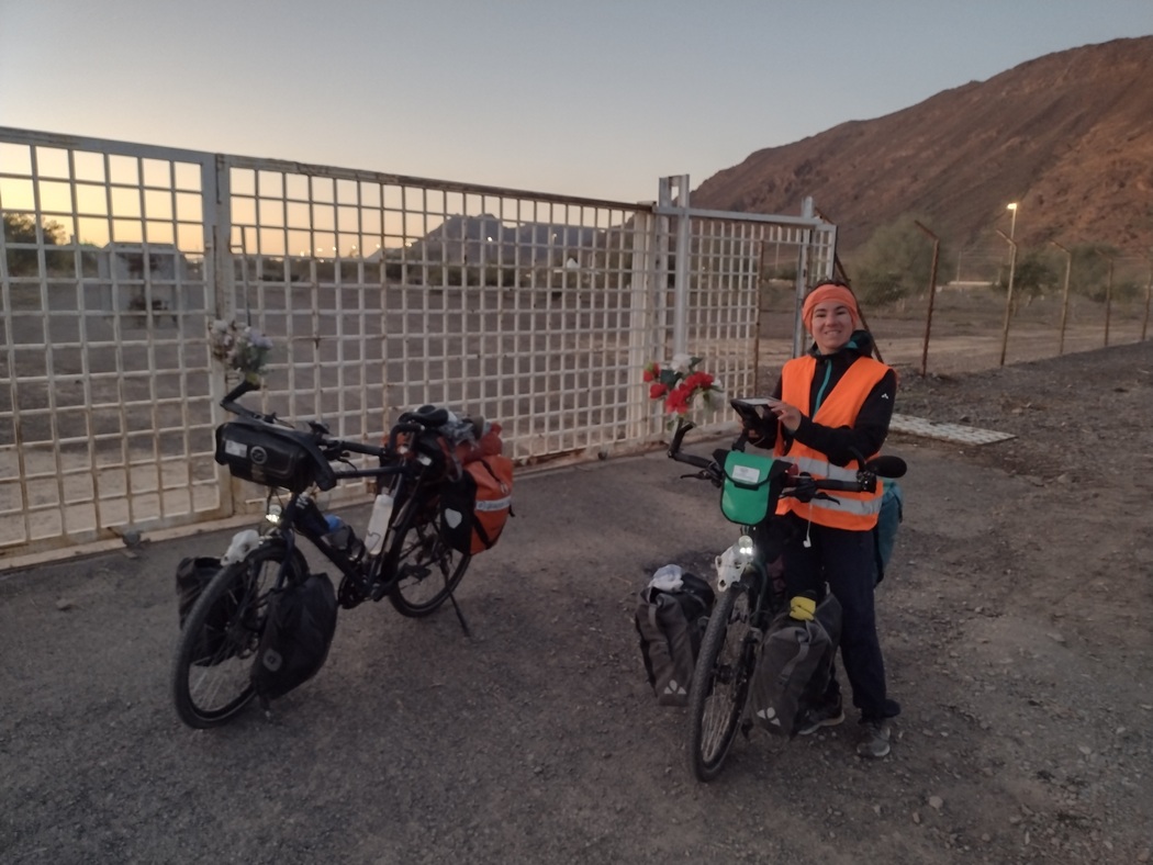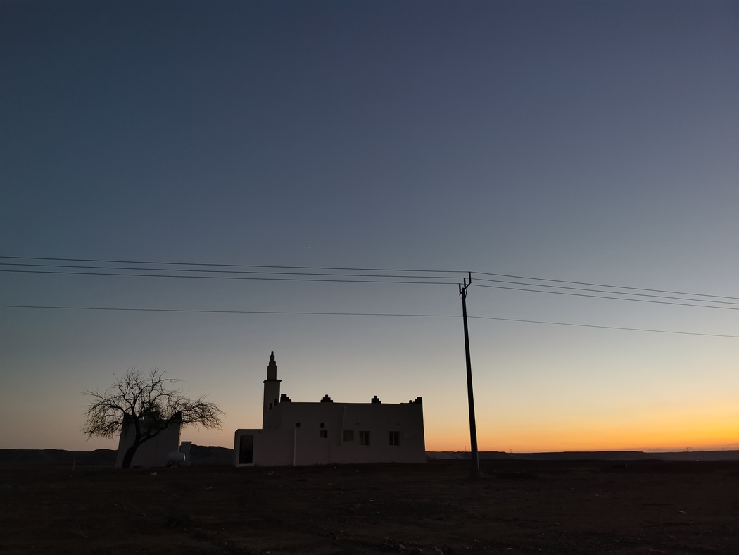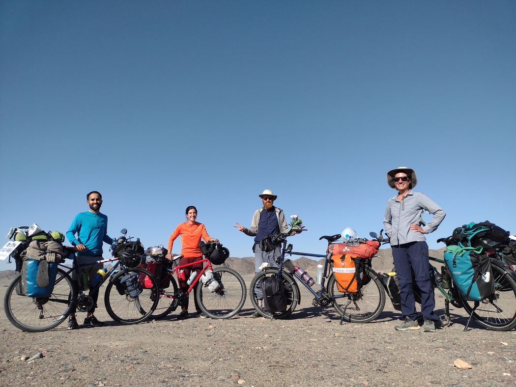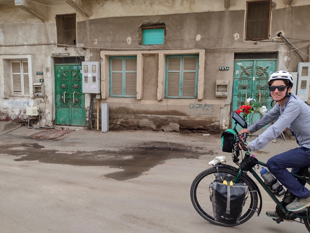 Zwar verabredet, aber so oder so trafen wir auf dieser Strecke andere Radreisende aus Spanien. Wir hatten bereits Kontakt über Instagram und wussten, dass wir uns entgegen kamen, allerdings hätte man sich bei dieser einen Straße durch dieses dünnbesiedelte Gebiet auch nicht verfehlen können. Wir legten eine lange gemeinsame Mittagspause an einer kleinen Moschee mitten im Nirgendwo ein und merkten schnell, dass wir viele ähnliche Eindrücke auf unseren Reisen gesammelt hatten. Die beiden wollten sich noch bis Indien durchschlagen. Es war das erste mal seit Armenien bzw. Ende August, dass wir andere Radreisende auf der Straße (und nicht in einer Unterkunft) getroffen hatten. Da wir auf den Geschmack gekommen waren unser Zelt innerhalb von bestehenden Gebäudestrukturen zu errichten, übernachteten wir in dieser Nacht in einer offenen Scheune in der Heu gelagert wurde. Davon hatte Tilmann seit Tag 1 unseres Trips geträumt und wir hätten niemals gedacht, dass der Traum in Saudi Arabien war werden würde.