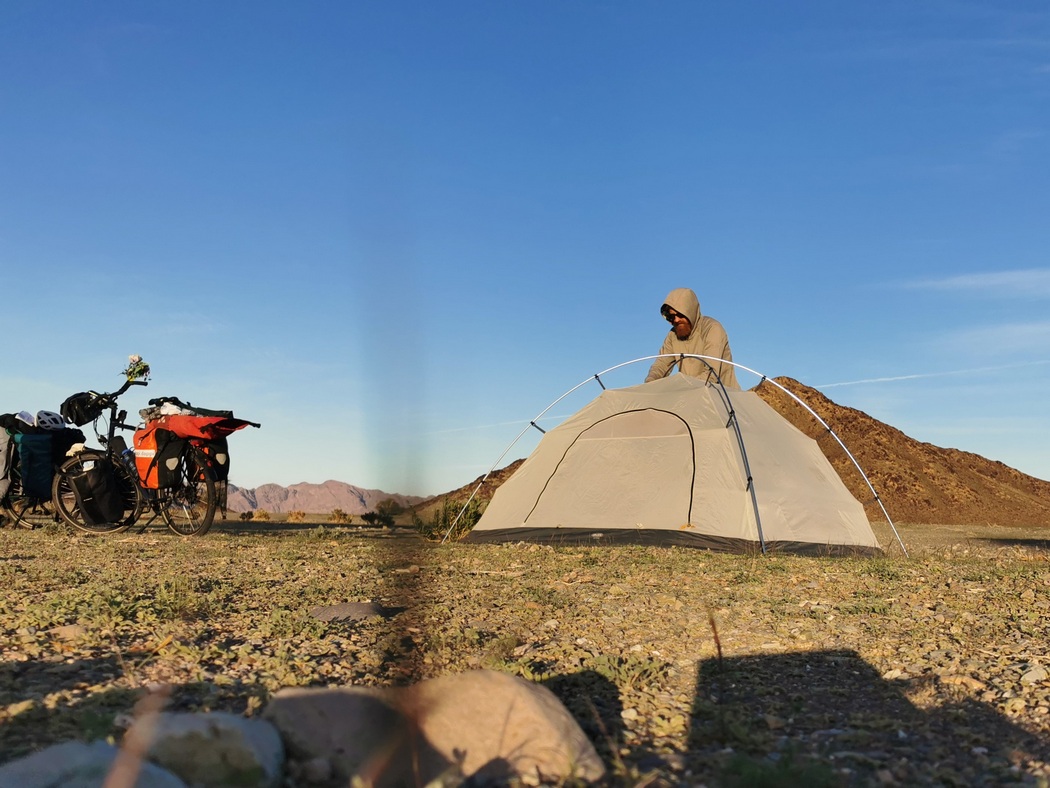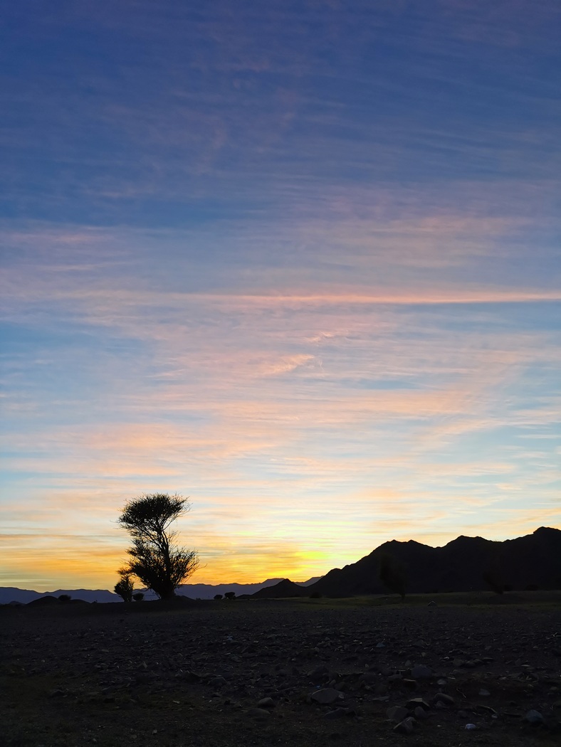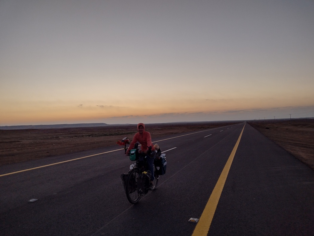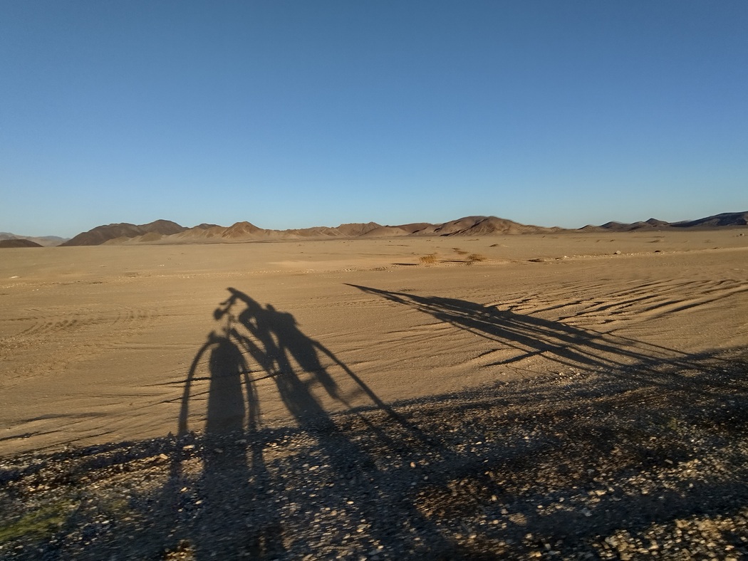 Wir kampierten in einem Wadi mit hübscher Aussicht vollkommen ungestört und genossen Sonnenuntergang und Sternenhimmel. Unsere Reise hatte sich also wieder in einen Genuss gewandelt und das Sahnehäubchen war, dass es nun auch der Wind nicht mehr so übel mit uns meinte und das Radeln wieder richtig Spaß machte.