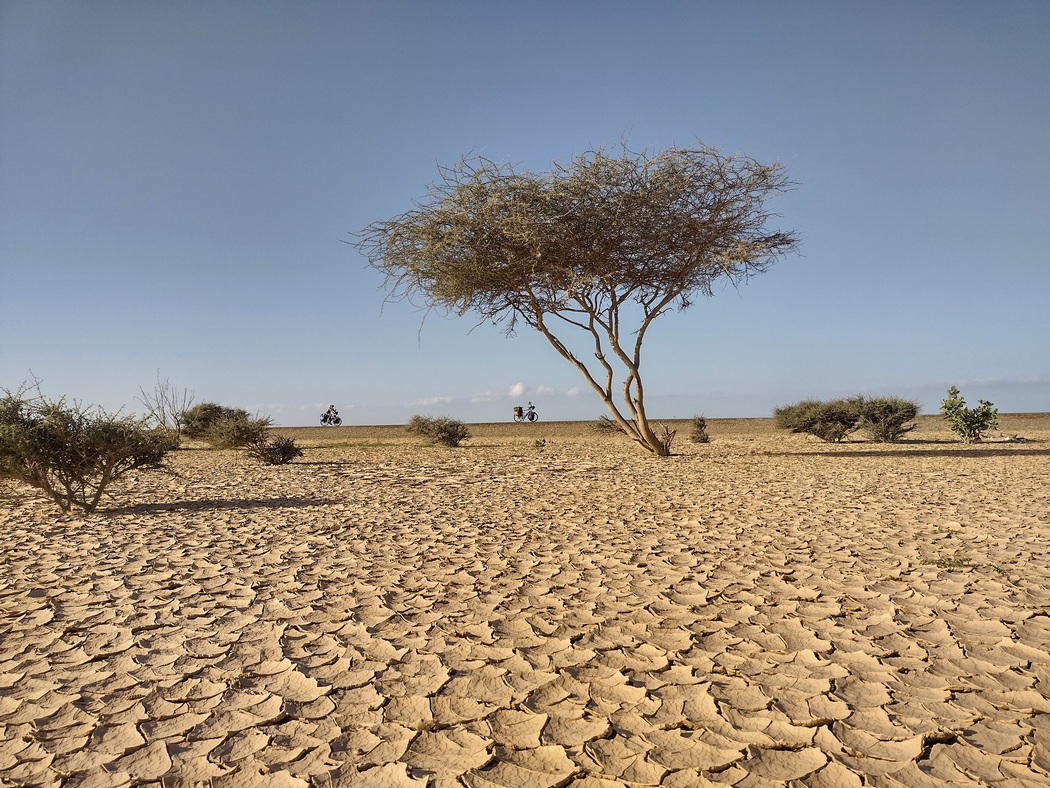 Am Roten Meer waren die Temperaturen eigentlich schon wieder sommerlich und als wir in Thuwal aufbrachen war es warm, nur der Wind blies uns entgegen. Dieser äußerst lästige Umstand sollte sich für die nächsten Tage auch nicht mehr ändern, egal in welche Richtung wir uns auch wanden. Die Landschaft an Tag 278 blieb öde, flache graue Wüste, unterbrochen von Industrieanlagen, die uns spürbaren LKW-Verkehr bescherten. Bei einer der Industrieanlagen handelte es sich übrigens um das größte Kraftwerk Saudi Arabiens, dessen schlechter Ruf ihm vorauseilte. Rose und die anderen Bewohner des KAUST-Campus hatten berichtet, dass bei entsprechender Windlage und Betriebsregime die Schwefelwolke bis zur 90 km südlich gelegenen Universität weht. Wir sahen sie tatsächlich ein ganze Weile bedrohlich am Himmel entlang ziehen.
