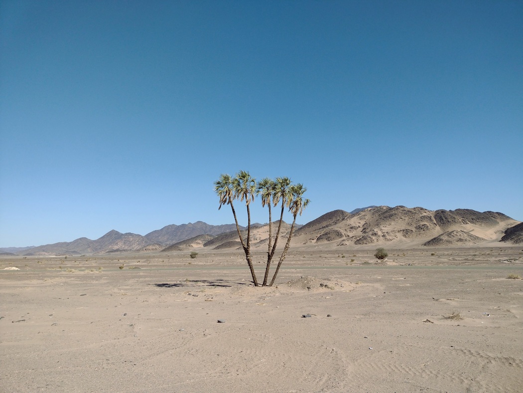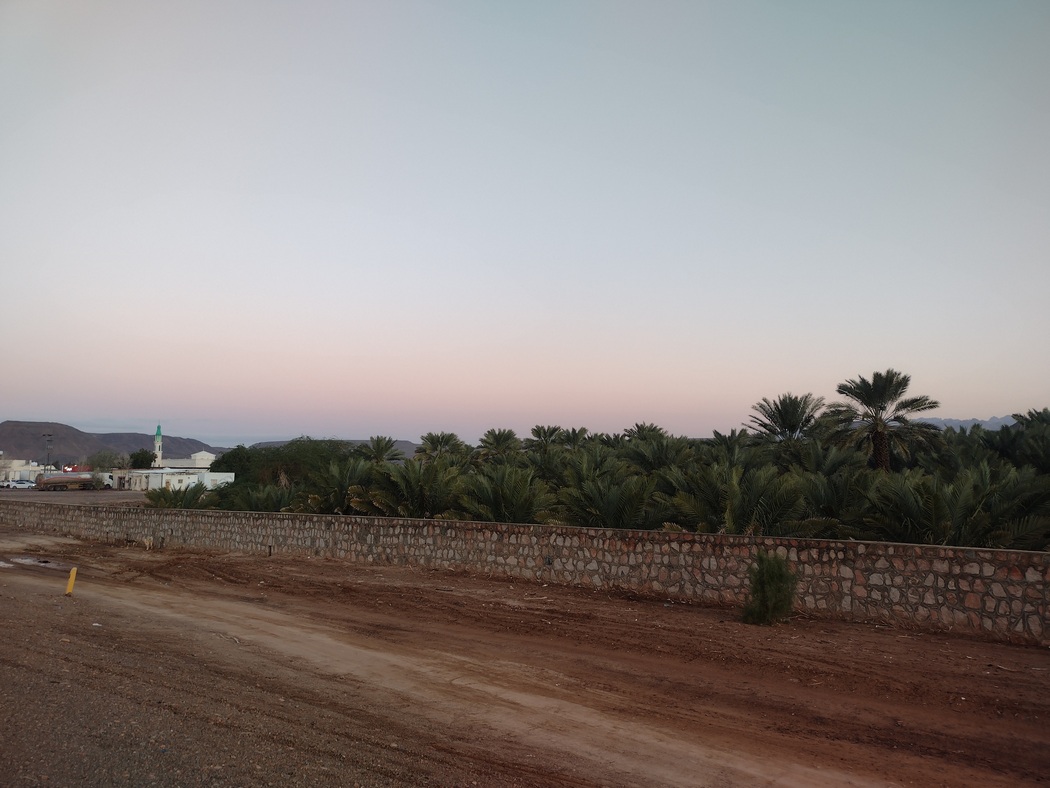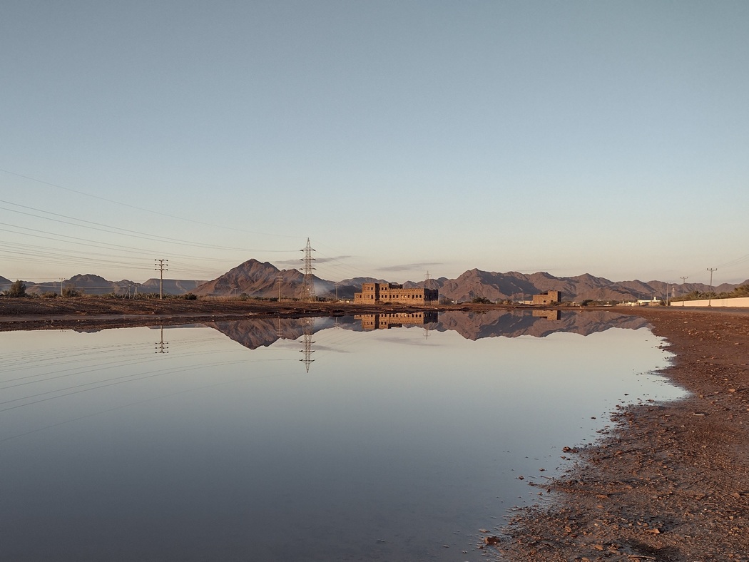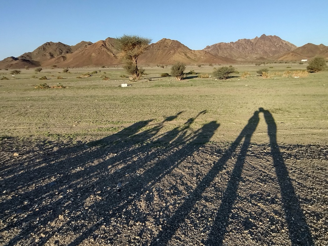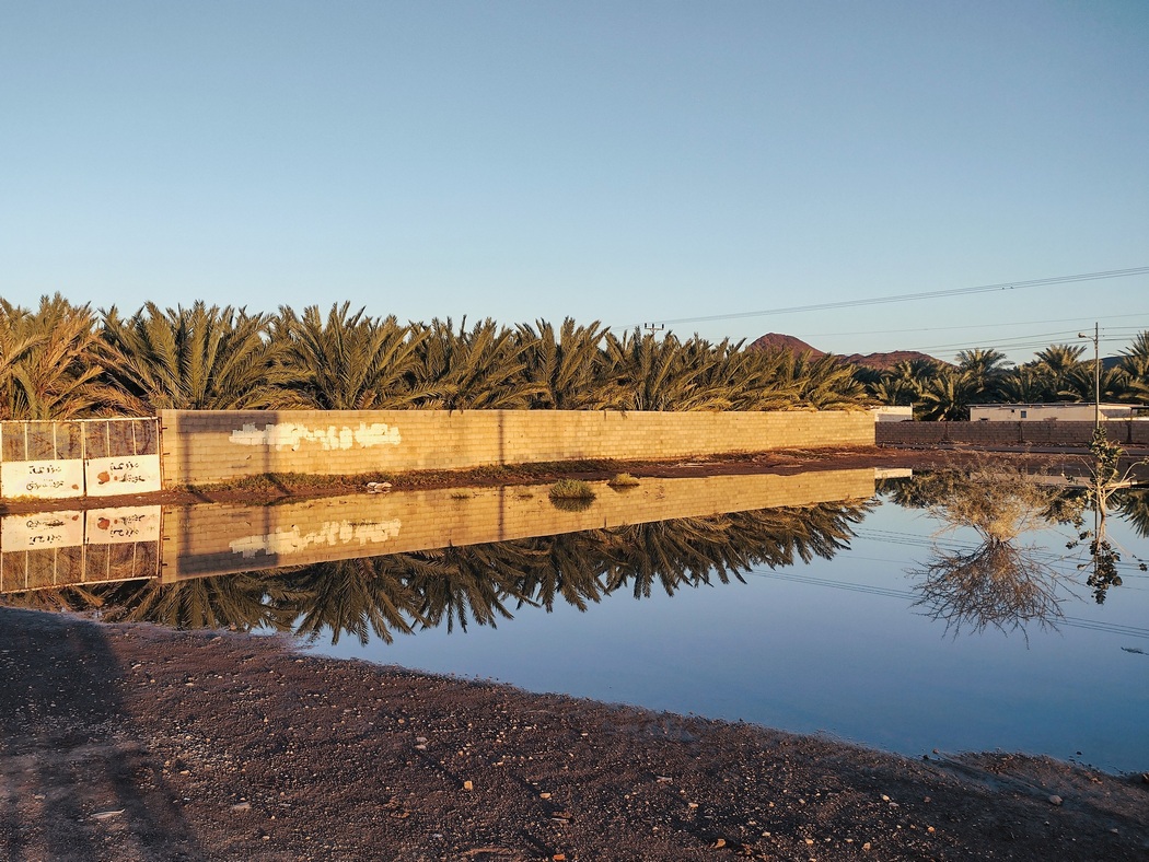 Die Landschaft war nun bergig, von Wadis durchzogen, mit Palmen-Plantagen gesäumt und deshalb viel ansprechender als im Südosten des Landes. An der wenig befahrenen und gut ausgebauten Straße lagen nur wenige kleine Orte, die aber genug Wasserspender und in ausreichenden Abständen Läden boten. Sowieso bekamen wir Wasser und Obst geschenkt und hätten uns nie Sorgen um unsere Versorgung machen müssen. Am windstillen Morgen bestaunten wir die spiegelglatten Pfützen, in denen die ansehnliche Landschaft wieder schien.