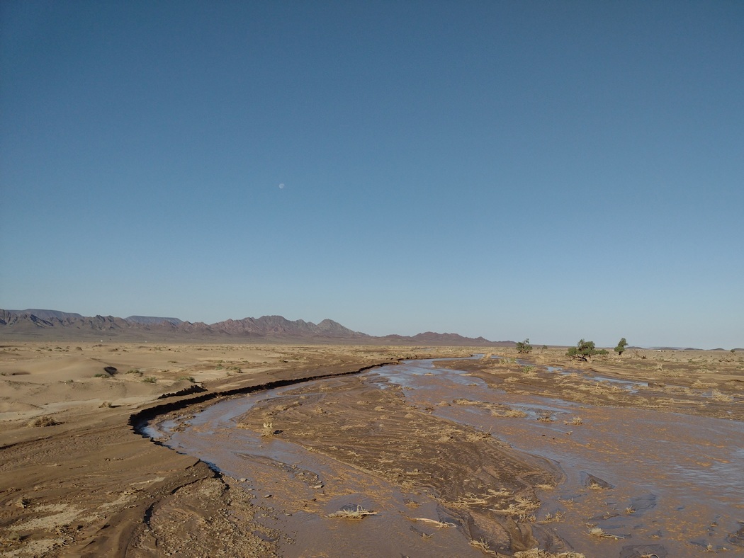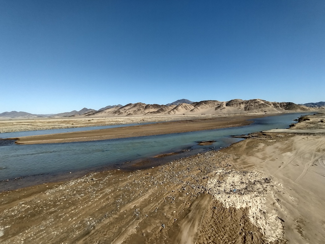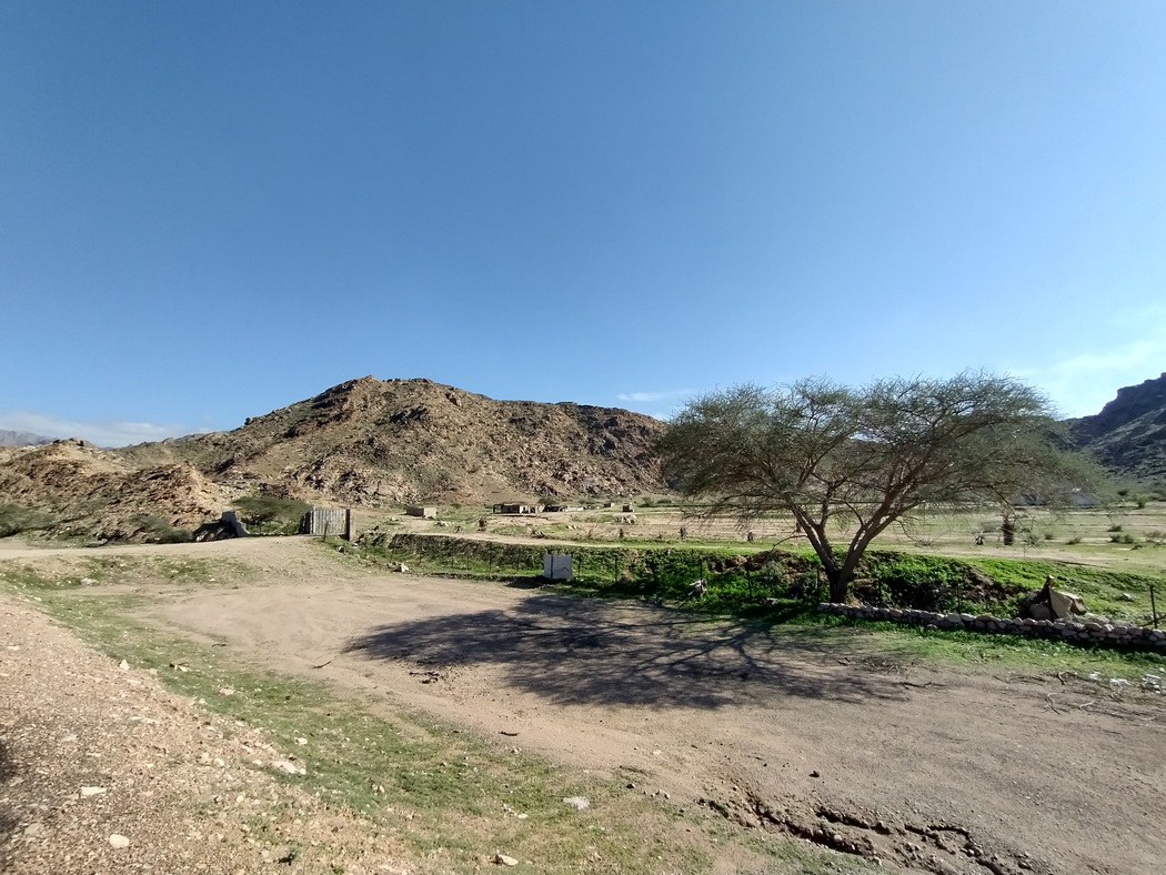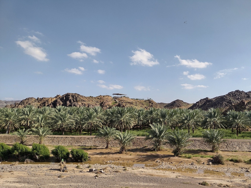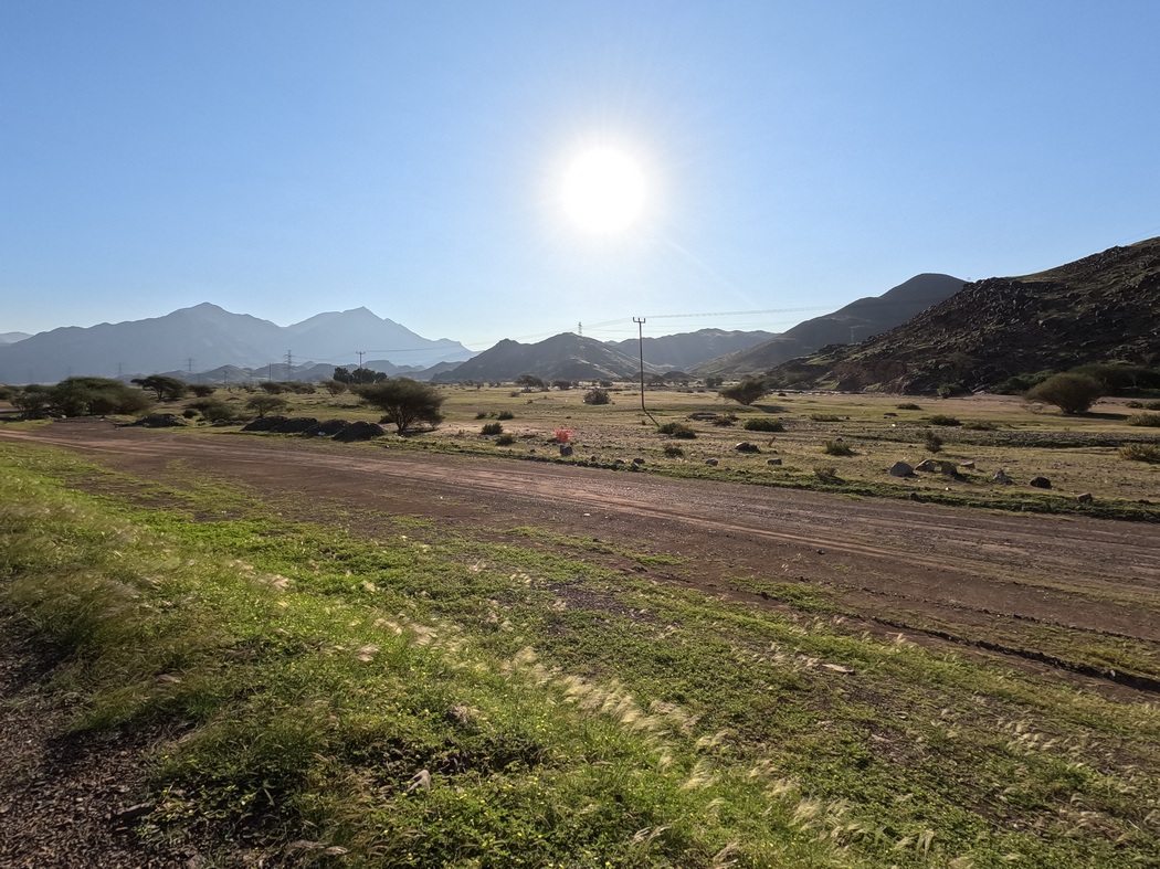 Die Landschaft war nun bergig, von Wadis durchzogen, mit Palmen-Plantagen gesäumt und deshalb viel ansprechender als im Südosten des Landes. An der wenig befahrenen und gut ausgebauten Straße lagen nur wenige kleine Orte, die aber genug Wasserspender und in ausreichenden Abständen Läden boten. Sowieso bekamen wir Wasser und Obst geschenkt und hätten uns nie Sorgen um unsere Versorgung machen müssen. Am windstillen Morgen bestaunten wir die spiegelglatten Pfützen, in denen die ansehnliche Landschaft wieder schien.