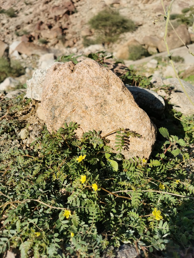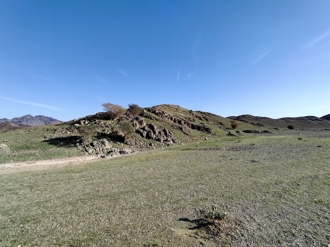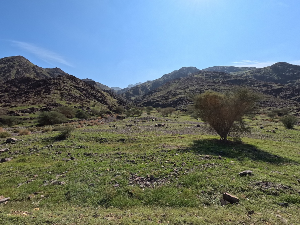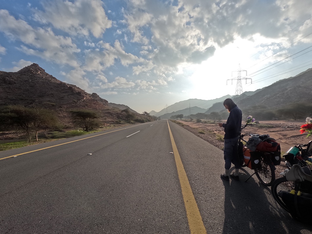 Doch wir schweifen mal wieder ab, es ging ja um die Jahreszeiten. Ganz unabhängig von den Temperaturen hatten wir seit dem Oman kaum wild wachsende grüne Pflanzen gesehen. Doch bereits am zweiten Tag unseres Aufbruchs von Roses, in der Gegend der berühmten Moschee der ausgeschlagenen Geldreichung, wuchs plötzlich hier und da ein dünner Flaum aus unschuldigem Gras am Wegesrand, an dem sich die Kamele gütlich taten. Nachdem wir von der Küste abgebogen und wieder in die Berge vorgedrungen waren, nahm das frische Grün zu und kletterte tapfer die Hänge herauf. Wir sahen sogar kleine bodendeckende Blumen. Die Sonne war warm, doch die Luft sehr frisch. Um uns herum zwitscherten Vögel und summten Insekten. Ganz unverhofft war es Frühling geworden. Wir waren begeistert. Um uns wurde es immer schöner, denn auch ohne das Grün wären die uns umgebenden Berge durchaus ansehnlich gewesen. Um das Radlerglück fast perfekt zu machen, war auch die Straße nicht stark befahren.