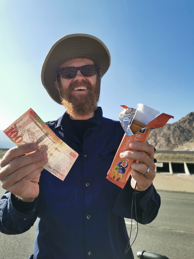 Zwei Tage später war es dann so weit, wieder wurde uns von einem Autofahrer, der uns gerade eine Packung Kekse in die Hand gedrückt hatte, auch ein Schein entgegen gestreckt. Wir lehnten mehrfach ab, doch der großzügige Spender gab nicht auf und schließlich dachte sich Tilmann „ach scheiß drauf“ und griff nach den 100 Rial (25 Euro).