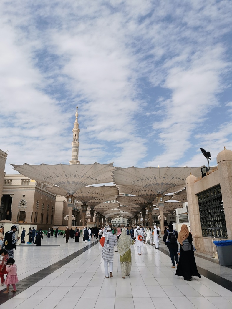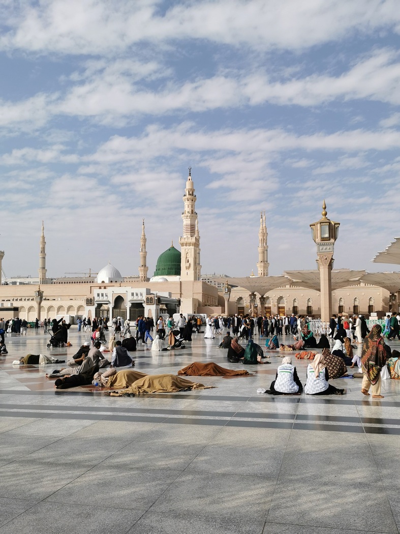 Trotz der Internationalität vor Ort, fielen wir auf undtrotzdem gelangten wir unbehelligt in den Haram, in dem wir natürlich nichts verloren hatten. Uns war der Moment des Grenzübertritts eigentlich bewusst, doch alles wirkte sehr offen (keine Schilder, keine Kontrolle) und es schien niemanden zu stören. In den vergangenen Tagen hatten uns bereits einige Saudis versichert, dies sei kein Problem, wir sollten Al Haram ruhig besuchen. Also liefen wir um die große Prophetenmoschee herum, in der sich das Grab von Mohammed befindet, und ließen die spirituelle Stimmung auf uns wirken.