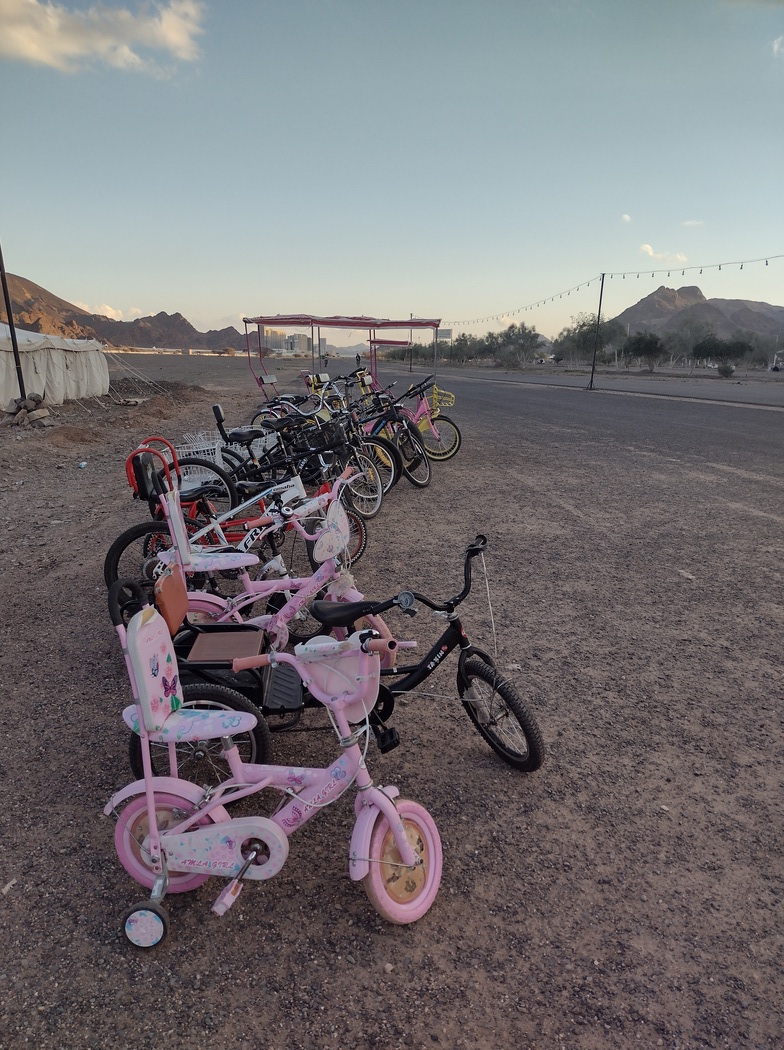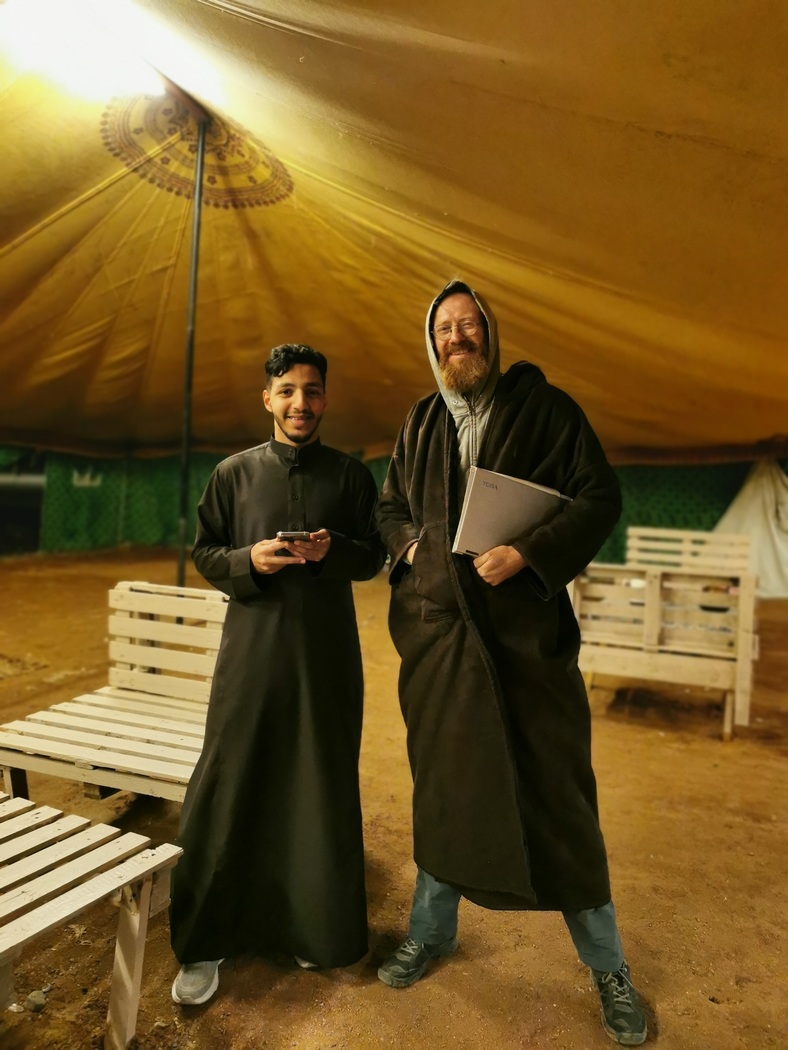 Später kamen weitere Männer hinzu, die sich als Manager, dessen Bruder und dessen Sohn des Fahrrad-Pferdekutschen-Hüpfburgen-Buisiness vorstellten und uns schließlich zur Übernachtung eines ihrer gemütlichen Mietzelte in traditionellem Gewand zur Verfügung stellten. Als Skuril-Touristen sah man uns gegenüber von einer Zahlungsaufforderung natürlich ab und reichte uns noch ein Paket Datteln dazu. Volltreffer! Wir verbrachten einen sehr gemütlichen Abend und eine angenehme Nacht in dem nachempfunden Beduinenzelt.