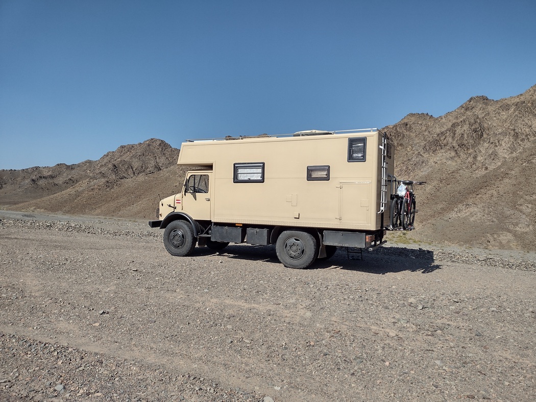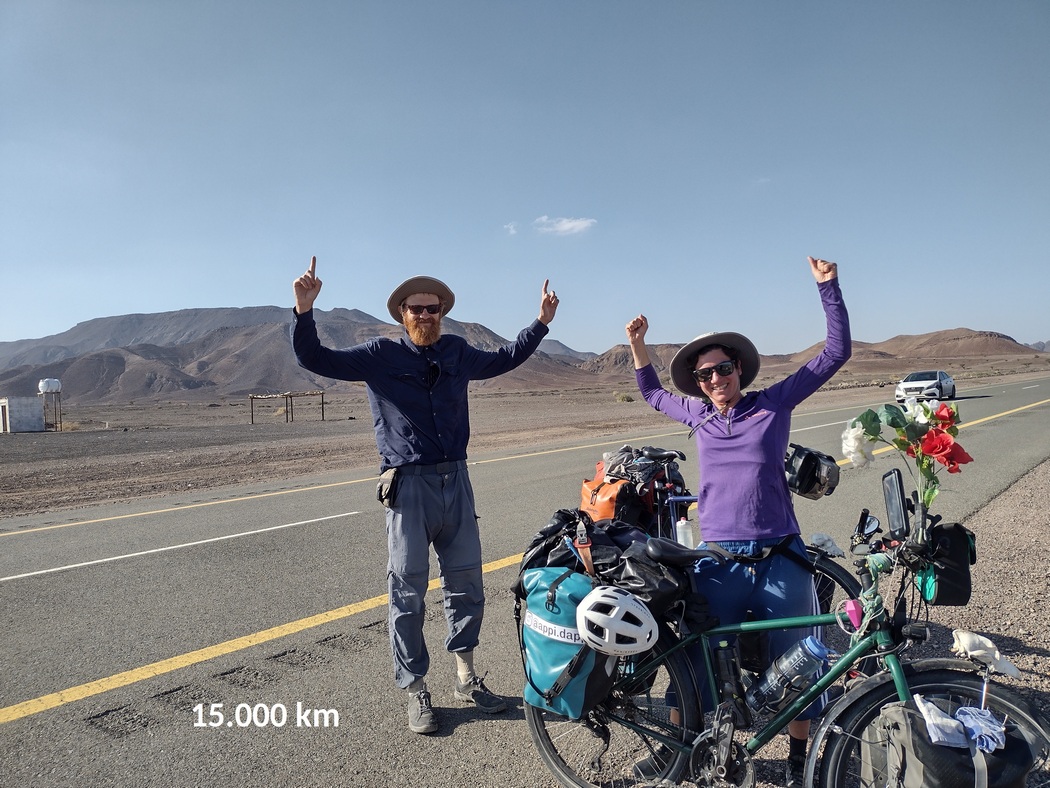 Auch am nächsten Tag trafen wir unterwegs wieder Reisende, diesmal ein österreichisches Paar, das mit einem Reise-Truck unterwegs war. Sie fuhren rechts ran, als sie uns sahen und luden uns zum Kaffee ein. Das Gespräch war so angenehm, dass wir an diesem Tag schon wieder eine lange Mittagspause einlegten. Andi war auch so nett sich aller neugierigen und selfiesschießenden Menschen männlichen Geschlechts anzunehmen, die anhielten und um den Truck herum schlichen. Wir kamen so nicht weit voran, machten aber dennoch die 15.000 km Gesamtdistanz voll. Just in diesem Moment fuhr ein Libanese wurden wir erneut von einem Libanesen aufgemischt, der bereits am vorangegangenen Tag die Verabredung mit den beiden Spaniern gecrasht hatte. Nun konnten wir ihn wenigstens anweisen ein Foto von uns zu machen.