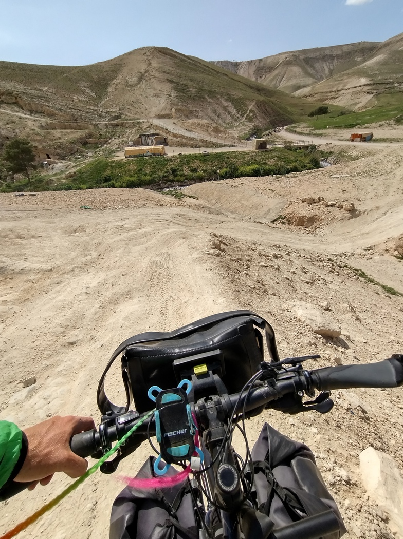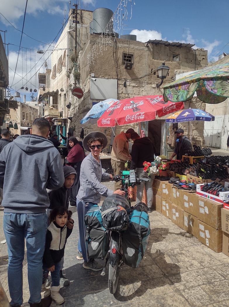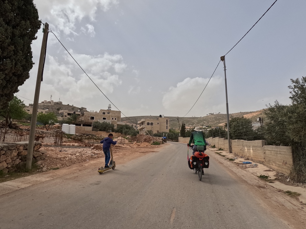 Irgendwo bogen wir also auf eine kleinere Landstraße ab, in der sich die Autos immerhin nicht mehr stauten, der Verkehr allerdings immer noch sehr rege war. Wieder fuhren wir auf und ab und meisterten abermals 1.000 Höhenmeter, was sich langsam auch in unseren Knien, Hüften und Rücken bemerkbar machte. Um unsere Vorräte aufzufüllen, fuhren wir in ein palästinensisches Dorf und mussten uns zu dem kleinen Laden unmenschlich steile Straßen hochquälen. Begleitet wurden wir von einer Kinderschar, die uns mit einem Elektro-Roller umkreiste und „Palastine, Palastine“ riefen. Am Laden angelangt, wollte Julia eine Runde Kekse spendieren. Zwei Jungs griffen zu, einer lehnte ab, zufrieden sah keiner aus und schließlich warfen die beiden die Kekse auf den Boden ohne davon probiert zu haben. Wir prüften noch einmal die Anzahl der Zacken der auf den Keksen aufgeprägten Sterne, konnten aus dem Ergebnis fünf keine erklärenden Schlüsse ziehen.