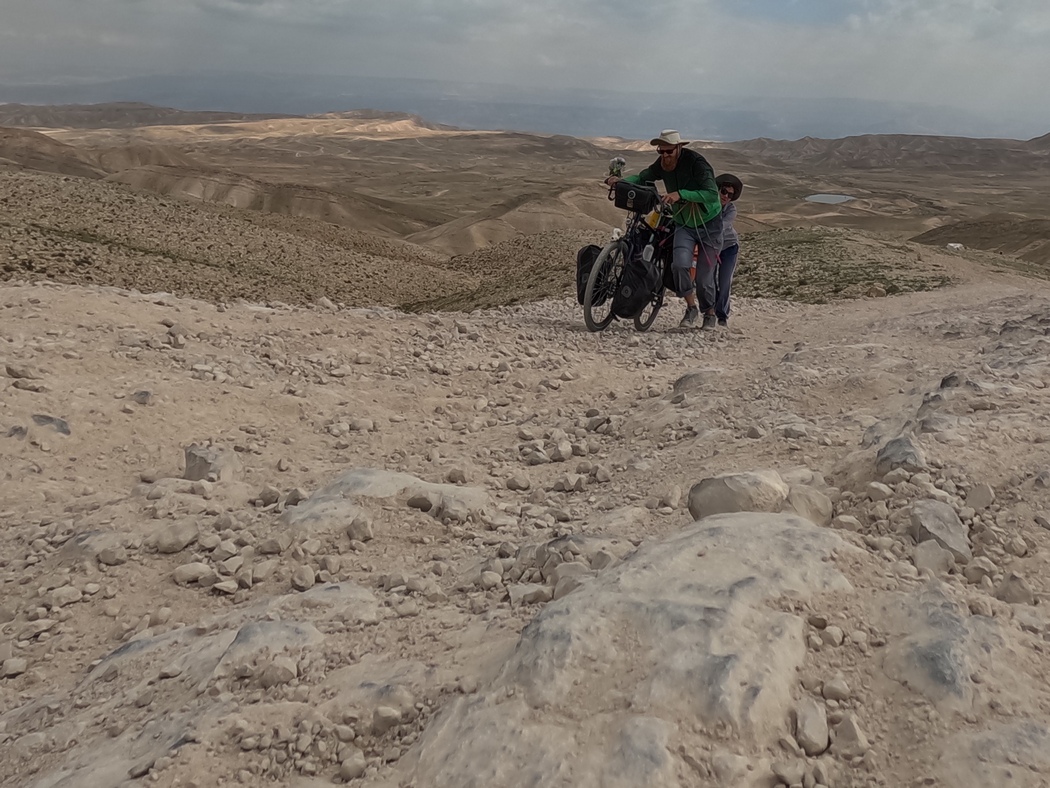 Nicht nur im wahrsten Sinne sondern ebenfalls im Übertragenen ging es weiter mal hoch, mal runter, mal holprig, mal flüssig durch Israel. Wir wurden hin und her geworfen zwischen aufrüttelnden Eindrücken und körperlichen Höchstleistungen. Mit den letztgenannten soll auch diese Geschichte beginnen: Das absolut Schlimmste am Fahrradreisen, ist, wenn man schieben muss. Klar, lieben wir unsere Fahrräder, falls einige von euch nun das alte Sprichwort in den Sinn kam, aber unsere schweren Reiseräder mit viel Gepäck einen steilen Berg über eine steinige Pfade zu schieben, hassen wir. Diese steinige Straße war sogar so steil und aufgrund des feinen Gerölls so rutschig, dass wir die Fahrräder teilweise sogar nacheinander gemeinsam hinauf schieben mussten. Das passierte uns hier zum ersten mal, nachdem wir in Armenien durch die Hölle gegangen waren. Bald taten uns die Arme und die Rücken weh und wir mussten zum Trost all unsere Schokolade aufessen. Immerhin hatten wir uns diese nach erfolgloser Suche nach einem Lebensmittelgeschäft an einer Tankstelle für einen akzeptablen Preis erwerben können und einem Restaurant konnten wir etwas Brot abschwatzen.