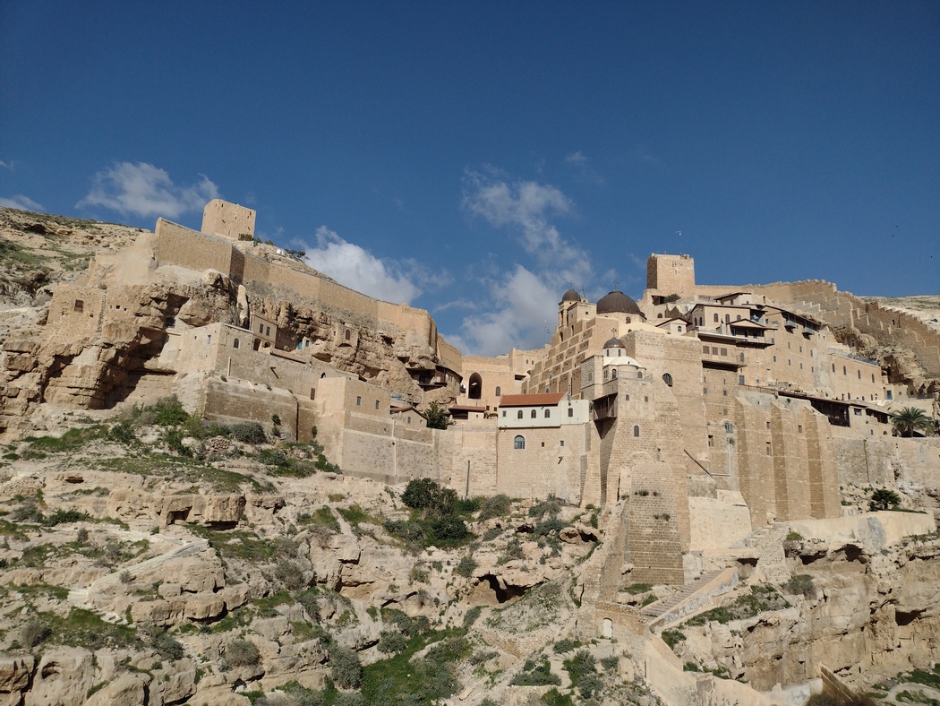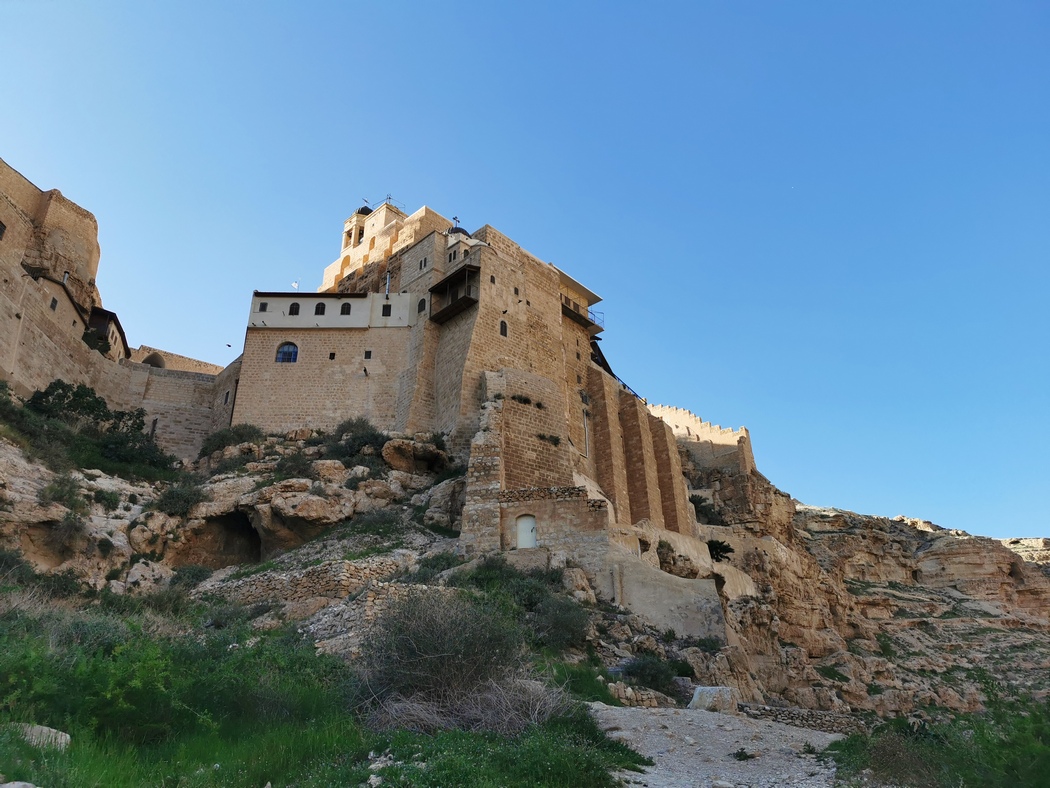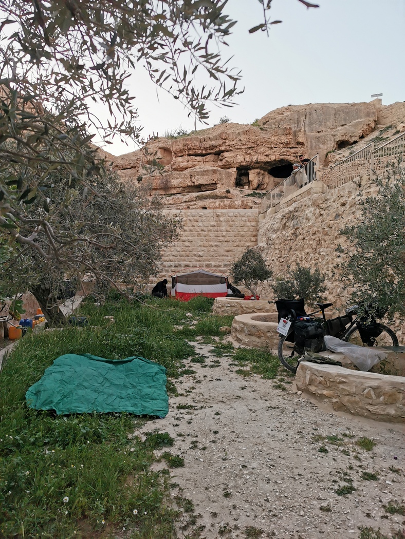 Als wir gerade nach der Ankunft der beiden beieinanderstanden und aufgeregt über jeden Felsbrocken jammerten, über den wir gerade noch die Fahrräder hieven mussten, hörten wir plötzlich eine Stimme, wie aus dem Nichts zu uns sprechen. Wir blickten um uns, doch konnten weit und breit keinen Menschen erblicken. Wer sprach da zu uns? Hatten wir eine Vision, eben wie der heilige Saba, der dieses Kloster aus diesem Grund hier erbaut hatte? Doch dann wurde uns klar, dass die Stimme durch die kleinen Klostertür drang. Der rumänische Mönche teilte uns durch die Tür mit (er konnte oder durfte diese anscheinend nicht mehr öffnen), dass wir gerne rund um oder im Klostergarten übernachten dürften, aber auf uns selbst aufpassen müssten. Er sah sich wohl genötigt, dies hinzuzufügen, da einer der Mönche erst kürzlich von hier herumlungernden arabischen Kindern mit Steinen beworfen wurde.