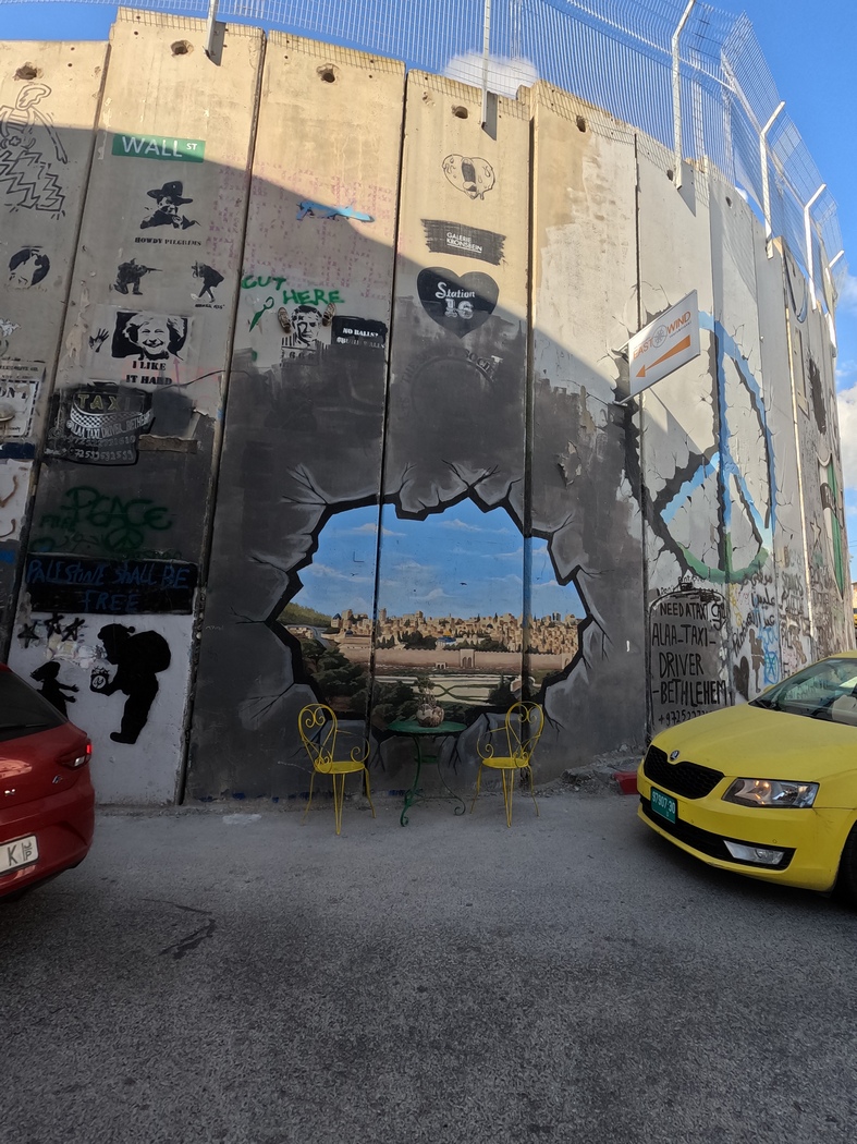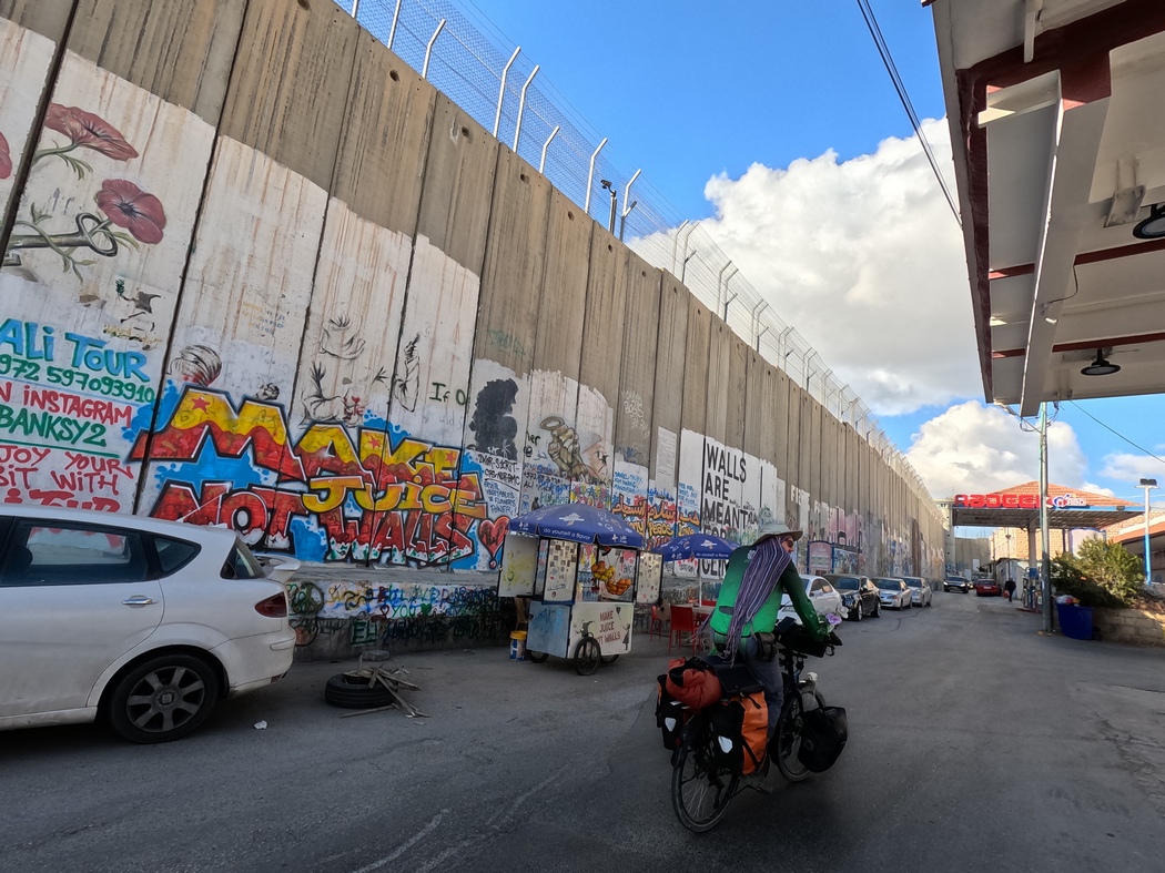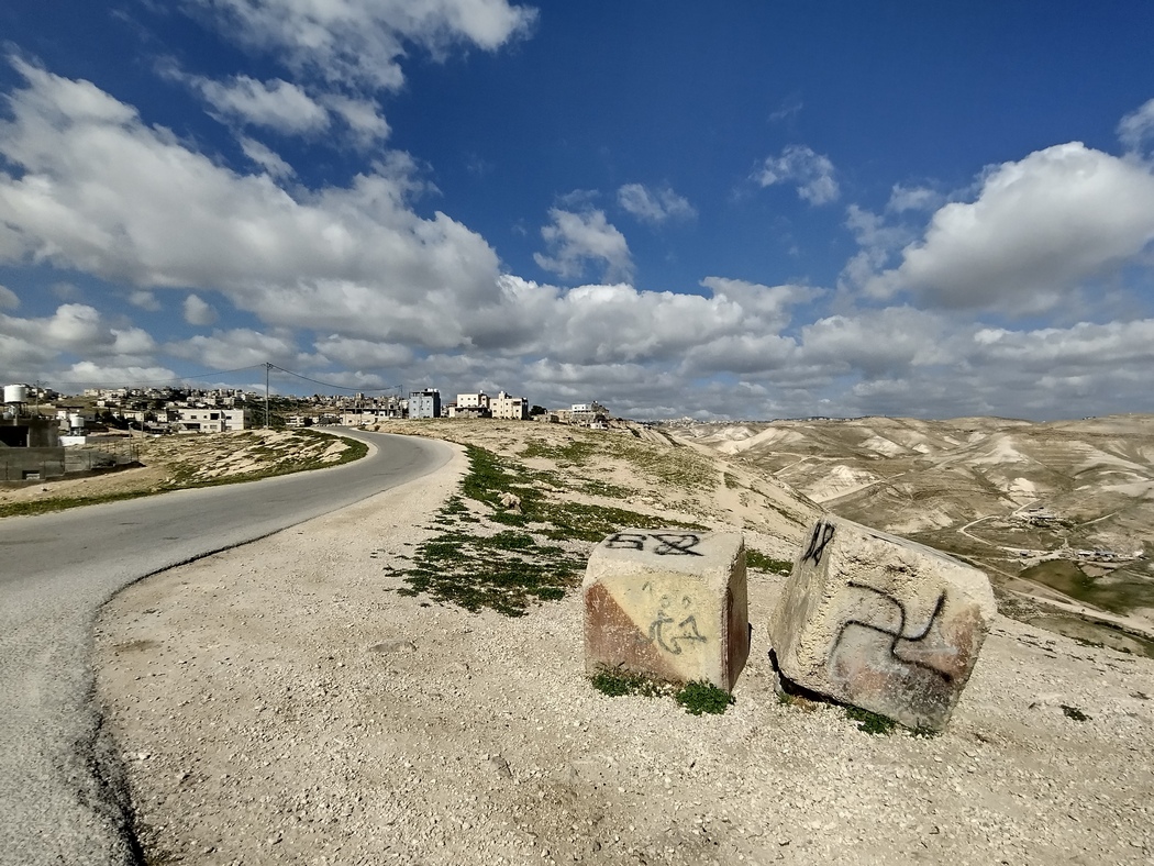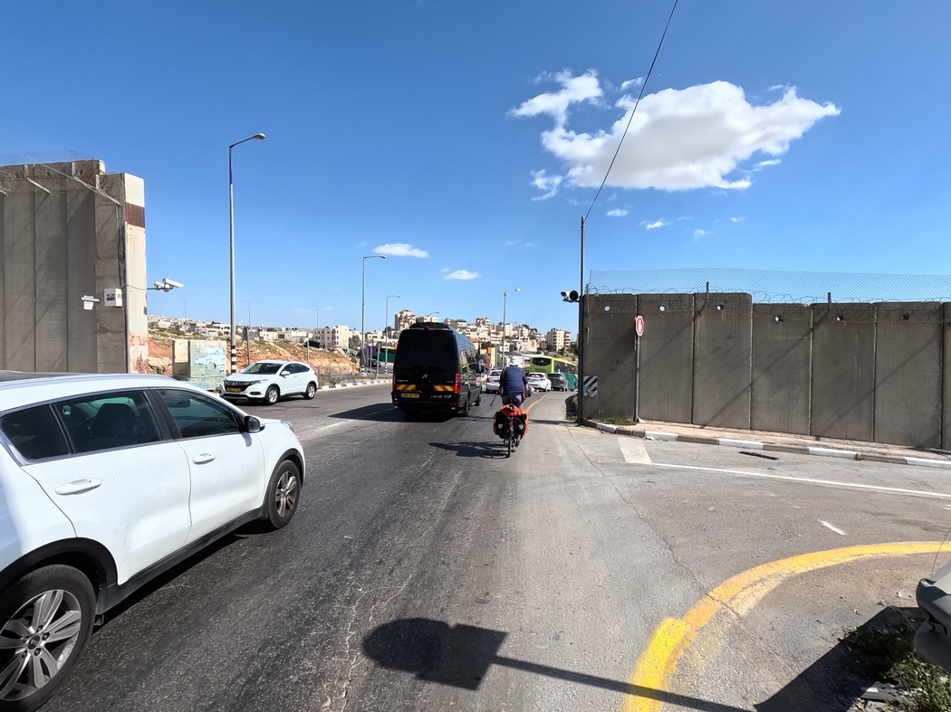 Am 13.03.2023 verließen wir Jerusalem und beschlossen, trotz verschiedenartiger Meinungen über die dortige Sicherheitslage und entsprechende Verhaltensweisen, durch die Westbank zu fahren. Viele Israelis fahren selbst nie in die Westbank und scheinen teilweise große Bedenken zu haben. Wenn man die Grenze von Israel zu den palästinensischen Gebieten überquert, wird man allerdings nicht kontrolliert, andersherum schon. Es ist also durchaus möglich, als Israeli in die Westbank zu fahren, allerdings wiesen auch einige Schilder darauf hin, dass es nicht erlaubt ist. Da es ein paar Tage zuvor wieder einen Anschlag in Tel Aviv gegeben hatte, wurden wir gewarnt, die Situation könnte angespannt sein. Wir verließen Jerusalem und konnten noch einmal die brachiale spaltende Mauer sehen, an der wir eine Weile entlang fuhren, bis wir sie schließlich unbehelligt durchquerten und uns an Massen von sich staunenden Autos vorbei durch das bergige Gelände arbeiteten. Wir hatten beschlossen, die Städte nun größtenteils zu umfahren, weil der Verkehr schon fast wieder iranisches Niveau erreicht hatte.