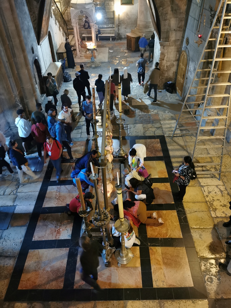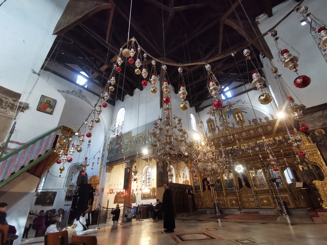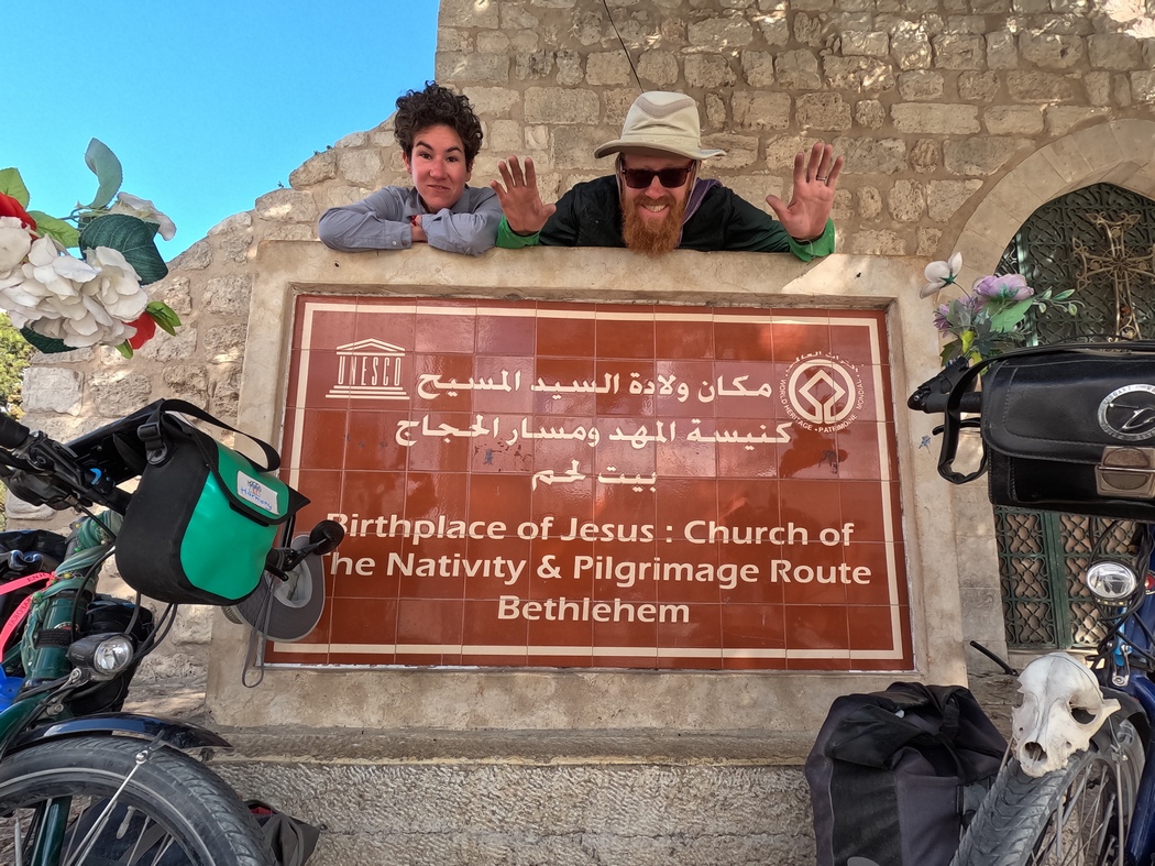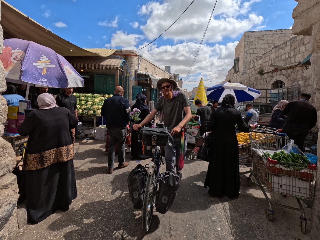 Es war fast unmöglich in die Altstadt zu gelangen: Wir schlängelten uns fluchend zwischen den im Stau stehenden Autos und den vollen Gehwegen hindurch und landeten schließlich inmitten des Marktes, der dort in den engen Gassen von der palästinensischen Bevölkerung rege genutzt wird. Vor lauter Trubel hatten wir die Kirche, die am angeblichen Geburtsort von Jesus erbaut wurde einfach übersehen und waren daran vorbeigefahren. Nachdem wir unsere Räder durch das Markttreiben geschoben hatten, fanden wir sie dann doch noch und statteten ihr diesen obligatorischen Besuch ab.
