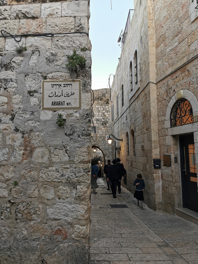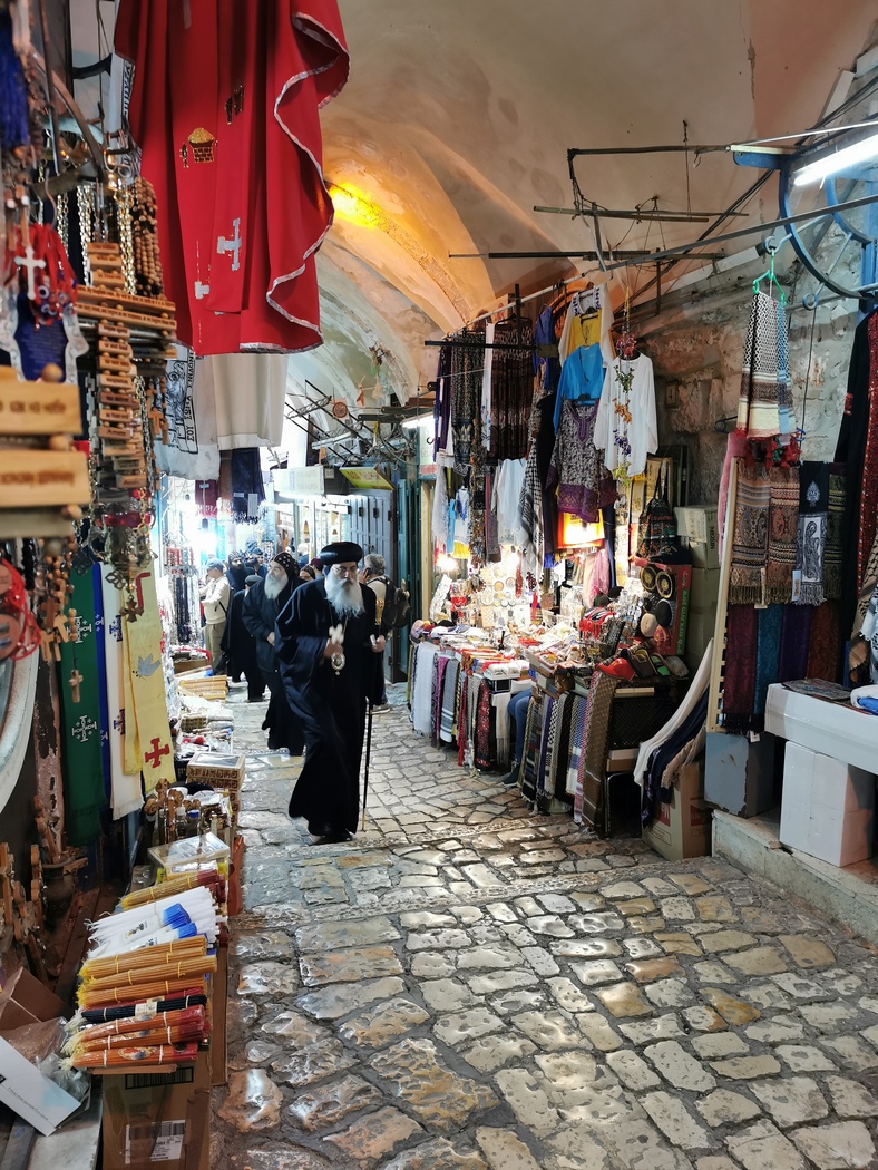Da wir mitten in der Altstadt waren, waren alle touristischen Highlights nicht weit entfernt, trotzdem liefen wir uns in den nächsten Tagen die Fersen wund, da es einfach so viel zu entdecken gab, in dem Gewirr aus engen Gassen. Die bedeutungsschwangere Luft droht einen an jeder Ecke zu erdrücken. Die in unserer Augen ausgefallene Kleidung der orthodoxen oder ultra-orthodoxen Juden; die Massen an christlichen Besuchern, die über Steinen, die Jesus berührt haben soll, in Tränen aufgelöst zusammenbrachen; jüdische Besucher, die einen Reigen tanzten und herbeieilende Soldaten, sich einreihten, klatschten und sangen; grimmig blickende orthodoxe Christen, die turibulumschwingend und monoton trommelnd eine Prozession veranstalteten; Chöre, die in Kirchen spontan und voller Erleuchtung anfingen zu singen; zum Gebet eilende Muslime, wenn der Ruf des Muezzin aus der Al-Aqsa ertönte; Soldaten, die Taschen durchsuchten und Leute mal passieren, mal nicht passieren ließen, das Sturmgewehr wie eine etwas zu schwer geratene Handtasche lässig über die Schulter geworfen.