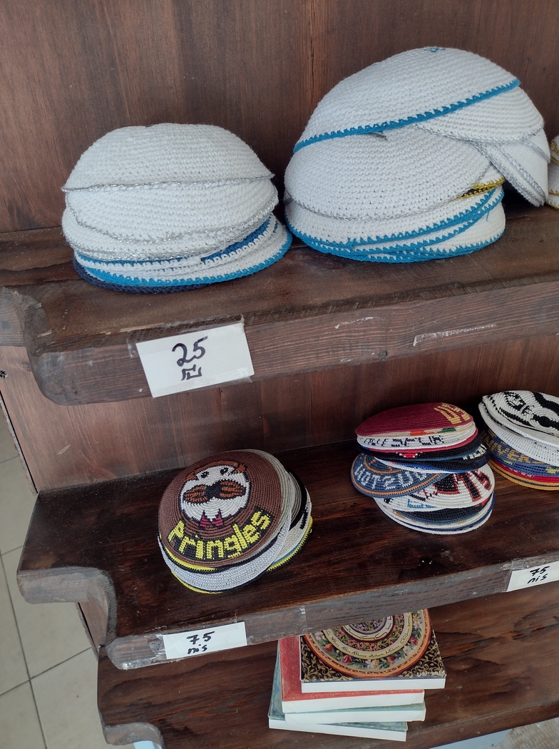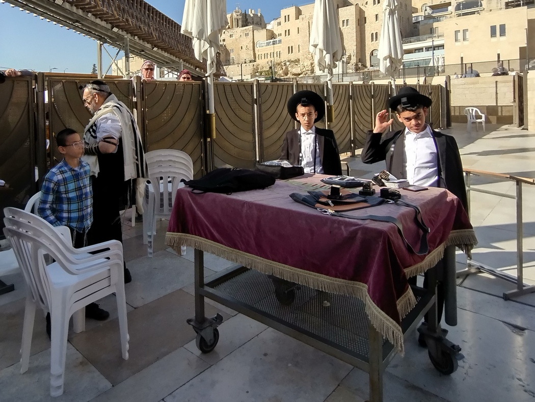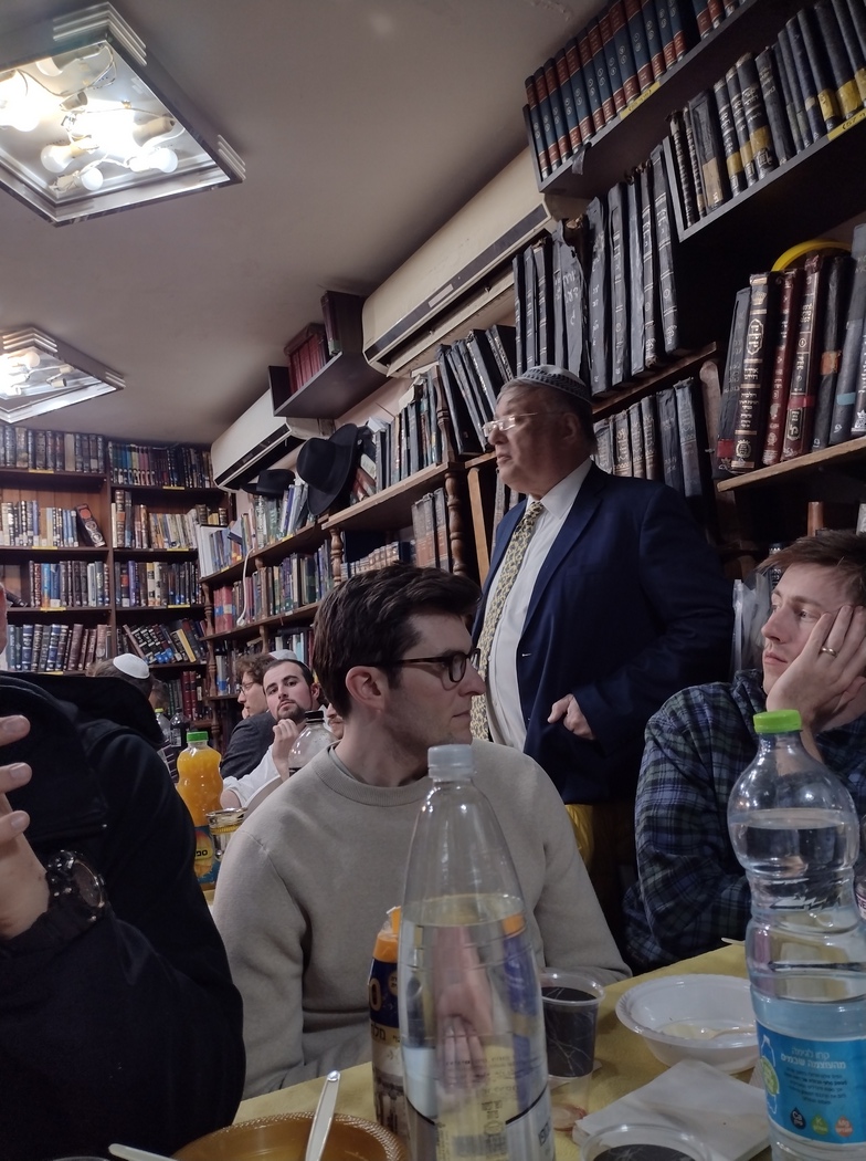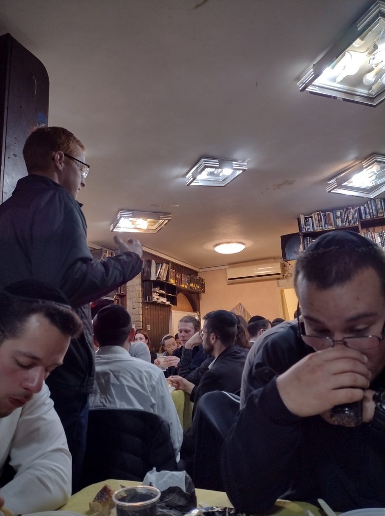 Der Raum konnte die etwa 150 anwesenden, überwiegend orthodoxen Juden, kaum fassen, sodass wir dichtgedrängt an den Tischen zu jeweils rund 10 Personen saßen, allerdings regelmäßig aufstehen mussten, um Neuankömmlige passieren zu lassen oder die über die Köpfe hinweg gereichten Speisen weiter zu reichen. Die beiden neben Tilmann sitzenden Brüder waren in Aachen geboren und lebten für ihre Thora-Studien nun für einige Jahre in Jerusalem. Neben Hebräisch sprachen sie Englisch, Niederländisch, Französisch und Deutsch. Es wurden Vorträge gehalten, gemeinsam gesungen und dabei auf den Tischen getrommelt und vor allem, weitestgehend auf Etikette verzichtend, gemeinsam ausgiebig gespeist. Insgesamt wurden etwa sieben Gänge gereicht und nach jedem zweiten wurde die gesamte Gemengelage aus Plastik-Geschirr und Speiseresten in gigantischen hin- und hergereichten schwarzen Müllsäcken versenkt. Da diese Säcke auch über Köpfe wanderten, machte sich Tilmann ein ums andere Mal Sorgen um deren Dichtheit, da die Speisereste natürlich durchaus auch flüssige Bestandteile enthielten. Es ging aber alles gut, auch konnten alle Tabletts mit den frischen Köstlichkeiten aus der Küche ohne Absturz über die Köpfe balanciert werden. Ein solches Event hatte aufgrund seines eindeutigen Praise-the-lord-Bezugs irgendwie auch etwas sektenhaftes, aber es war ohne Frage eine sehr angenehme neue Erfahrungen mit interessierten und freundlichen Menschen.