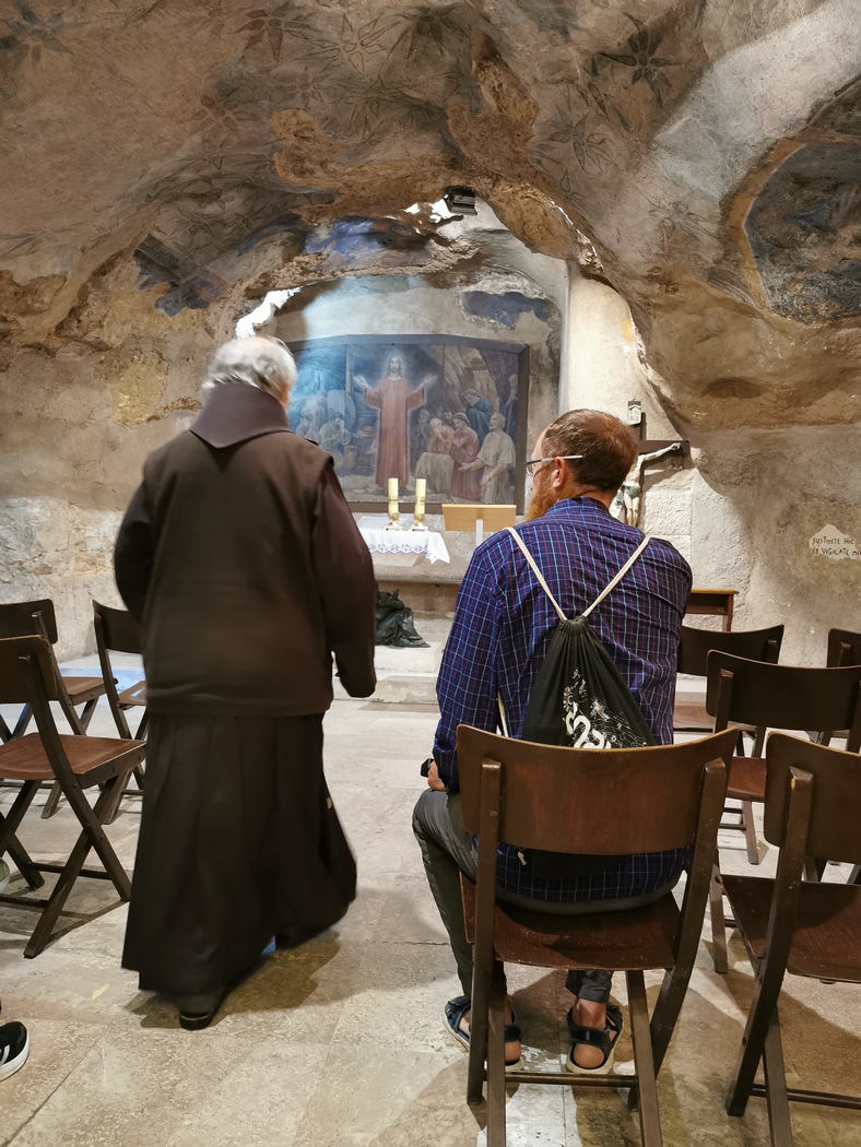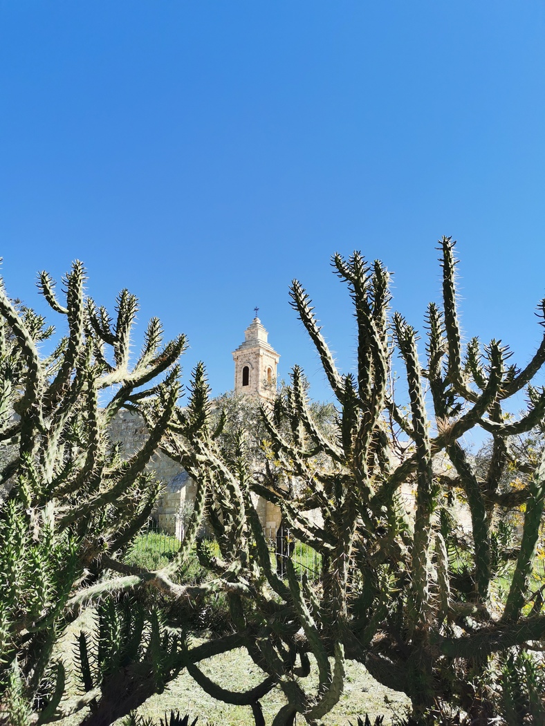 Von Steinwürfen blieben wir verschont und als wir gerade bereit waren aufzubrechen, betrat eine Gruppe erleuchteter Pilger-Touristen die Arena und im Handumdrehen waren wir umringt von ihnen und wohnten dem Gottesdienst bei, der spontan im Klosterhof abgehalten wurde. Der Portal-Wächter schenkte uns noch ein kleines Tütchen mit getrocknetem Basilikum zum Abschied und wir nahmen den steilen Berg in Richtung Bethlehem in Angriff.