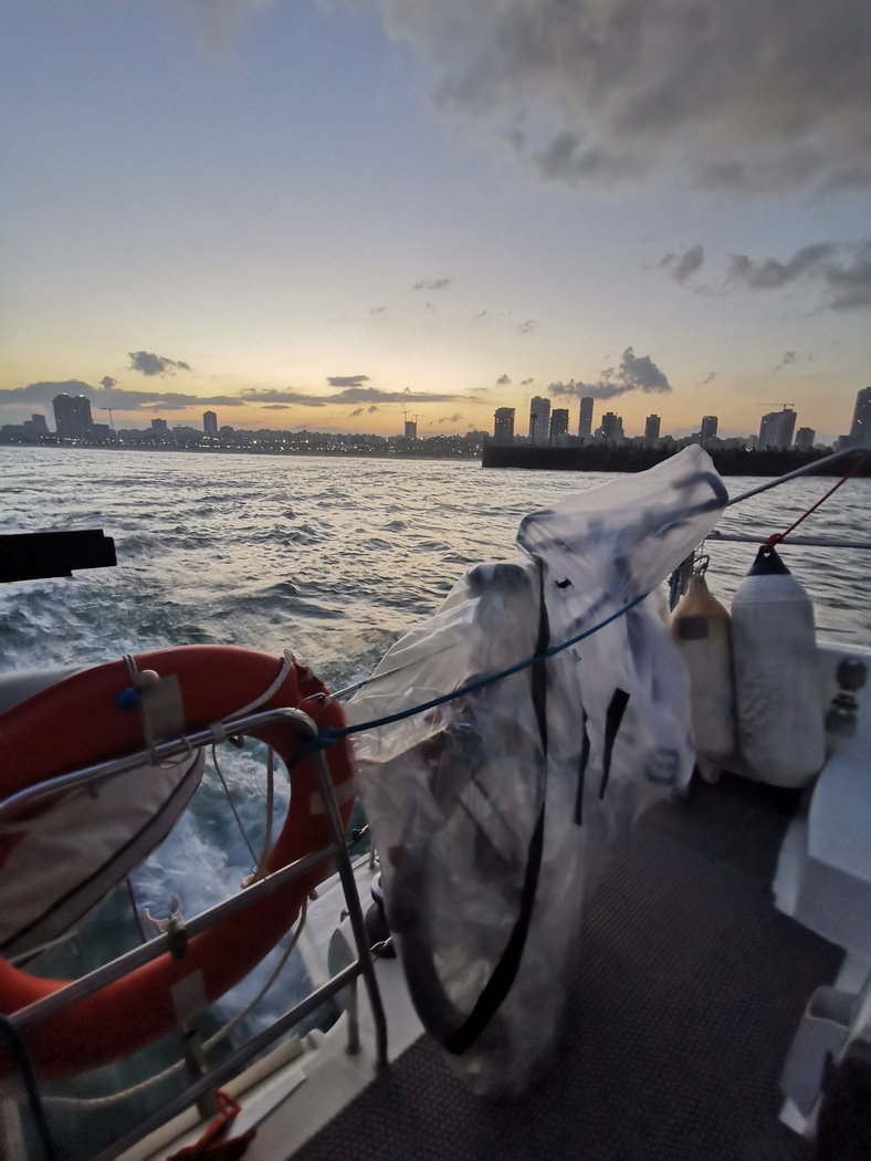 Um kurz vor sechs wurden die Maschinen mit leichter Verspätung gestartet und wir nahmen nun zunächst Kurs auf das noch weiter südlich gelegene Aschkelon, wo das Ausreiseprozedere abgehalten werden sollte. Sobald wir das ruhige Gewässer der Marina verlassen hatten, nahm der Wellengang mächtig zu und Tilmann stellte schnell fest, dass ihm das nicht besonders behagte. Vorsichtshalber blieb er zunächst liegen. Julia wagte sich kurz nach draußen, doch als sie sich einen Kaffee zubereiten wollte und dabei kaum die Füße auf dem Boden des Schiffs halten konnte, beschloss sie sich auch nochmal in die Koje zu verkriechen.