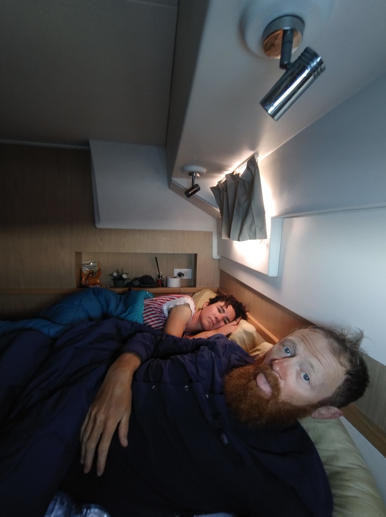 Das Boot sollte erst am nächsten Morgen in aller Herrgottsfrühe in See stechen und so gestattete uns Simon schon diese Nacht in unserer Kabine zu verbringen. Uns wurde zugesagt, dass wir den Katamaran über Nacht für uns hätten, was allerdings nur auf das schmale Zeitfenster zwischen zwei Uhr und 5 Uhr dreißig zutraf. Die Crew tüftelte bis spät in die Nacht biertrinkend, ketterauchend und russentechnohörend noch am Schiff herum.