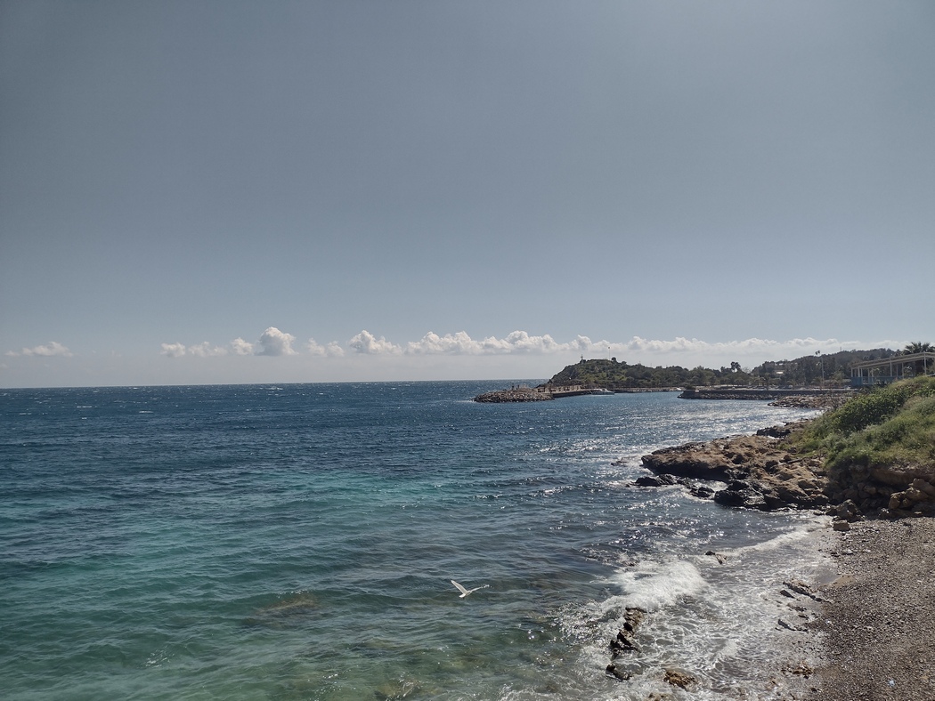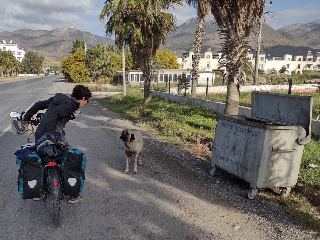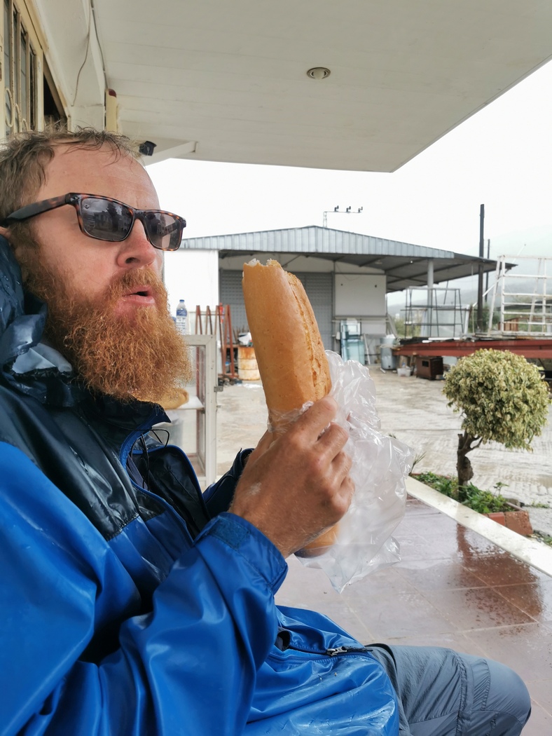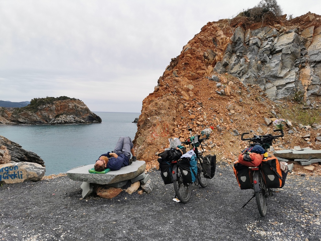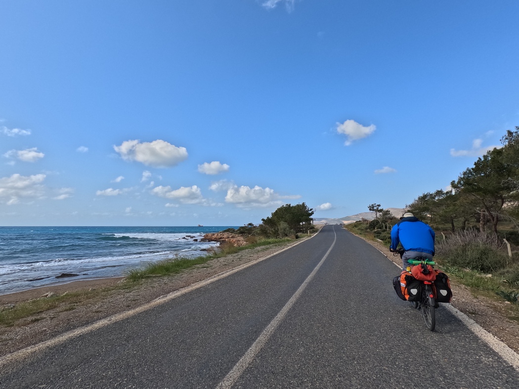 Auch am darauf folgenden Tag war der Gegenwind gnadenlos. Kurz nach der Abfahrt trafen wir an einem bewaldeten Strand einen Radreisenden, der die Nacht dort im Zelt verbracht und offenbar gut überstanden hatte. Wir stellten fest, dass wir wohl etwas verweichlicht seien und nahmen uns vor ab sofort nicht mehr schon bei der kleinsten witterungsbedingten Widrigkeit gleich in Hotel abzusteigen. Ja es windete uns kräftig entgegen und dennoch war die Küstenstraße und die Ausblicke, die sie beim ständigen Auf und Ab bot wunderschön. Es war jedoch der Wind der uns am Vorankommen hinderte, nicht etwa ständige Stopps, um den Blick schweifen zu lassen. Dieser war dann doch überwiegend auf die Straße vor uns fokussiert, wie man es halt macht wenn man sich durchbeißen muss. Nach einer längeren Abfahrt entdeckten wir in Aydıncık dann endlich den ersehnten ersten Cig Köfte Imbiss und stellten mit Beruhigung fest, dass der Preis für das Mega Rollo noch immer bei 20 Lira lag, sich mit dem Wertverlust der türkischen Währung für uns also vergünstigt hatte. Ja, die Lira ist offenbar nach wie vor im Fall begriffen und hat sich innerhalb des knappen Jahres von 16 auf 20 zu 1 verbilligt.