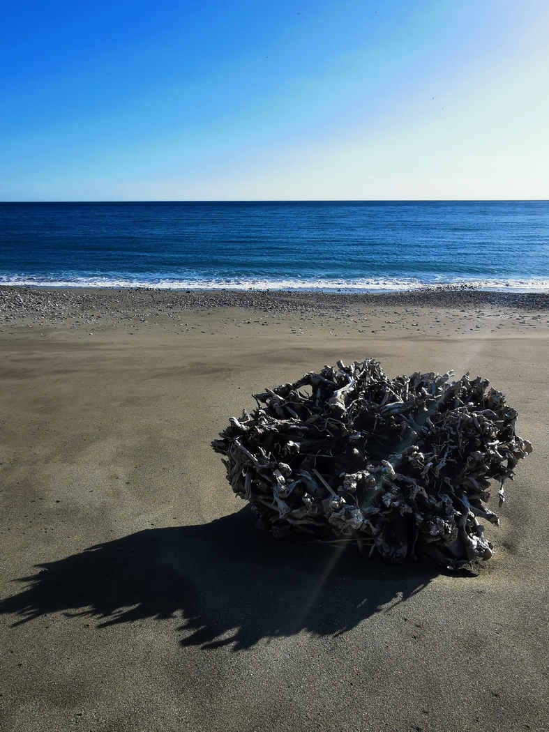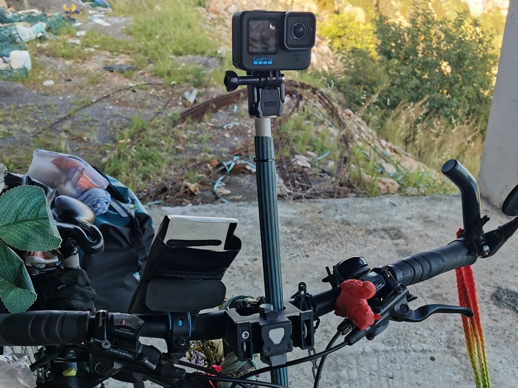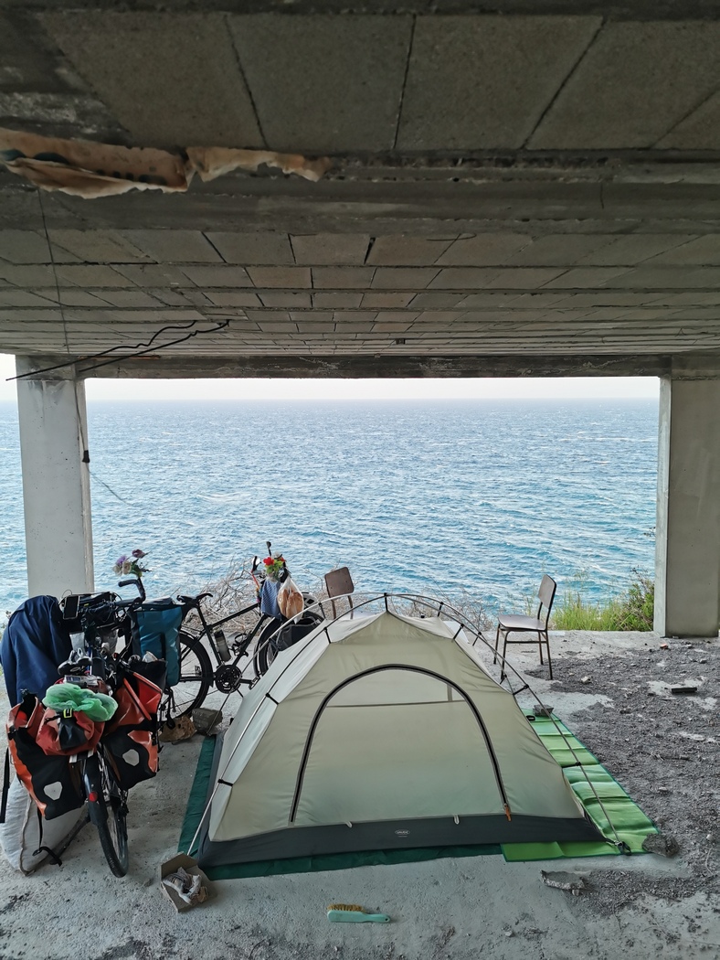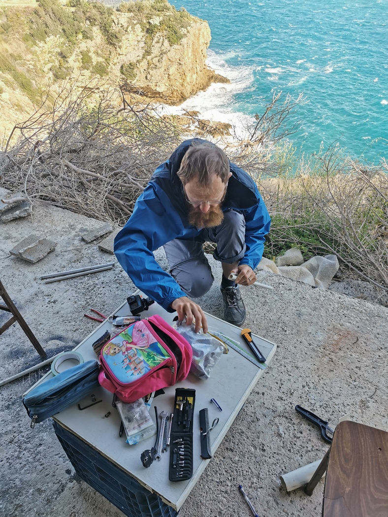 Trotz dieser Stärkung machten wir auch an diesem Tag wieder früher Schluss, als wir in einer traumhaft gelegenen Bauruine einen hübschen Wind- und Regenschutz ausgemacht hatten. Zwar war dieser Shelter direkt neben einer informellen Mülldeponie gelegen, war aber aufgrund ihrer Lage hoch über den Klippen mit Meerblick vermutlich dennoch einer unserer schönsten Zeltplätze überhaupt. Außerdem handelte es sich zum Glück um Elektro- und Plastikschrott, sodass eine olfaktorische Einwirkung daher immerhin nicht gegeben war. Hingegen konnten wir die dort zu findenden Dinge zum Upcycling nutzen und bastelten endlich eine Halterung für die GoPro an Julias Lenker, eine Verlängerung des Frontscheinwerfer-Halters (wie damals bei auf der Farm an Tilmanns Fahrrad aus einer alten Zahnbürste) und zudem bekam Julias Fahrrad endlich wieder eine Galionsfigur in Form eines Tierschädels.