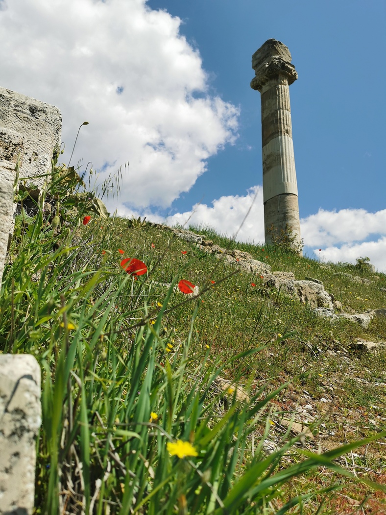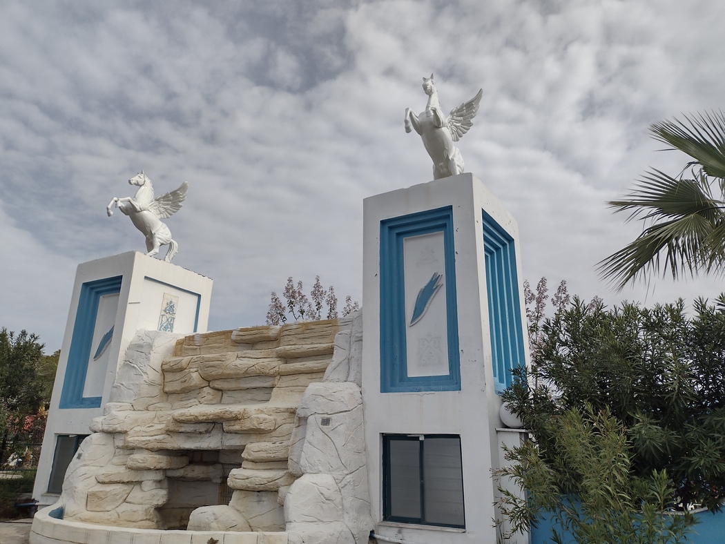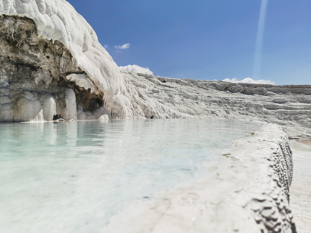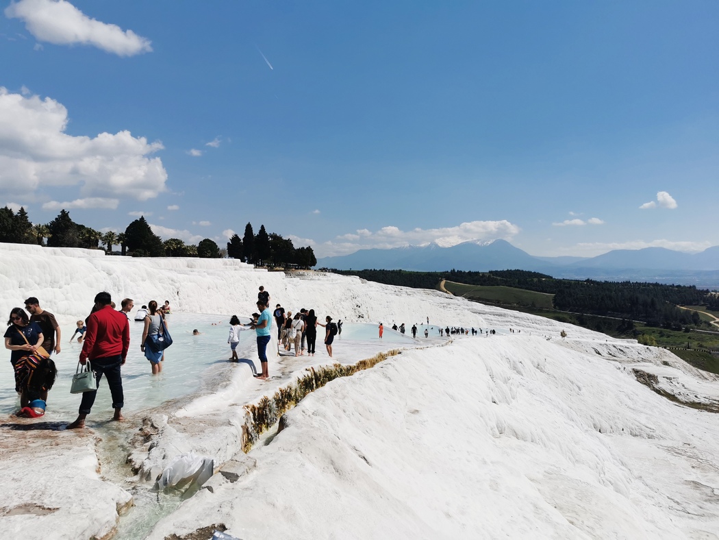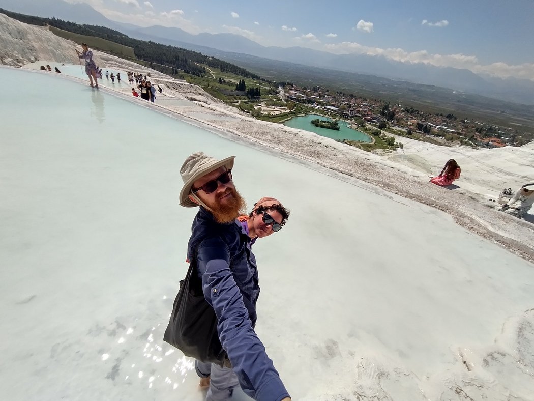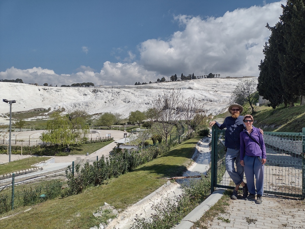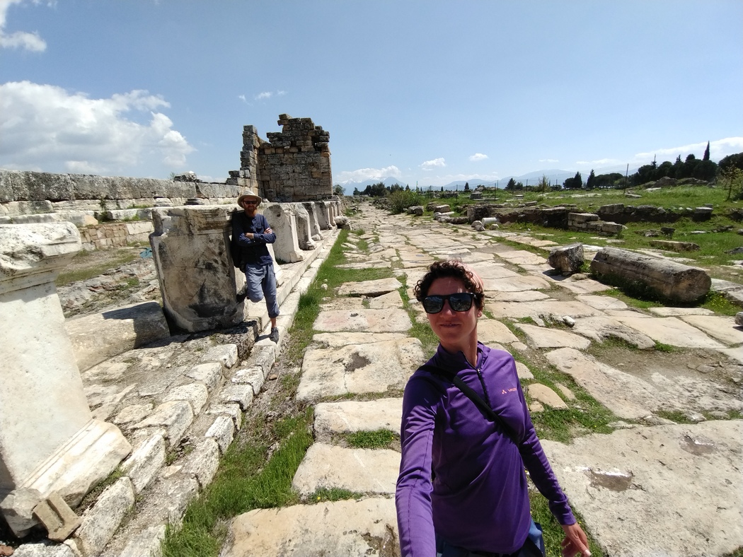 Unserem Vorsatz keinem Sightseeing nachzugehen genehmigten wir dann schließlich eine weitere Ausnahme. Wir wollten nun noch Pamukkale besuchen, wie bekannt eines der touristischen Top-Highlights der Türkei. Bis dort waren es von Denizli noch knapp 30 km. Leider muss man jedoch abschließend festhalten, dass wir unserem Vorsatz hätten treu bleiben sollen. Mal ganz davon abgesehen, dass der Eintritt zu den Kalksinterterassen und der Ausgrabungsstätte Hierapolis in den letzten Monaten einer ca. 300 %ige Preissteigerung erfahren hat (nun 400 Lira) und wir dabei auch noch einer unhöflich Falschinformation aufgesessen waren und noch mehr bezahlten (wir zahlten 500 Lira und damit den Eintritt zu einer weiteren historischen Stätte, an der wir schon vorbeigefahren waren) und die Terrassen von Touristenmassen bevölkert sind, ist der Ort keineswegs so atemberaubend, wie erwartet. Er ist aber auch wohl nur noch ein Schatten seiner selbst, denn die größten Teile der mit der annähernd schneeweißen Kalkschicht überzogenen Felsen werden nicht mehr mit Wasser überströmt, wachsen also nicht mehr und grauen langsam ein.