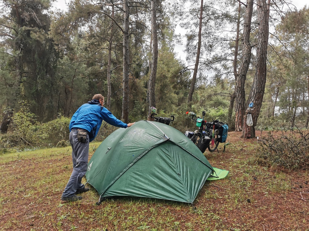 Nachts kam dann eine Katze auf die Idee die neue Struktur in ihrer Hood mit ausgefahrenen Krallen zu erkunden, weshalb wir uns am nächsten Morgen erst einmal mit Außenzelt-Instandsetzungsmaßnahmen beschäftigen mussten. Auch sonst hieß uns die Türkei zunächst nicht wirklich willkommen. Der Wind hatte sich nämlich keines Wegs gelegt sondern blies uns nun mit voller Wucht entgegen, so dass wir auf der Küstenstraße kaum vorwärts kamen.