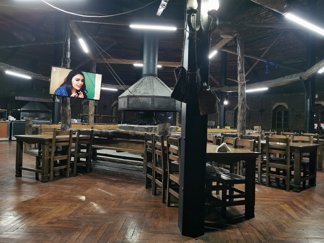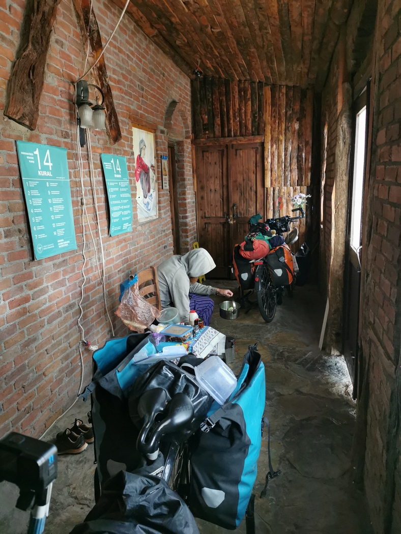 Nach fast 100 km wählten wir deshalb den Vorraum der Örtlichkeiten eines verlassen wirkenden rustikalen Ausflugslokals als Nachtlager. Klingt etwas uncharmant, ist aber besser, als bei unter 0 Grad und Feuchtigkeit draußen zu zelten. Allerdings kam dann doch noch der Nachtwächter, der uns ebenfalls mitteilte, dass das Restaurant morgen früh wieder geöffnet würde, wir durften aber trotzdem bleiben. Er lud uns schließlich noch zu Cay in dem gigantischen geheizten Speisesaal ein, wo er sich über Nacht aufhielt und schlug uns auch vor dort auf der Couch zu schlafen. Da der Fernseher dröhnte, die Halle taghell erleuchtet war und er selbst dort eben nicht zu schlafen sondern zu wachen gedachte, lehnten wir dankend ab.