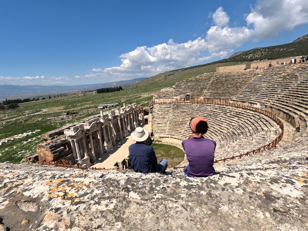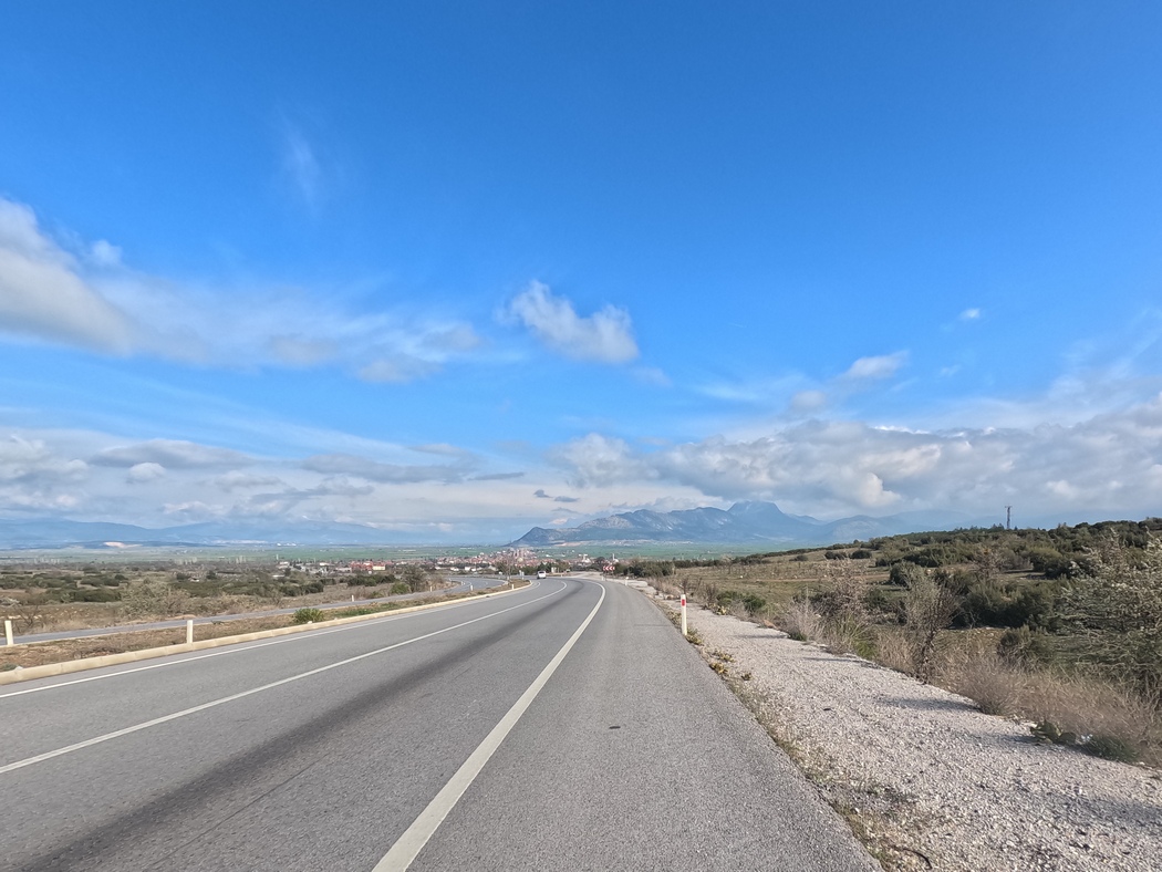 Vielleicht sind wir aber auch nach einem Jahr reisen derart abgestumpft, dass uns weiße Hängen mit blauen Wasserbecken vor schneebedeckten Gipfeln neben gut erhaltenen 2.000 Jahre alten Amphitheatern nicht mehr beeindrucken können. Bei unserer Ankunft hatte uns der Wirt eines nahe gelegenen Restaurants versichert auf unsere Räder aufzupassen und uns Flyer von seinem Etablissement überreicht, die einen 10 prozentigen Preisnachlass versprachen und uns als kostenlose Karten der zu besichtigenden Anlagen untergejubelt wurden (tatsächlich war eine grob verpixelter und nicht maßstabsgetreue Übersichtsskizze auf die Rückseite gedruckt.) Bei unserer Abfahrt (wir waren gerade noch richtig in Wallung, da unsere Bitte uns das irrtümlich zu viel gezahlte Eintrittsgeld zurückzuerstatten nicht nachgegangen wurde) rief er uns zu, dass wir doch nicht weiter fahren könnten ohne etwas zu essen. Tilmann rief ihm zurück zu, dass wir gerne noch bei ihm eingekehrt wären, aber der horrende Eintrittspreis unser Tagesbudget bereits gesprengt hätte. Er stimmte uns kleinlaut zu und wünschte uns eine gute Weiterfahrt. Wir sprangen also wieder aufs Rad und freuten uns über den Sonnenschein während wir dachten: „Das haben wir nun davon, dass wir ein weiteres mal unseren Vorsatz gebrochen hatten und uns auf Sightseeing eingelassen hatten!“ Wir traten für den Rest des Tages noch kräftig in die Pedale und nahmen uns vor jetzt aber wirklich einfach appi dappi Vollgas! zu geben und jede weitere etwaige touristische Ablenkung links oder rechts liegen zu lassen.