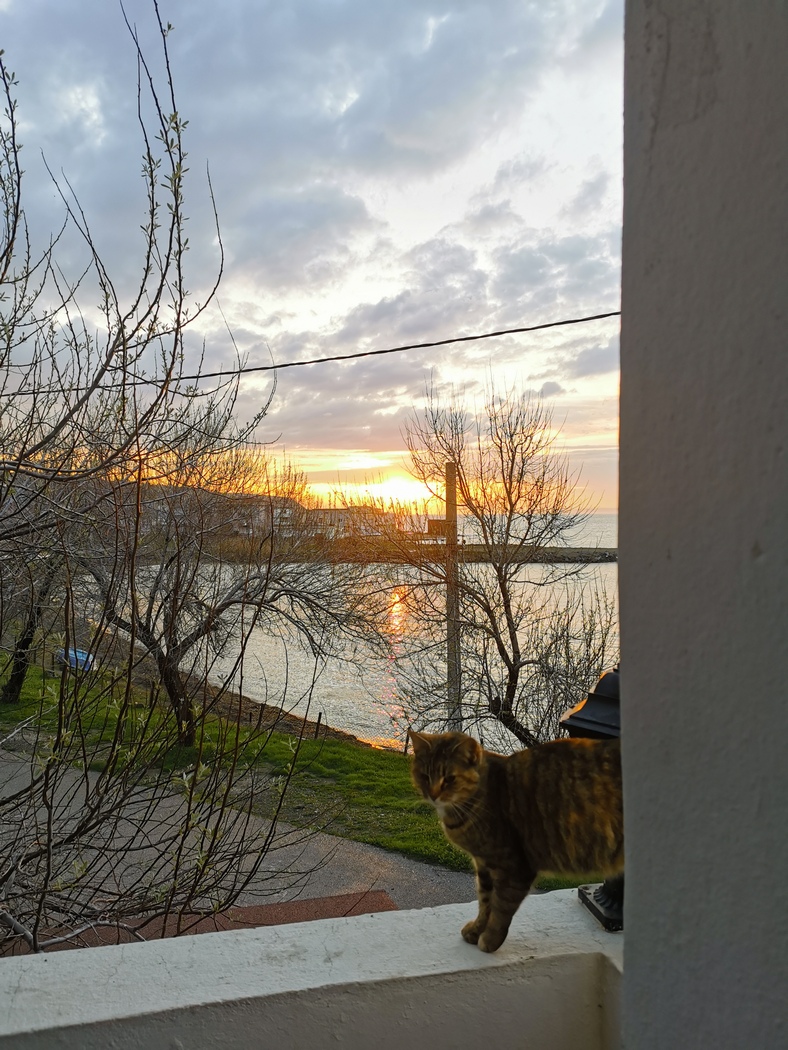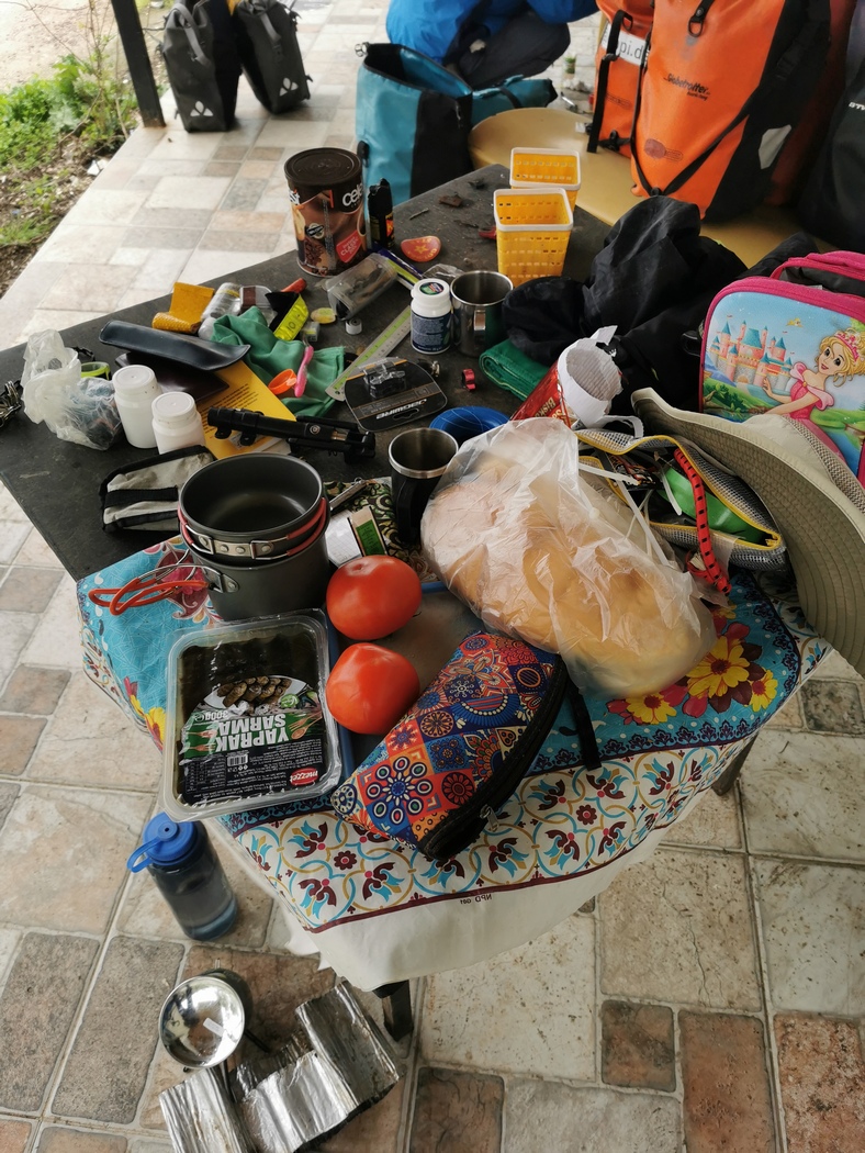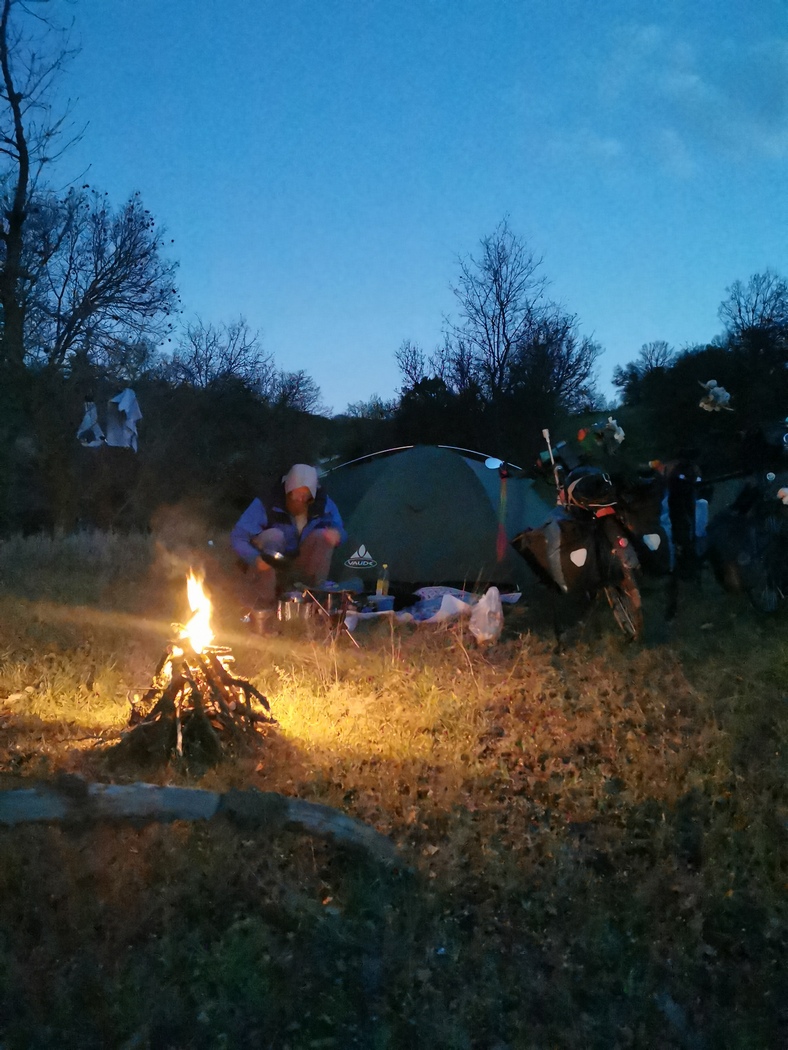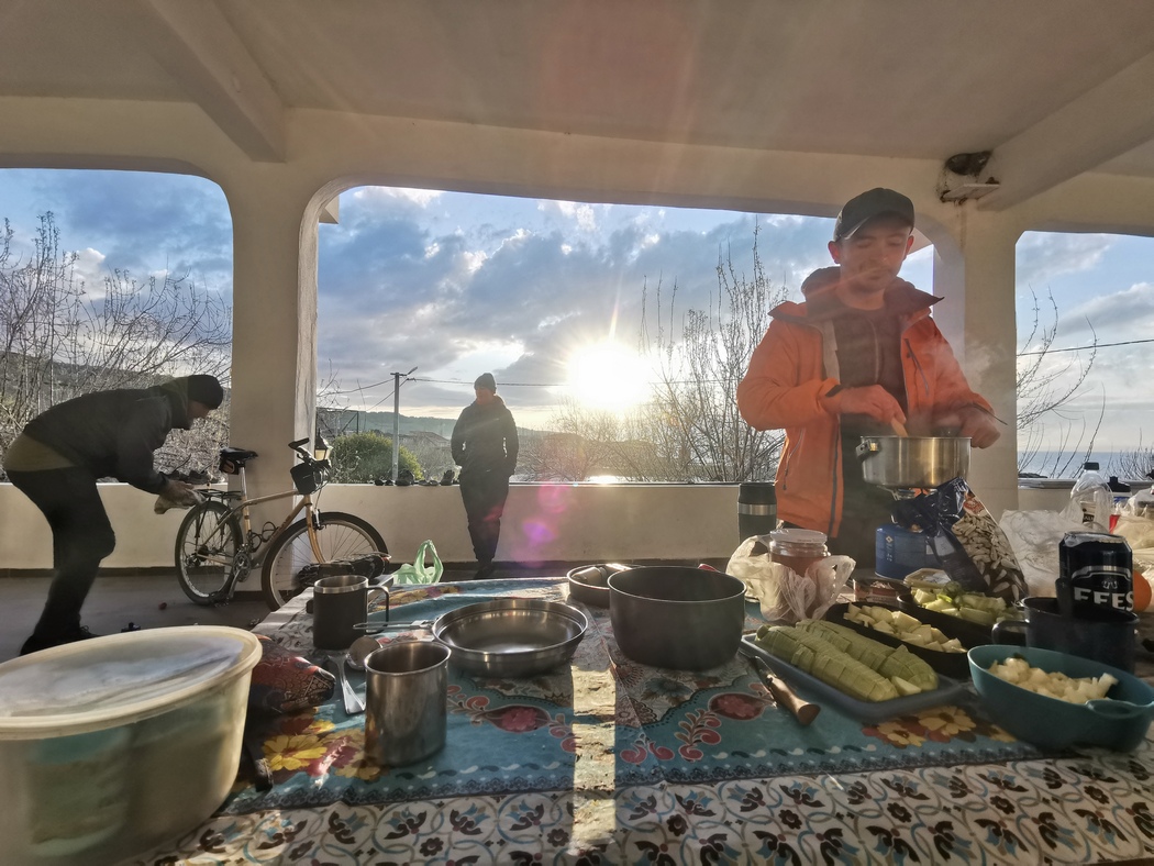 Während wir auf die drei warteten verspürten wir aufgrund der uncharmanten Außenbedingungen mehrmals den Drang die Verabredung in den um uns tosenden Wind zu blasen und weiter zu fahren, was wir aber glücklicherweise nicht taten. Denn wie nicht anders zu erwarten, lohnte sich das Wiedersehen mit den beiden und auch mit David verstanden wir uns ausgezeichnet und freuten uns über sein Engagement in der Campingküche. Gegen Abend wärmten uns dann doch noch die Sonne, deren Untergang wir gemeinsam mit einer Dose Efes genossen. Sogar Strom konnten wir in dem stillgelegten Etablissement stibitzen, dass wir nicht ganz für uns alleine hatten. Einige Locals kamen vorbei, blieben aber unaufdringlich im Gegensatz zu ein paar hungrigen Hunden. Julia (vom Team Bike and Free) hatte extra Hundefutter besorgt für die vielen armen Streuner im Land. Einer der uns auf unserer Terrasse besuchte konnte dies aber nur unter markerschütterndem Jaulen verschlingen, obwohl er keine sichtbaren Verletzungen hatte. Offenbar hatte er schon Schlimmes erlebt im Leben.